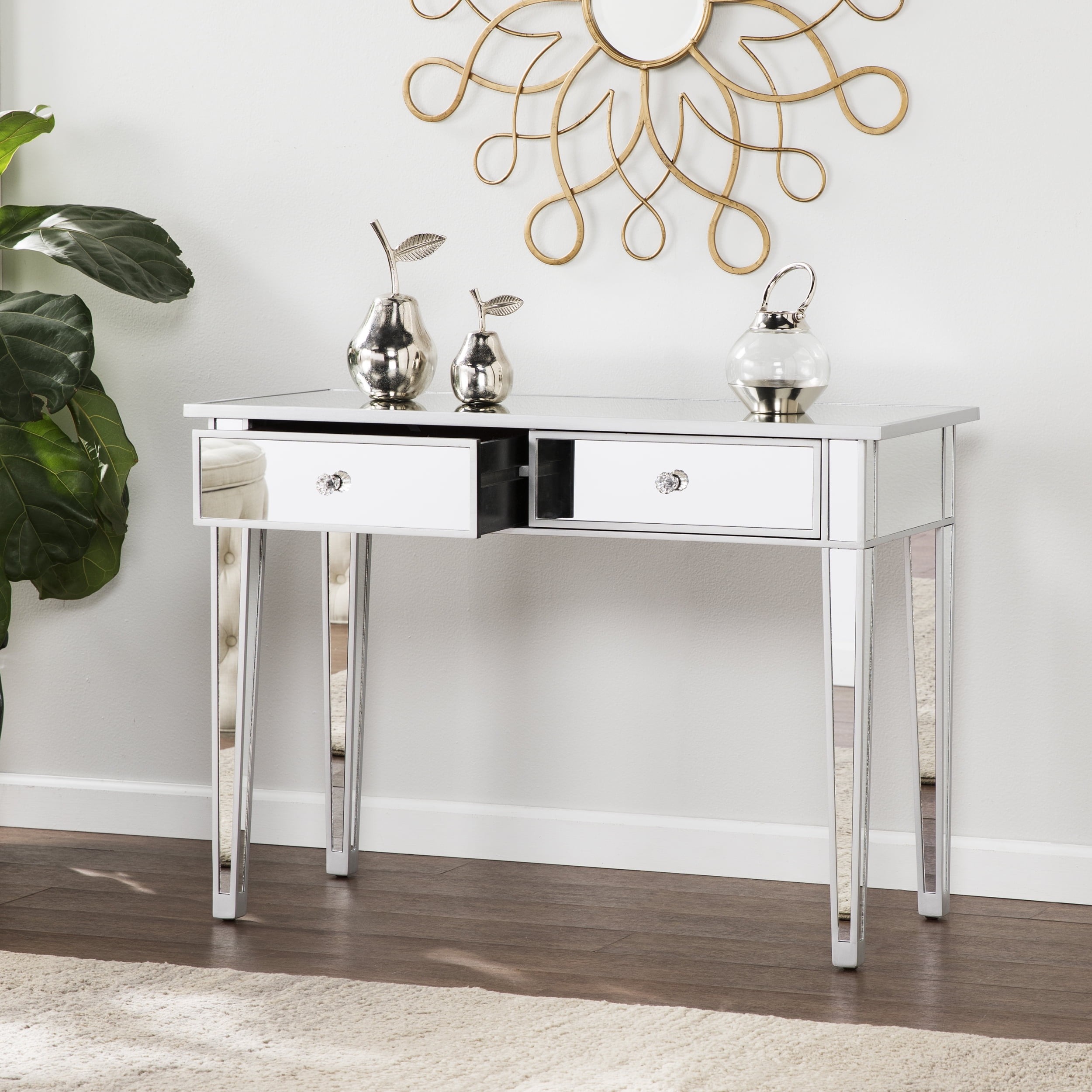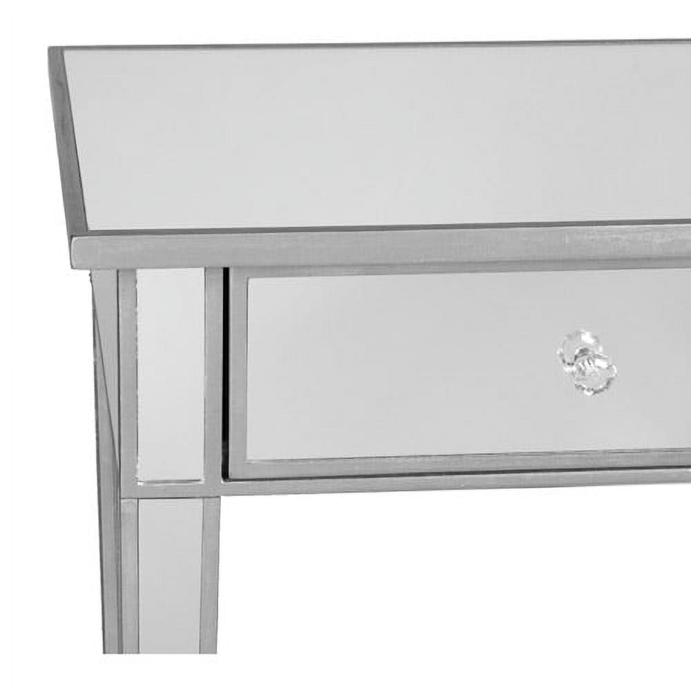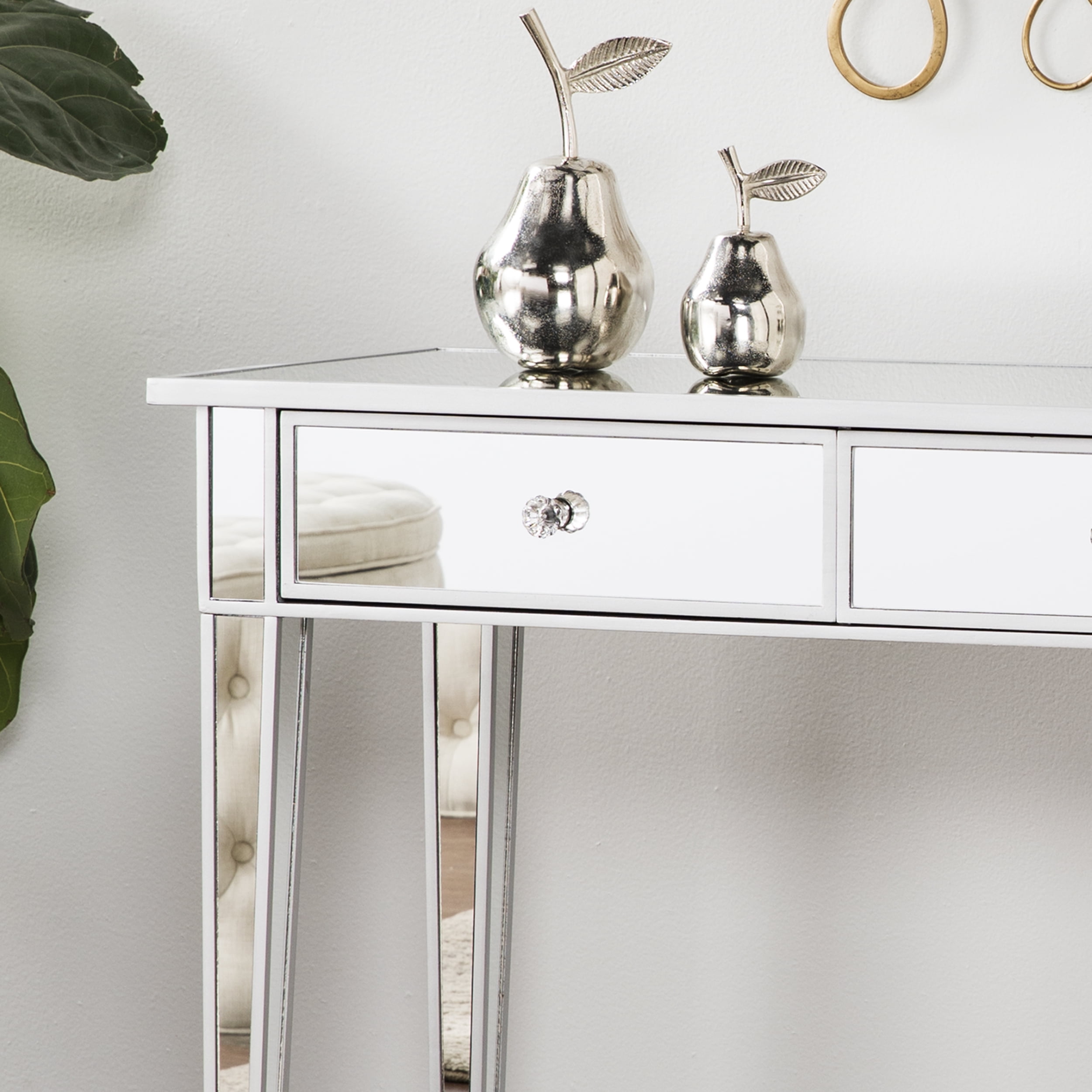 Charming sofa table is a great addition to any room in the house for additional storage space Ideal for behind your sofa, hallways, and entryways to display your home decor Features spacious tabletop and 2 drawers to display decorative pieces and store knick-knacks Matte silver finish with faux crystal knobs adds style and character to any room Features shimmering mirror reflection to offer an upgraded, glam style Color: Silver Dimensions (L x W x H): 17.75 x 39.5 x 28.5 inches