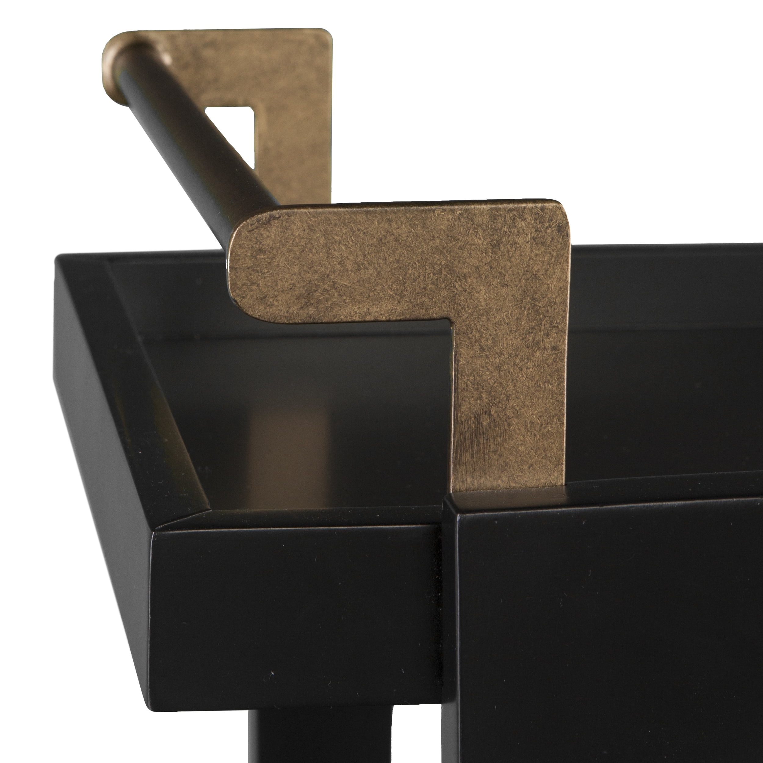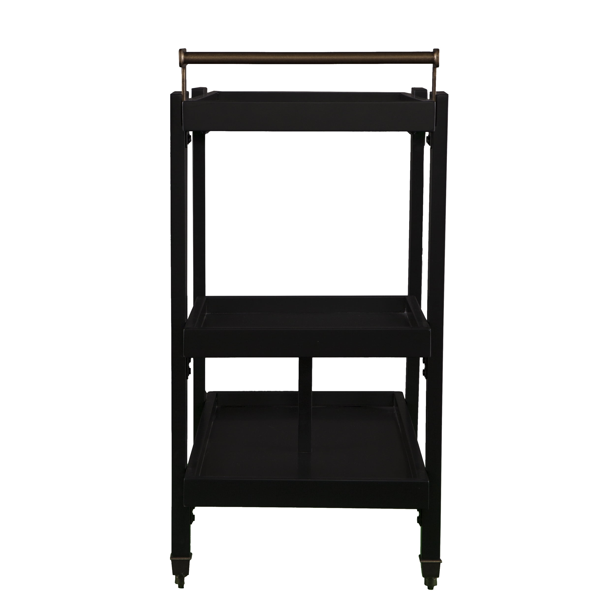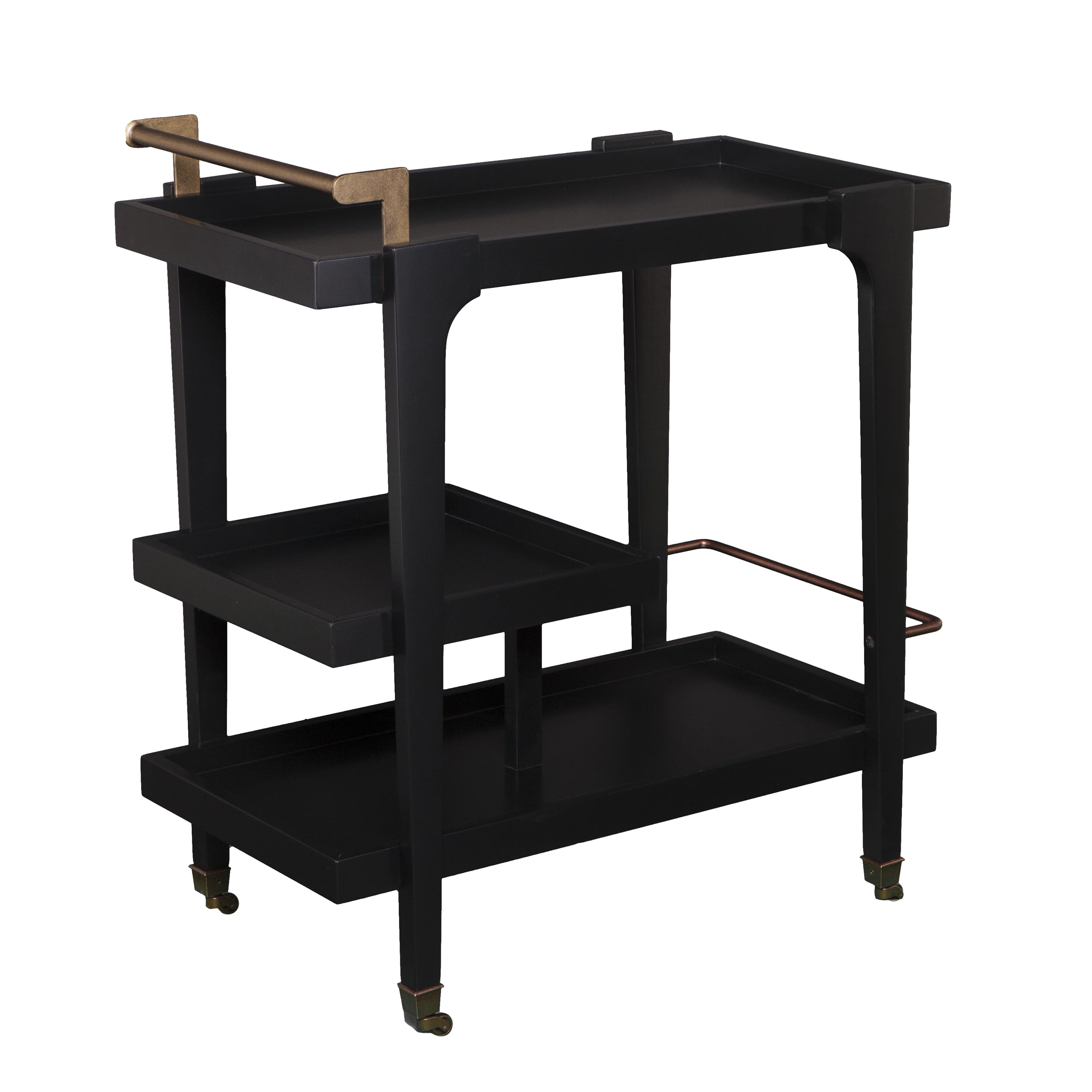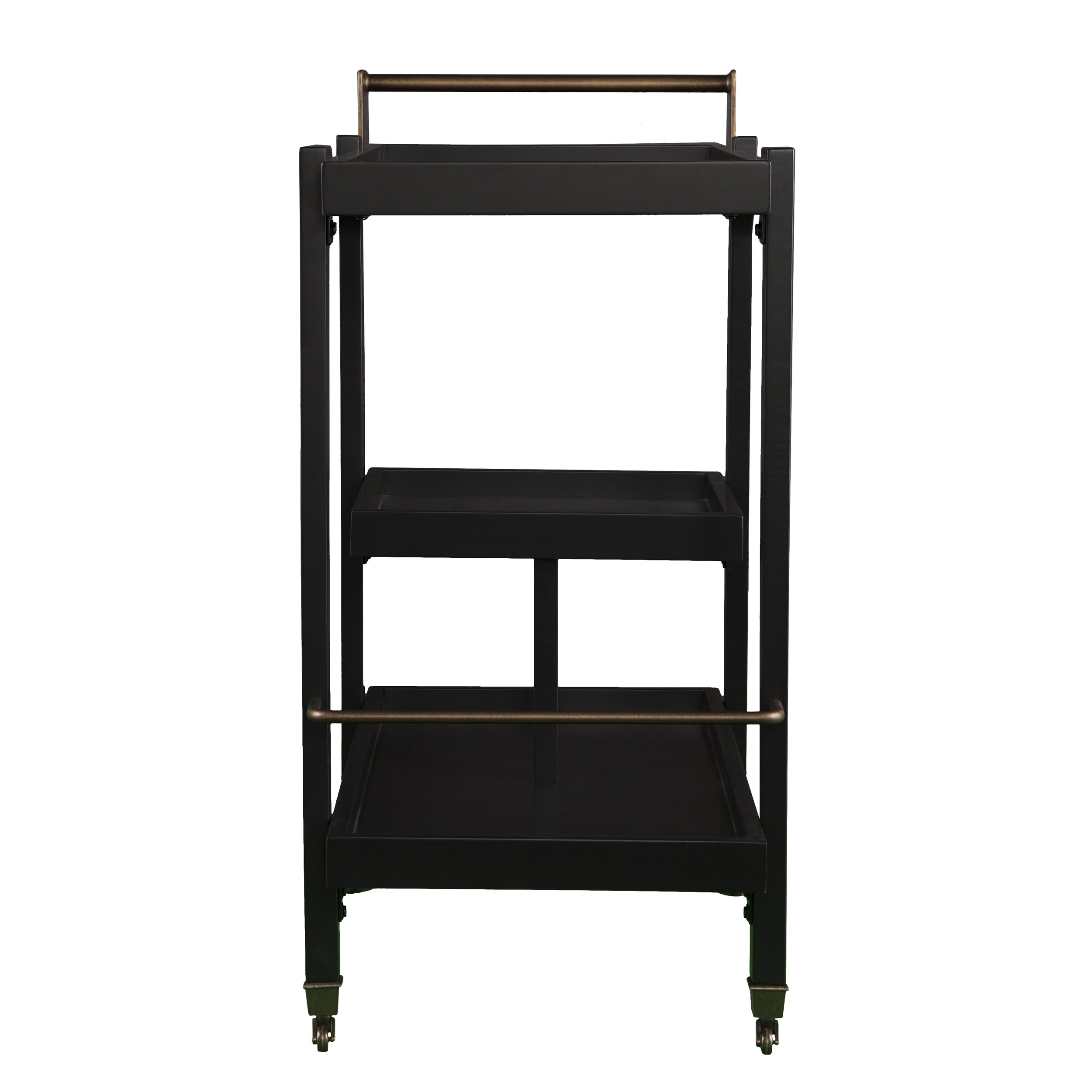 3-tier bar/serving cart Bottom shelf has guardrail to protect bottles 2 locking casters Dining room kitchen or open concept living space Midcentury modern style Black w/ aged brass Overall:33″ W x 18″ D x 37″ H Assembly:RequiredShelves Handle:3.5″ W x 16.5″ D x 3.5″ H Guardrails:1/4″ H (top/bottom)