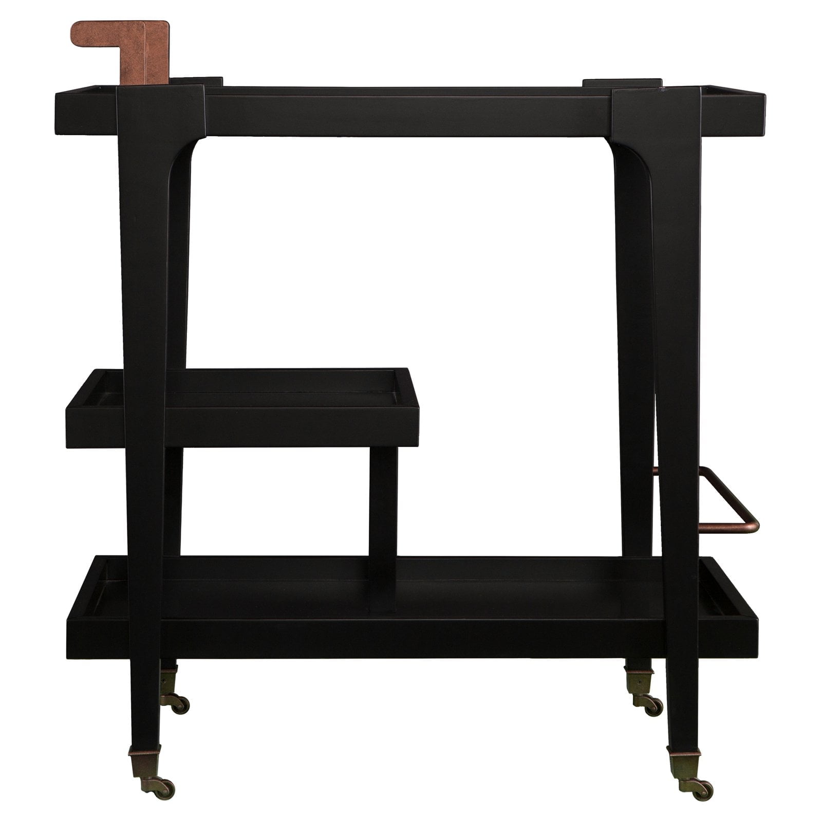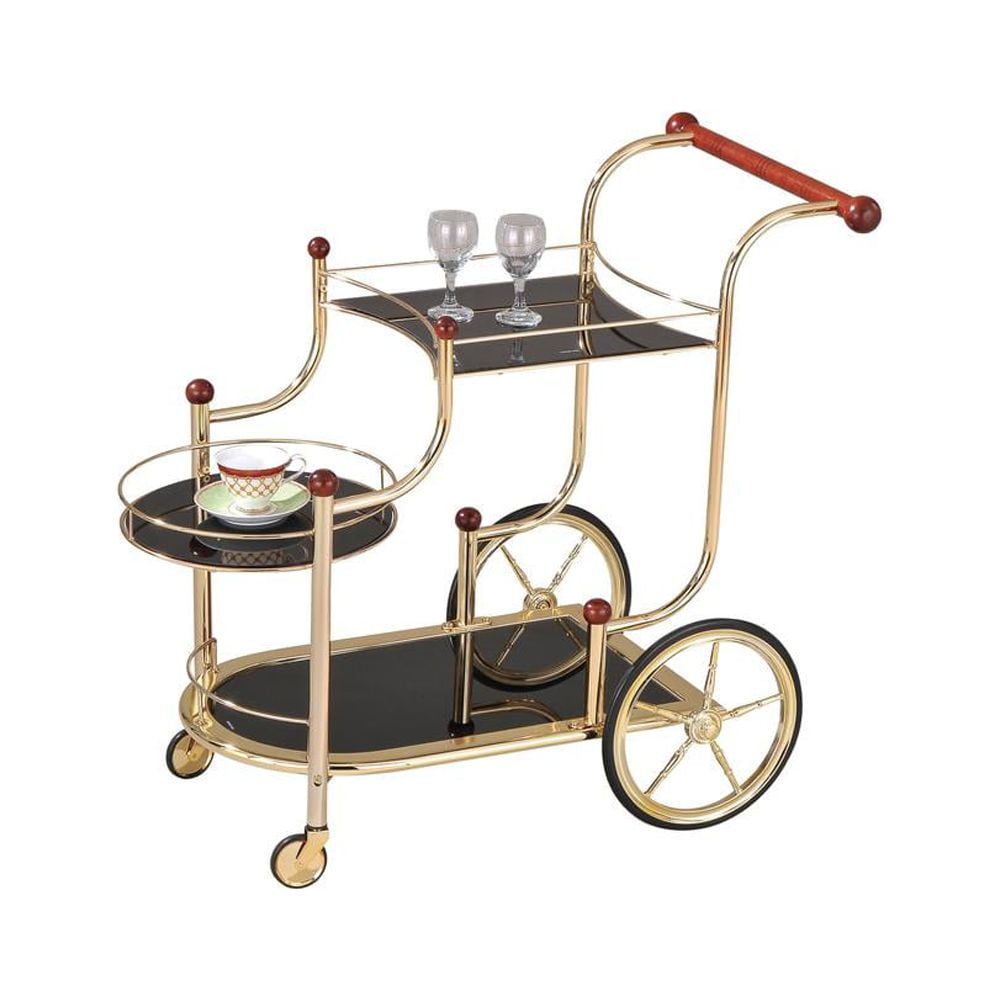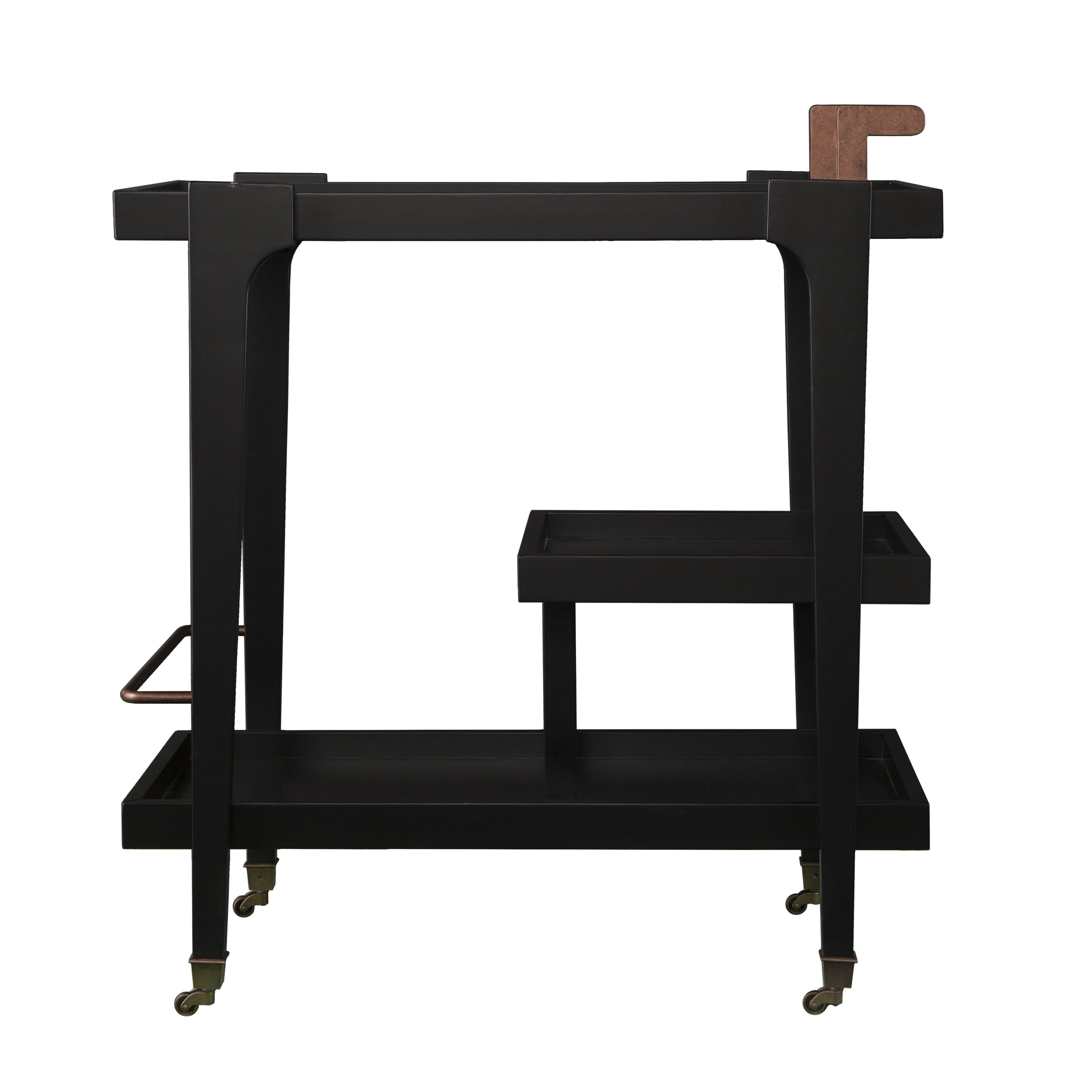 3-tier bar/serving cart Bottom shelf has guardrail to protect bottles 2 locking casters Dining room kitchen or open concept living space Midcentury modern style Black w/ aged brass Overall:33″ W x 18″ D x 37″ H Assembly:RequiredShelves Handle:3.5″ W x 16.5″ D x 3.5″ H Guardrails:1/4″ H (top/bottom)
