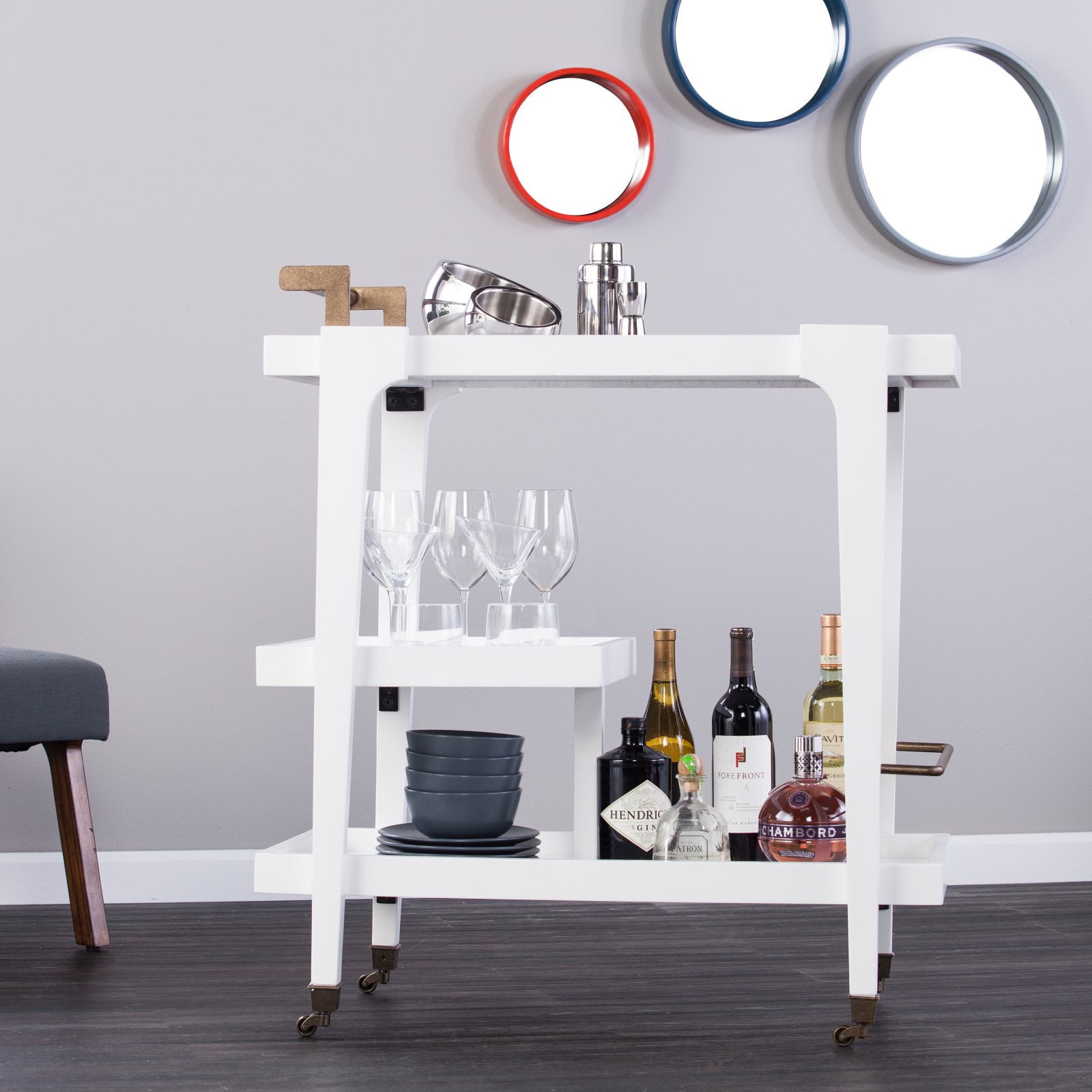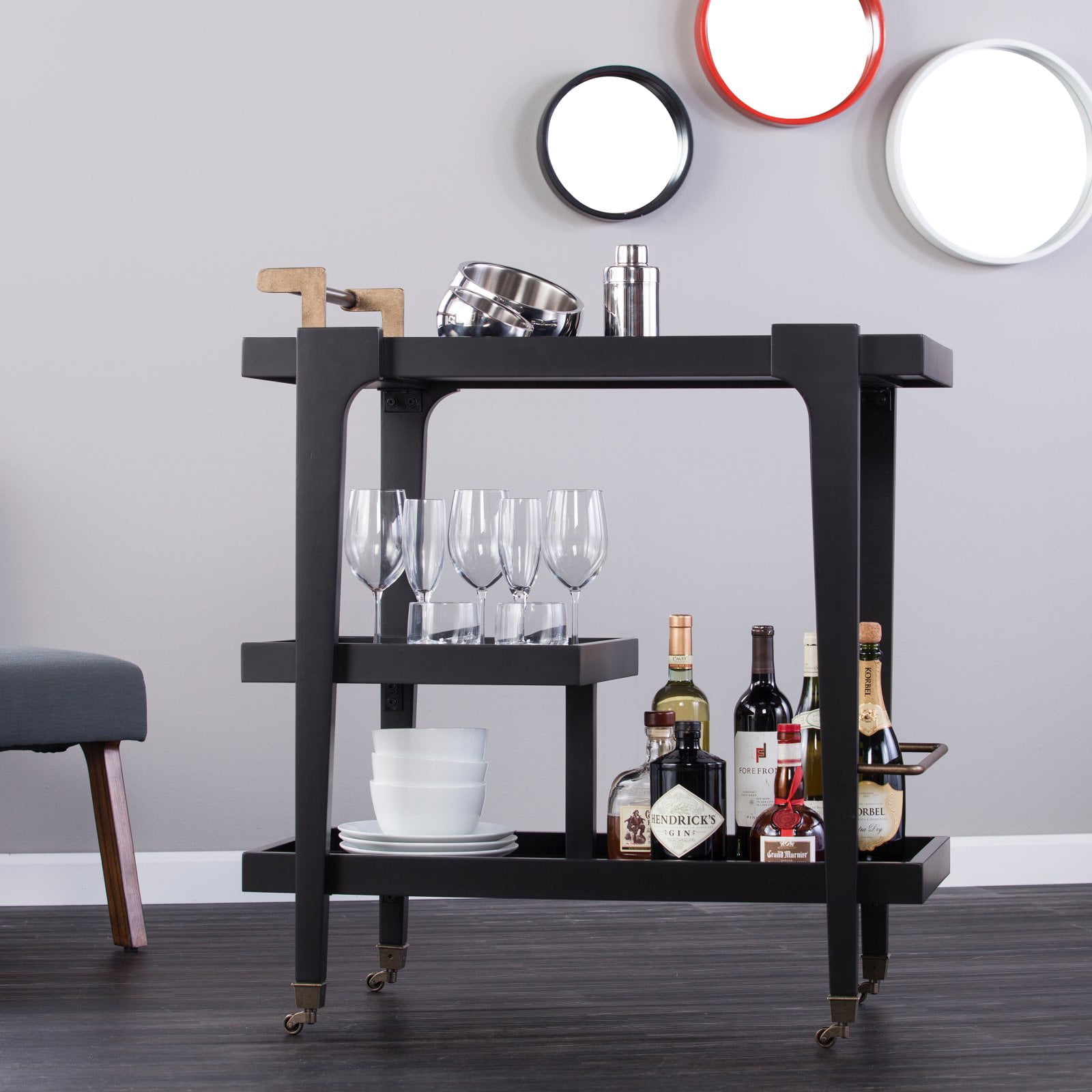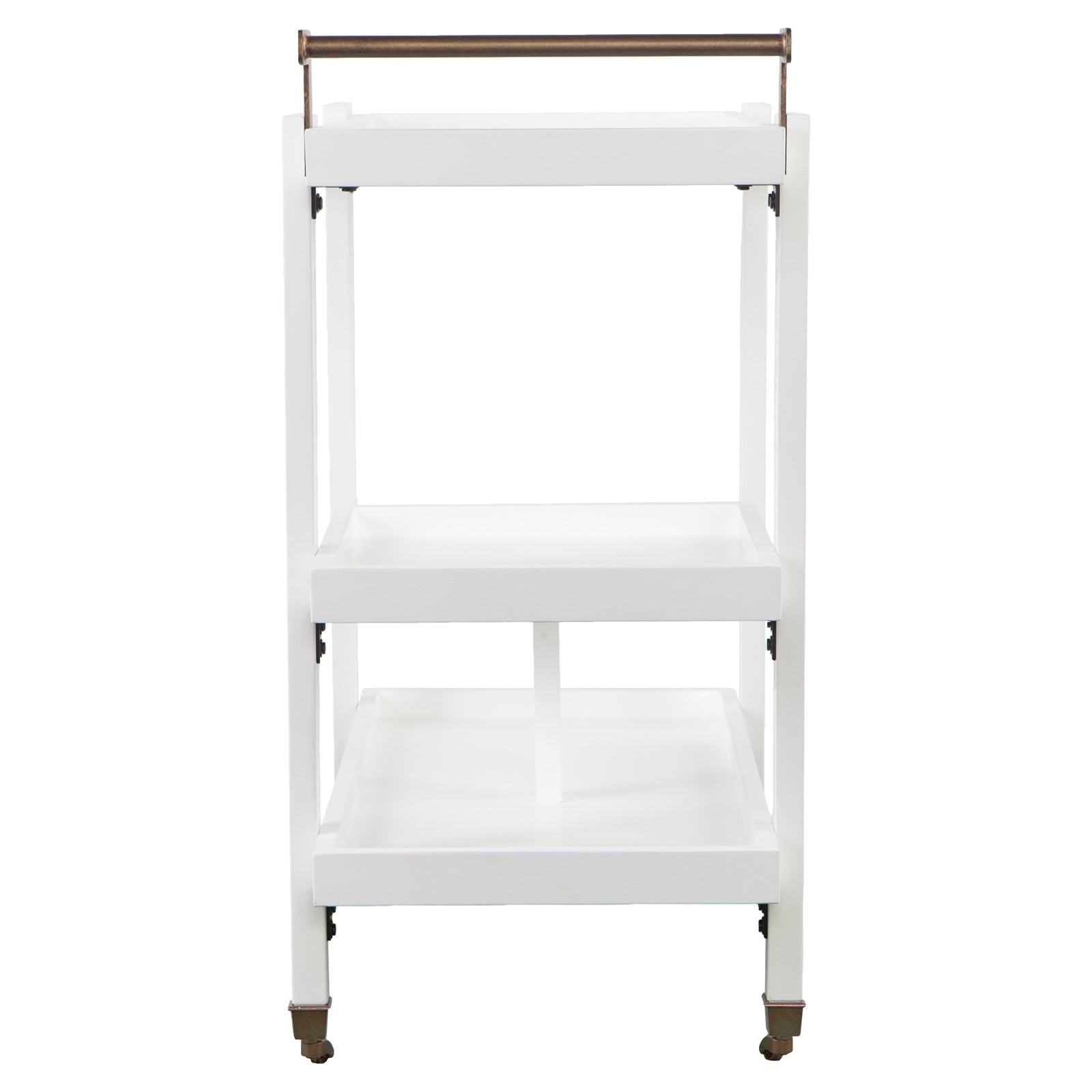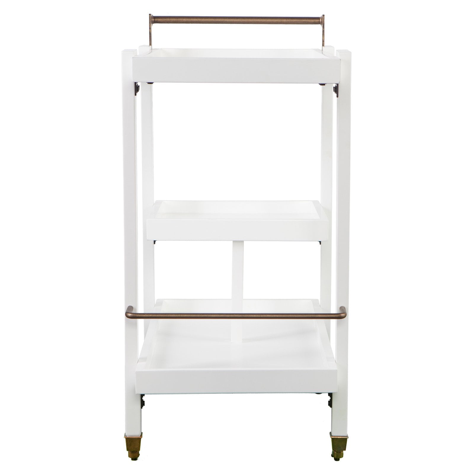3-tier bar/serving cart Bottom shelf has guardrail to protect bottles 2 locking casters Dining room kitchen or open concept living space Midcentury modern style Black w/ aged brass Overall:33″ W x 18″ D x 37″ H Assembly:RequiredShelves Handle:3.5″ W x 16.5″ D x 3.5″ H Guardrails:1/4″ H (top/bottom)