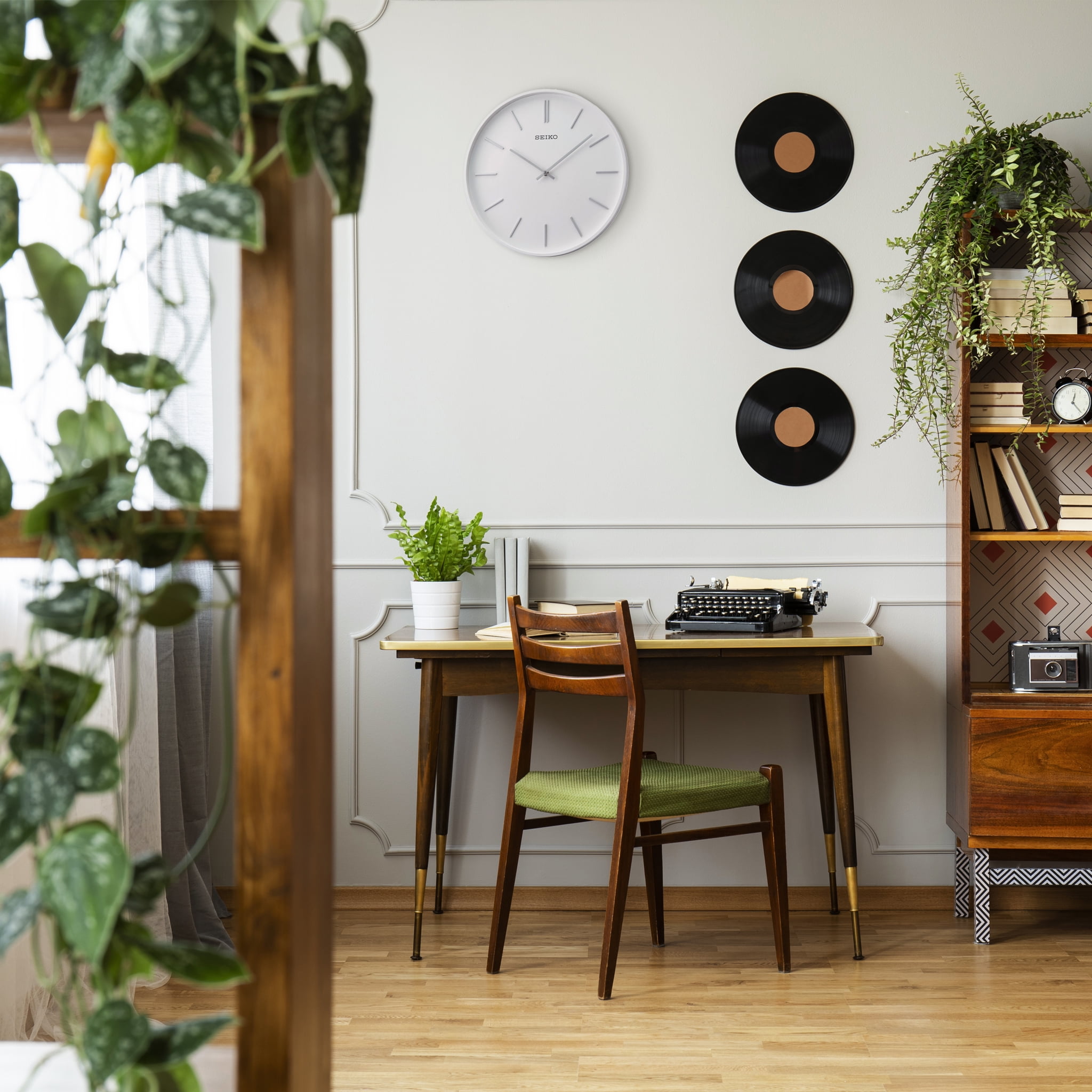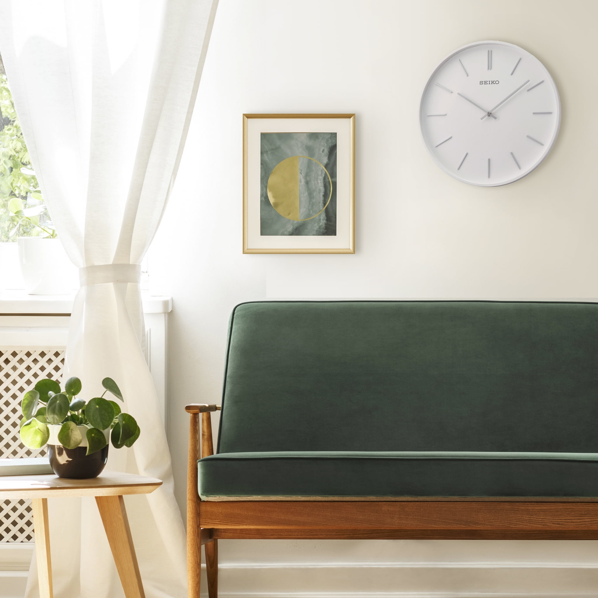 Seiko 13″ Pax round wall clock White oak veneer Silver-tone 3D numerals Open airy feel to this clock as no cover is necessary on this ultra chic piece Clean-lined look and feel Powered by 1 AA battery (included) Overall dimensions: 13.11 X 13.11 X 1.57 inches Analog Quartz movement