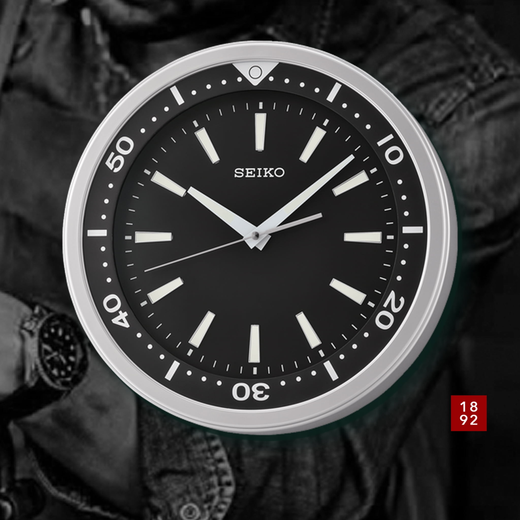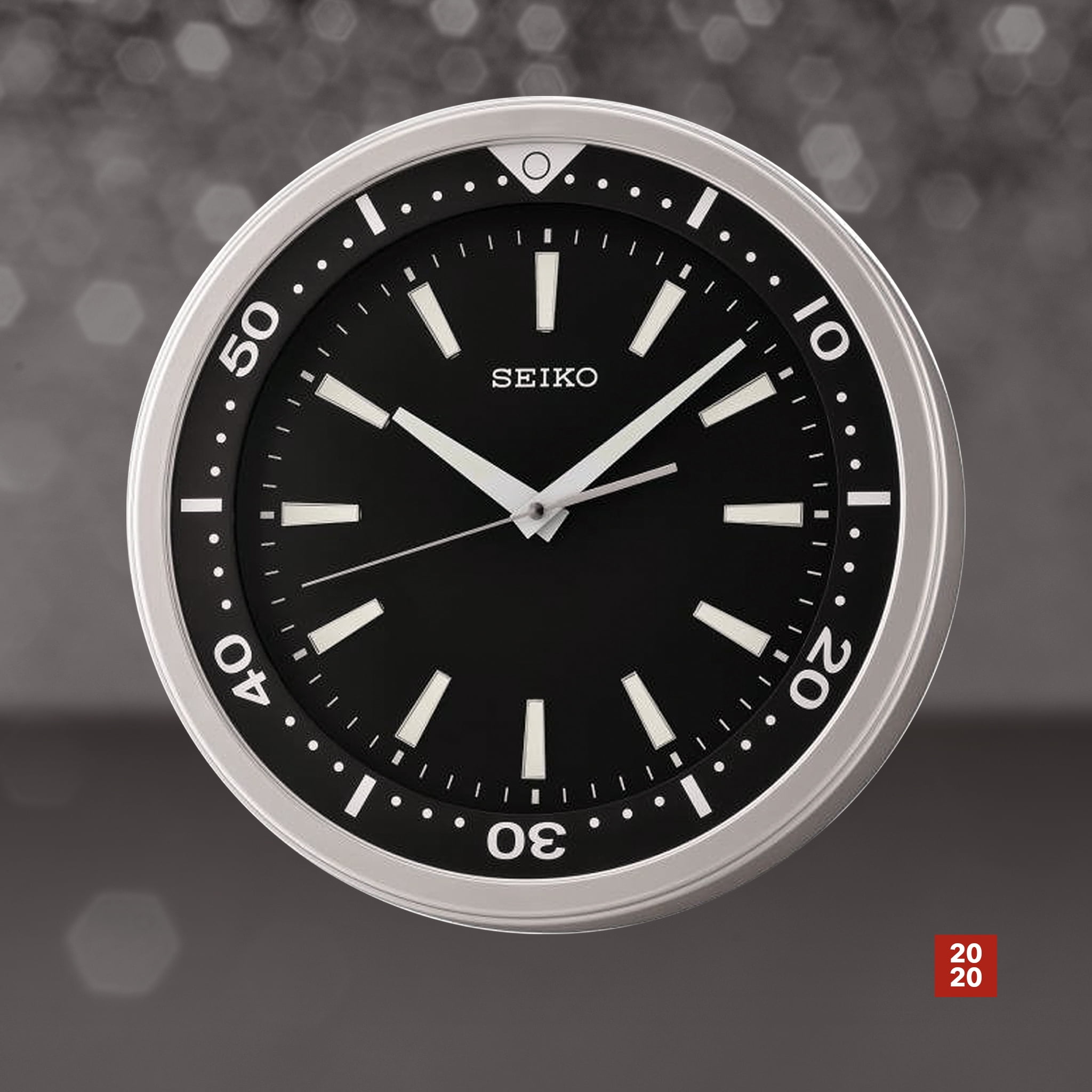 Seiko 14″ Ultra Modern “Watch Face” wall clock Simple, ultra-modern wall clock Round silver plastic frame with easy-to-read white markers Quiet sweep second hand 3D index with LumiBrite Hands with LumiBrite for easy read in low light Powered by 1 AA battery (included) Overall dimensions: 13.78 X 13.78 X 2.13 inches Quartz movement