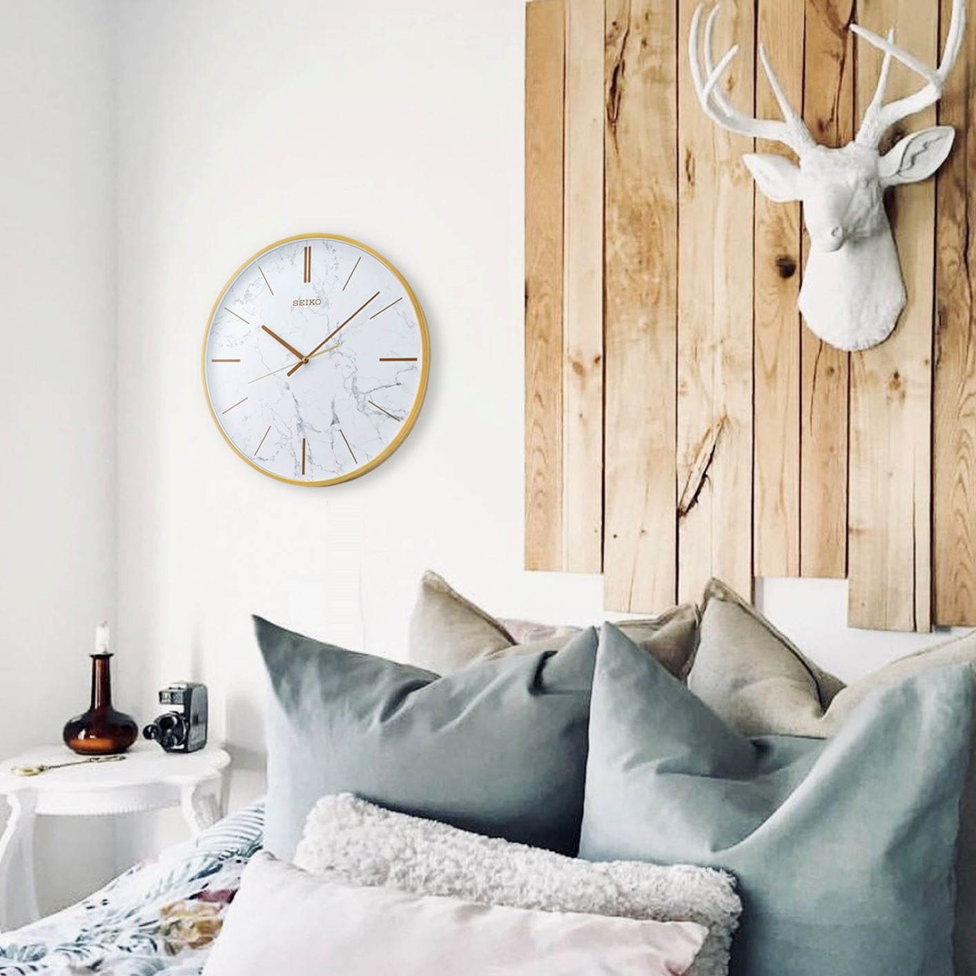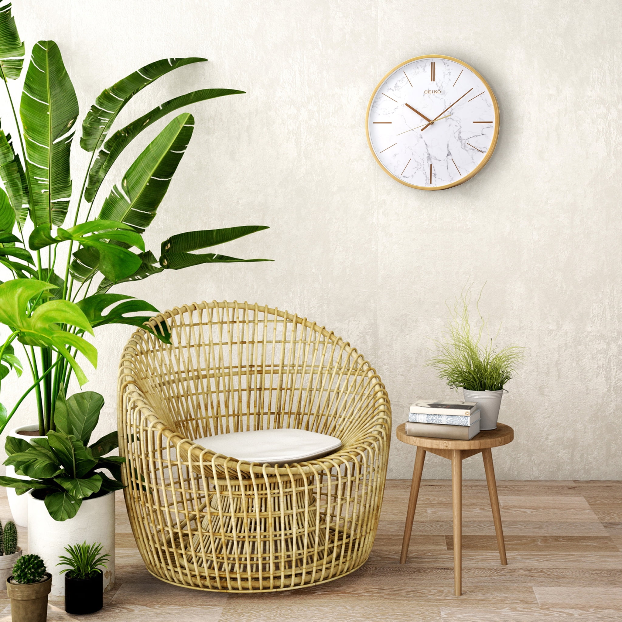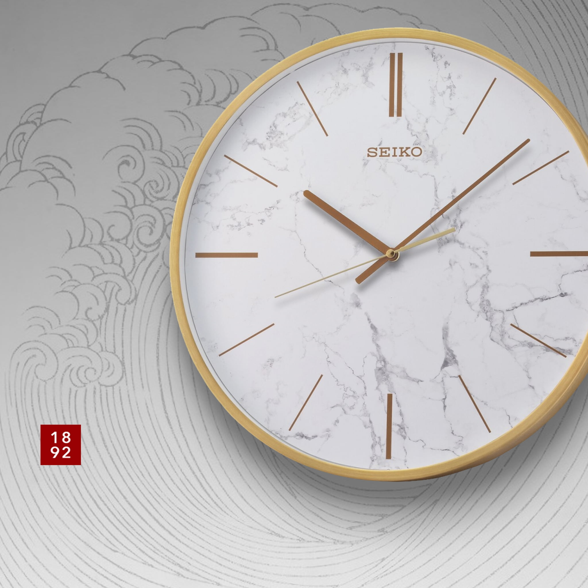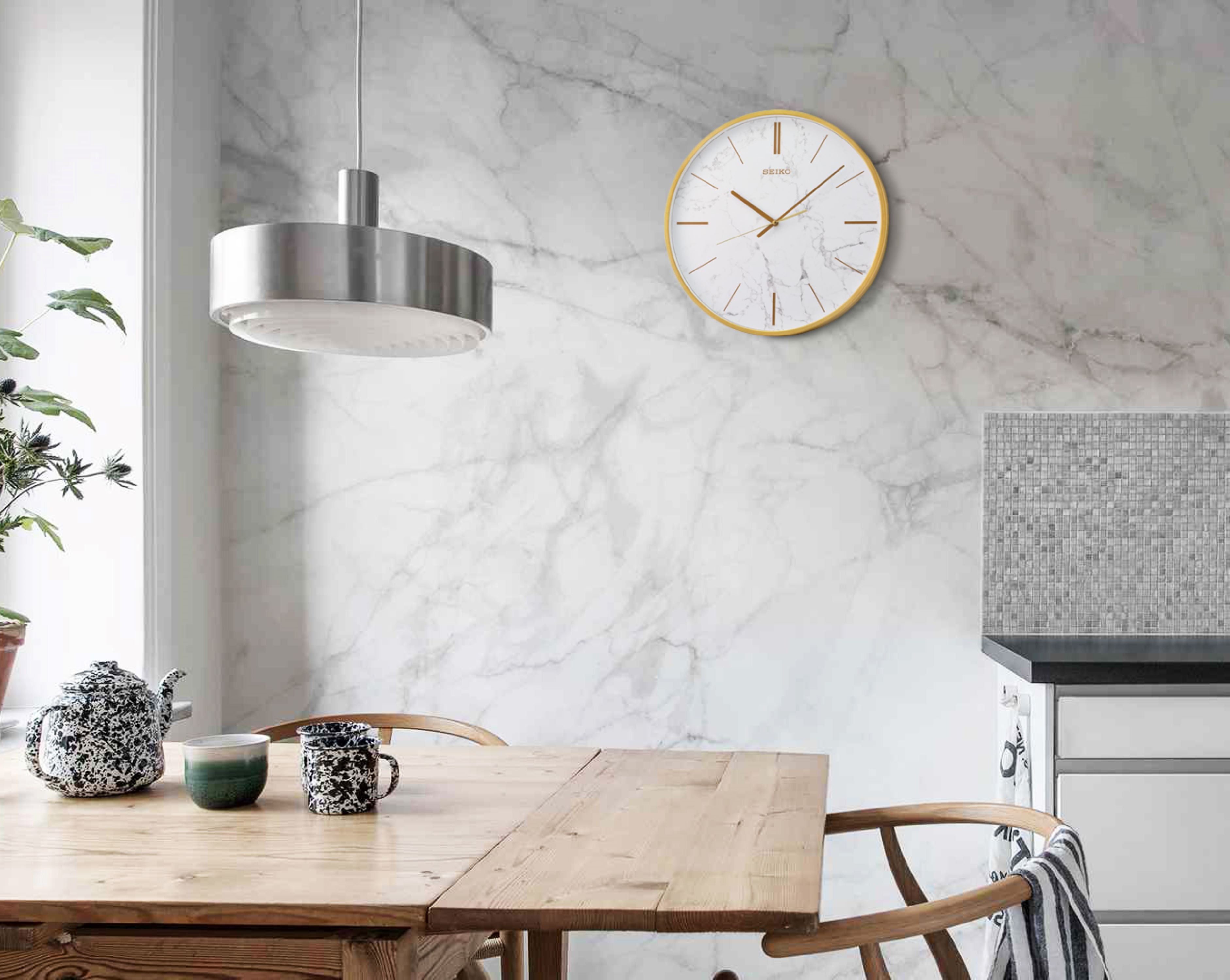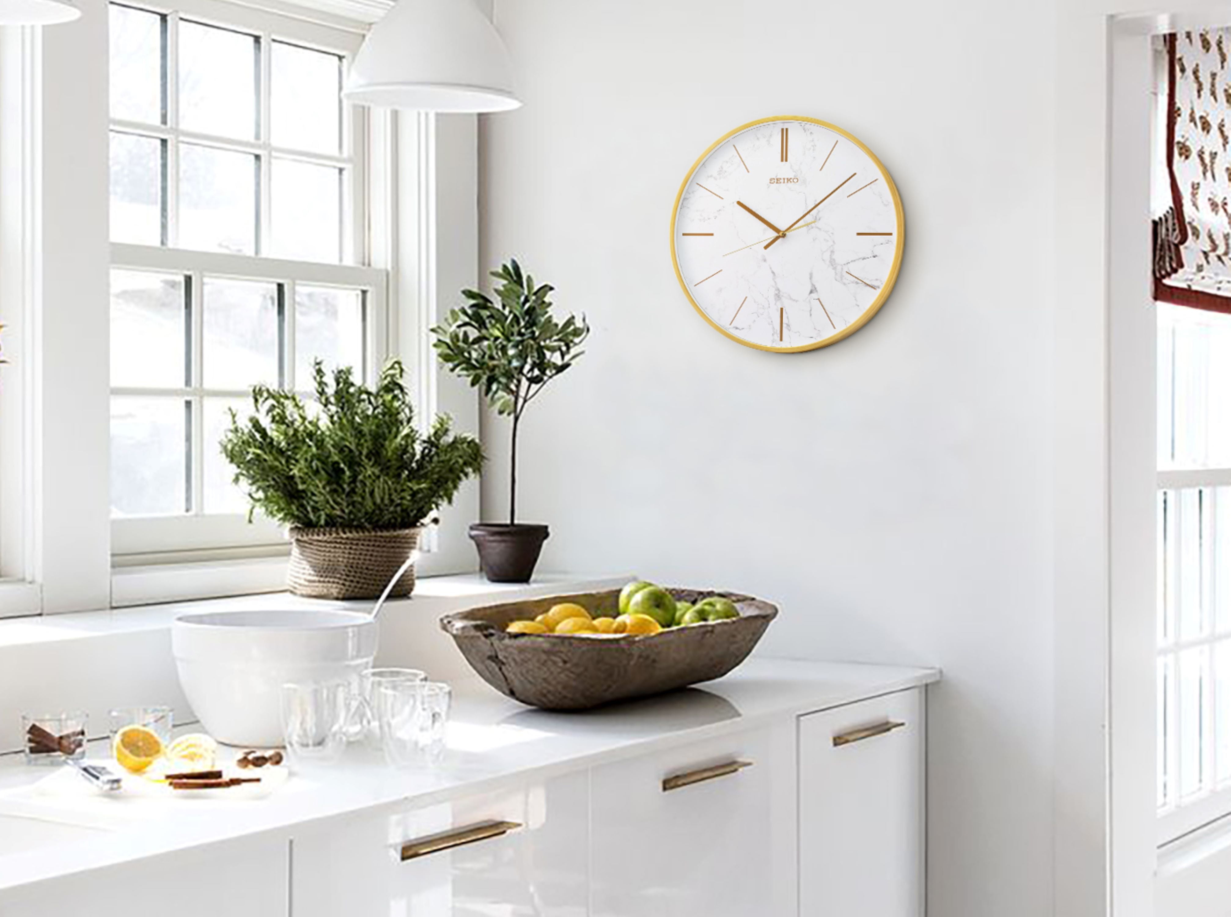 Seiko 16″ Carrara Wall clock The look of white marble in a golden wall clock Perfectly matches kitchen stone countertops or beautiful living rooms. Golden color numeral markings Quiet sweep second hand Glass cover Powered by 1 AA battery (included) Overall dimensions: 16 x 1.8 inches Quartz crystal movement