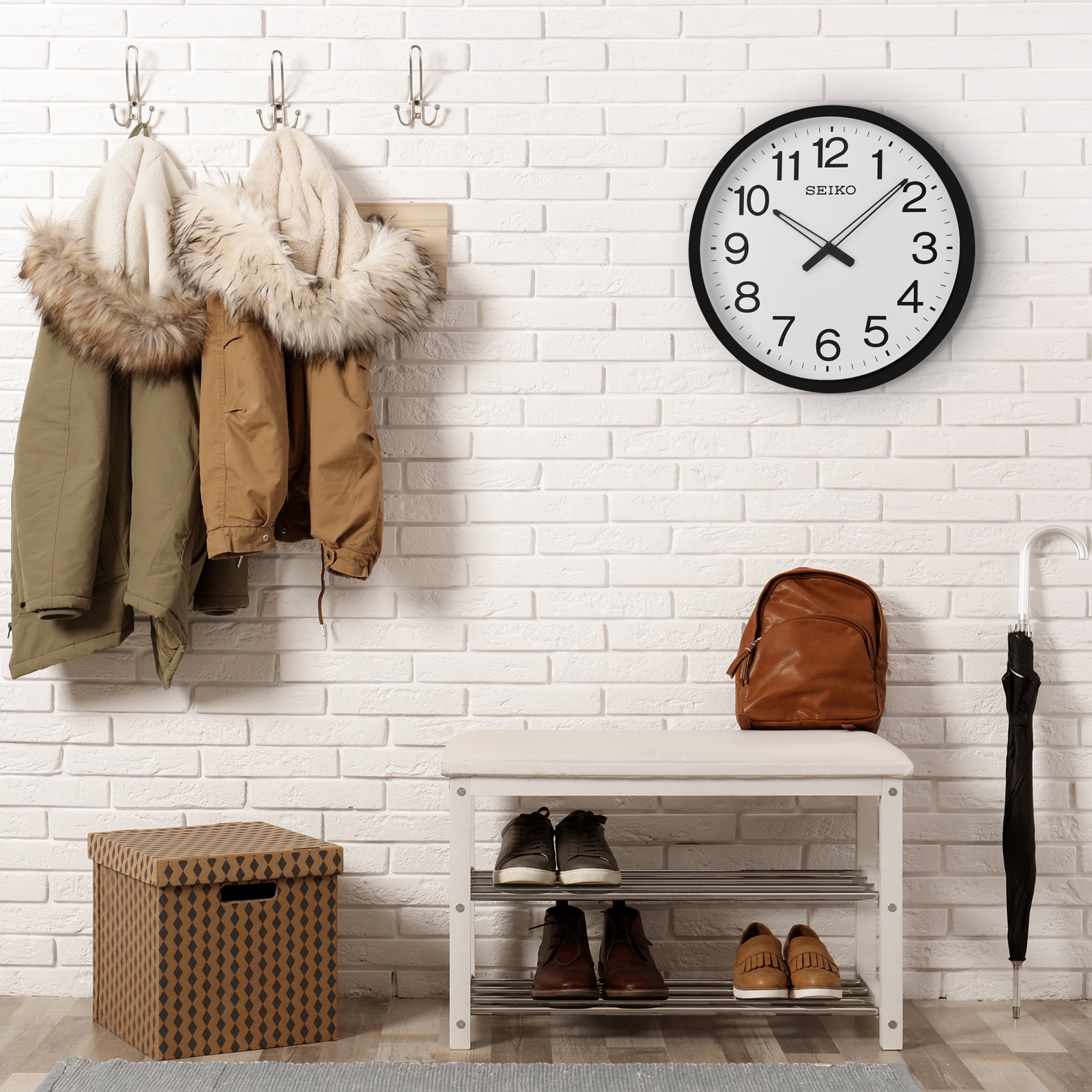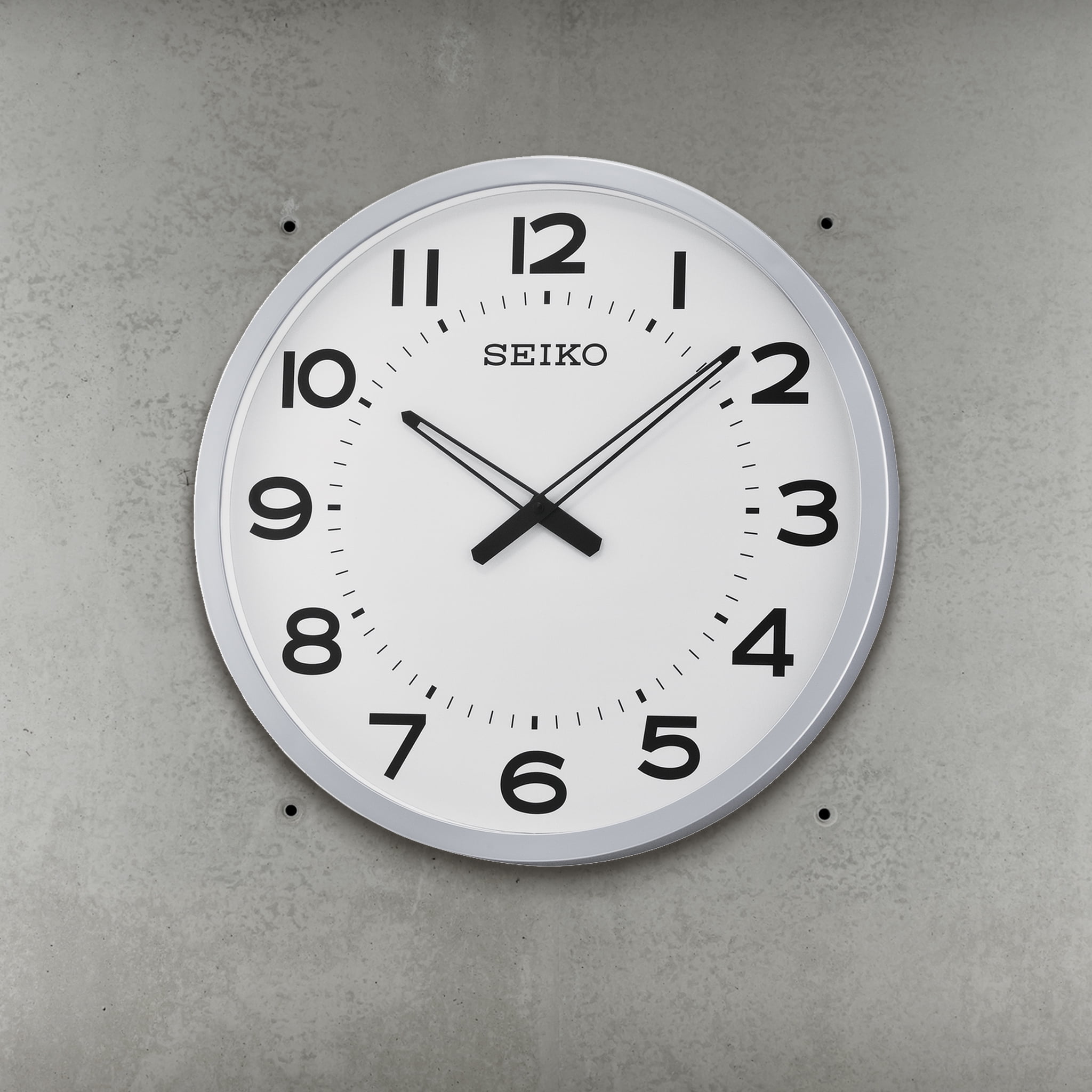 Seiko 20″ Ultra-Modern Silver Framed Wall Clock Round silver-tone plastic case Oversized wall clock Easy to read black numerals Precise quartz movement Powered by 1 AA battery (included) Overall dimensions: 20 X 12.24 X 1.8 inches Easy to set Easy to read Easy to hang