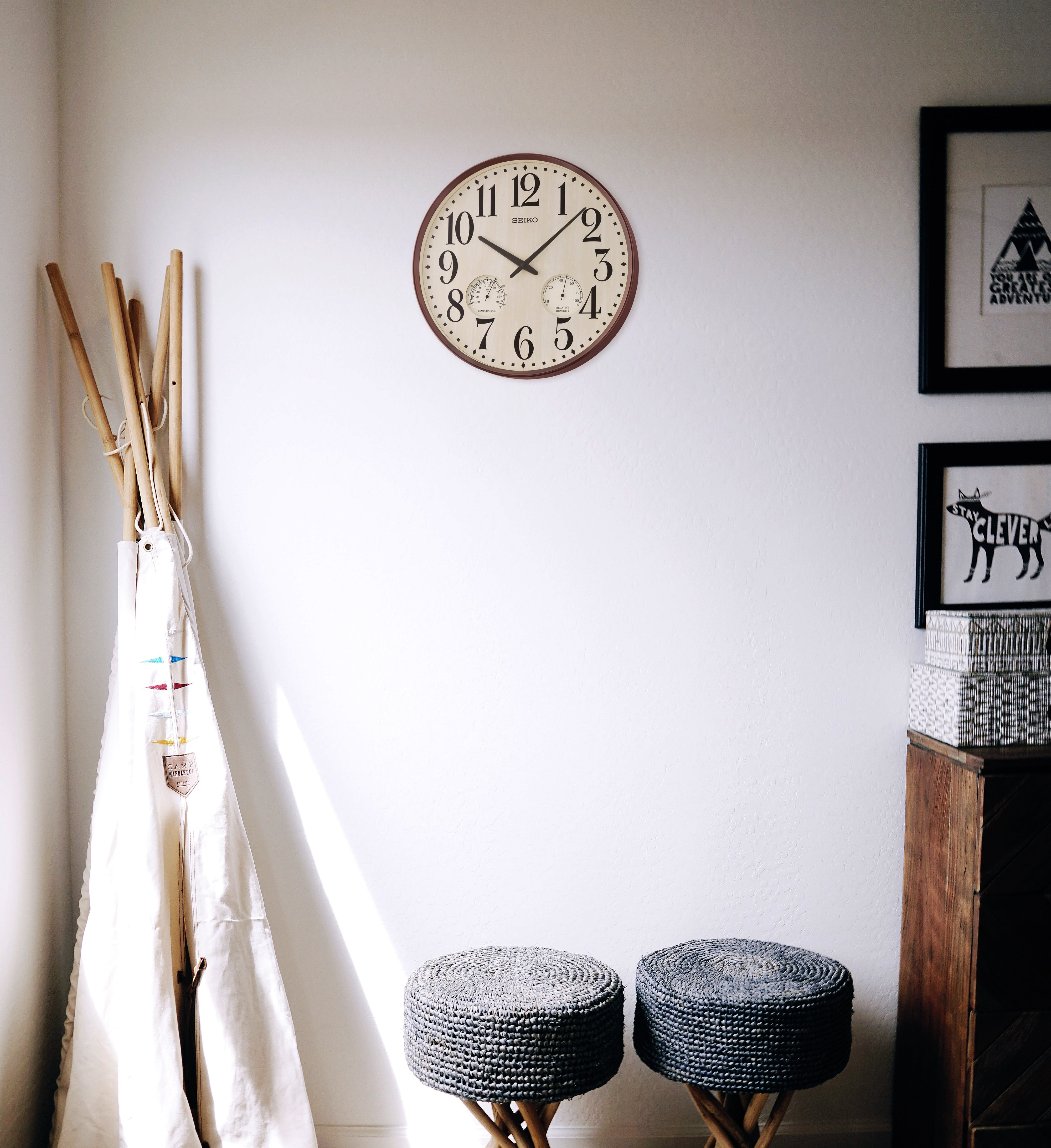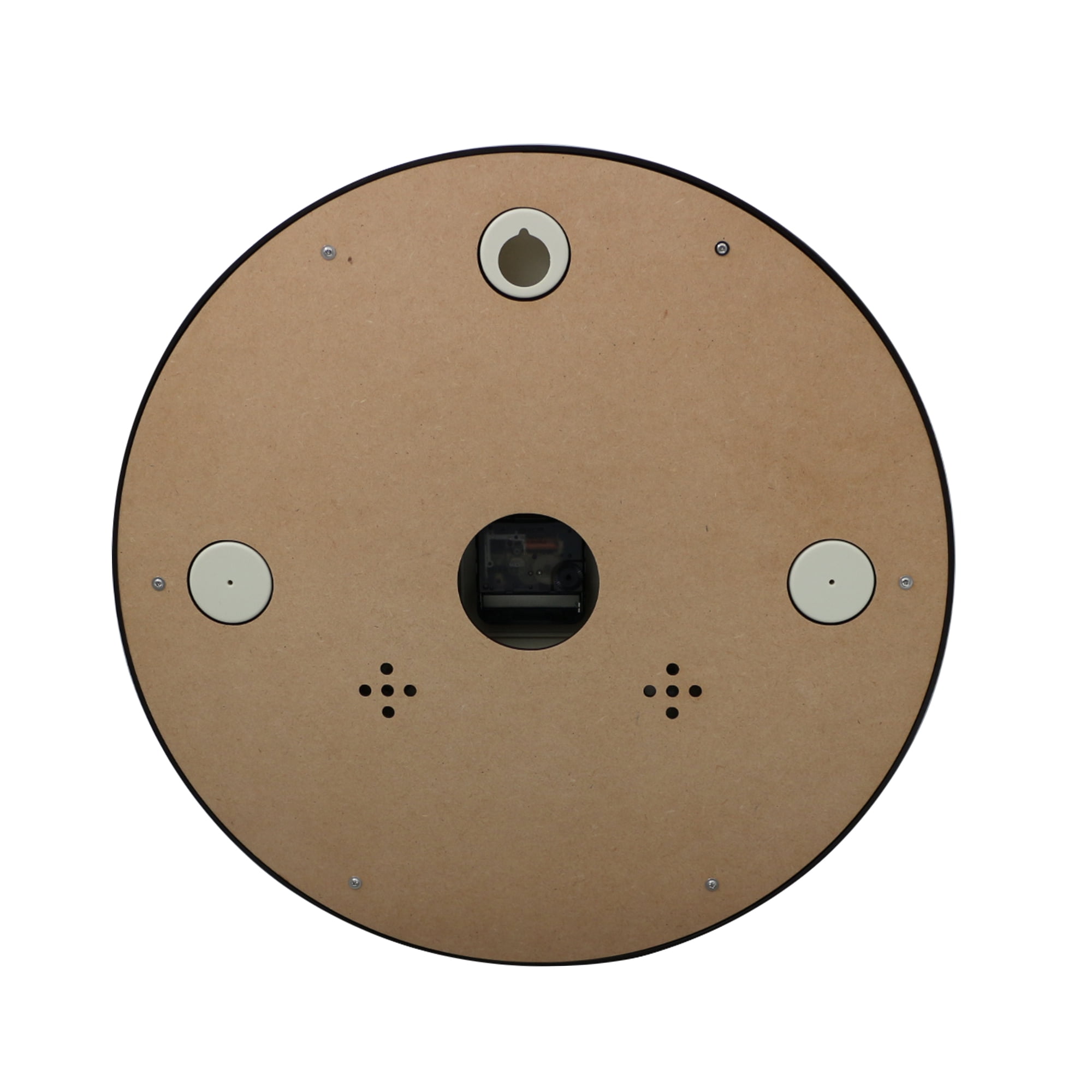Seiko Iria is a 16″ round wall clock Brown frame with antiqued face Wasy to read numerals Thermometer Hygrometer Powered by 1 AA battery (included) Overall dimensions: 16.61 X 16.61 X 2.76 inches Quartz crystal movement allows for the most accurate time keeping