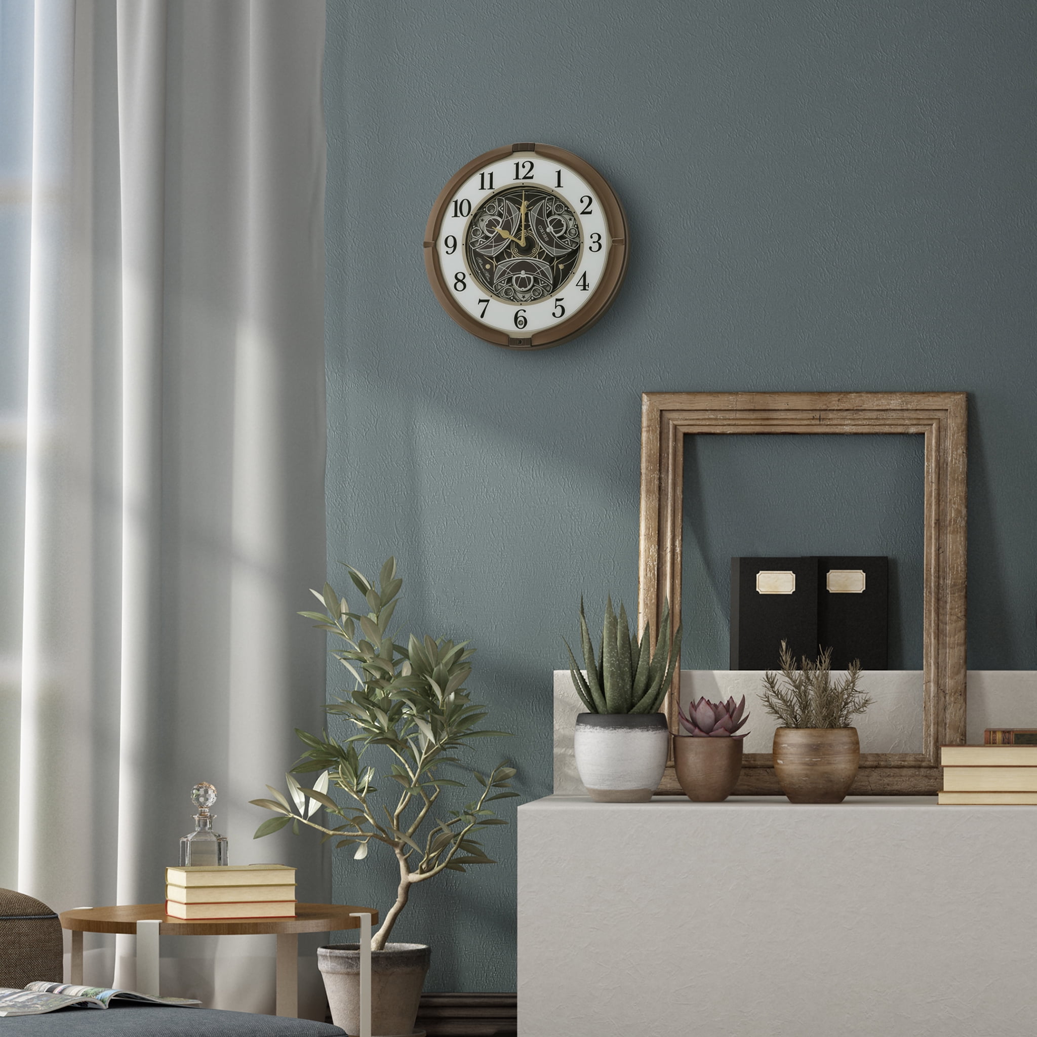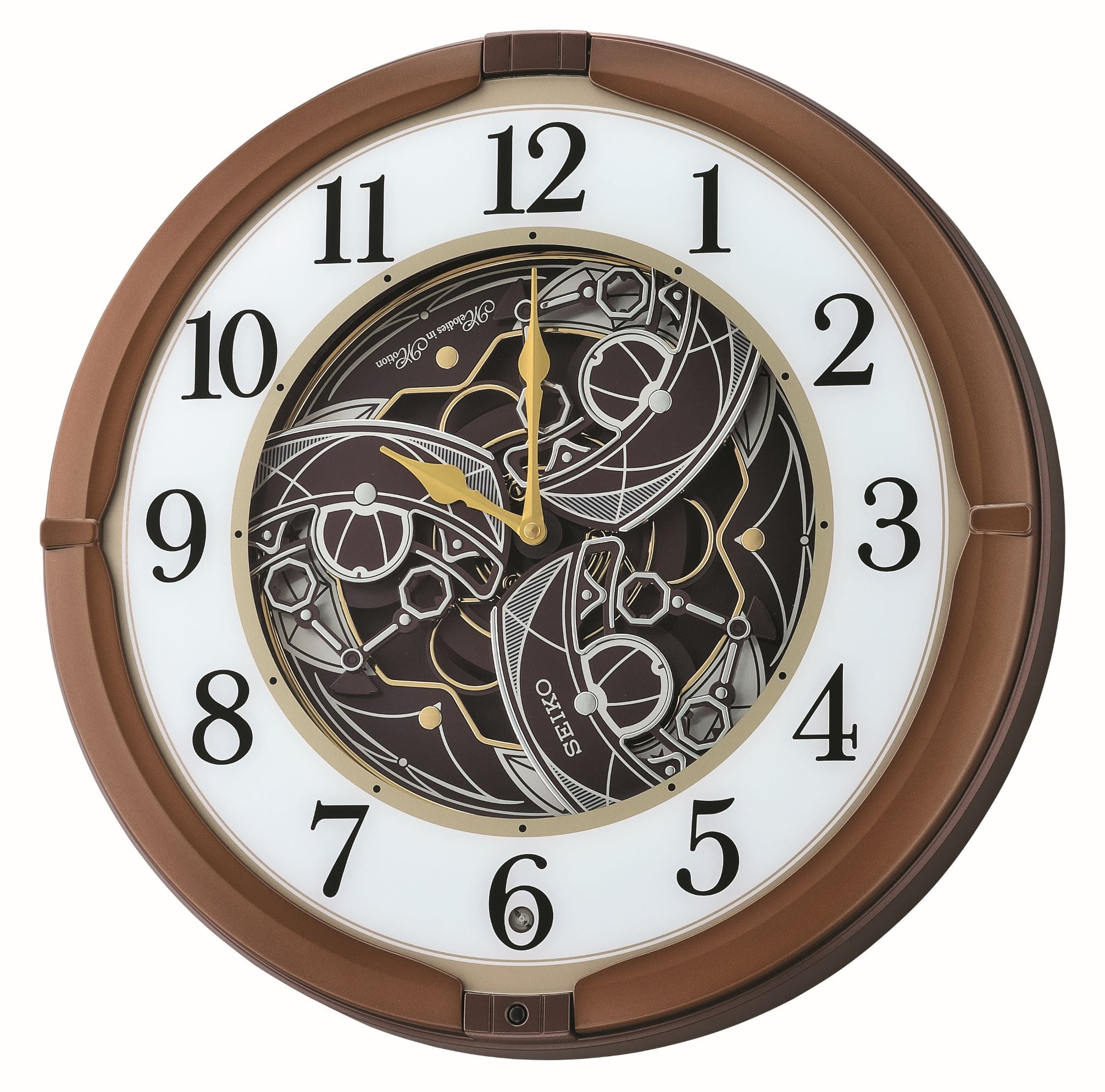 Seiko Mechanical Melodies in Motion Musical Wall Clock This round clock of brings the constellation combines to life On the hour, the dial opens and turns, and plays1 of 18 finest quality sound melodies plus an opening and ending melody Brown case Demonstration button Volume control Clock is enclosed in glass Pendulum features bright and colorful crystals Off/on switch Rotating center opens and closes when melodies are played Light sensor disengages all melodies when it becomes dark Powered by 4 C battery (included). Overall dimensions: 15.35 X 15.35 X 3.78 inches Melodies include: The Four Seasons “Spring,” Kanon, Eine Kleine Nachtmusik, Symphony No. 6 “Pastoral,” “Morning” From Peer Gynt, La Traviata “Drinking Song”, Amazing Grace, The Planets “Jupiter”, Waltz Of The Flowers, Salut d”Amour, Pictures At An Exhibition “Promenade”, Dance Of The Reed Pipes, Deck The Halls, Deck The Halls, O Tannenbaum, We Wish You A Merry Christmas, Joy To The World, Silent Night, Jingle Bells