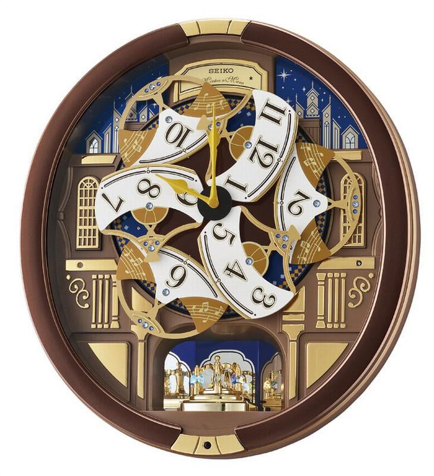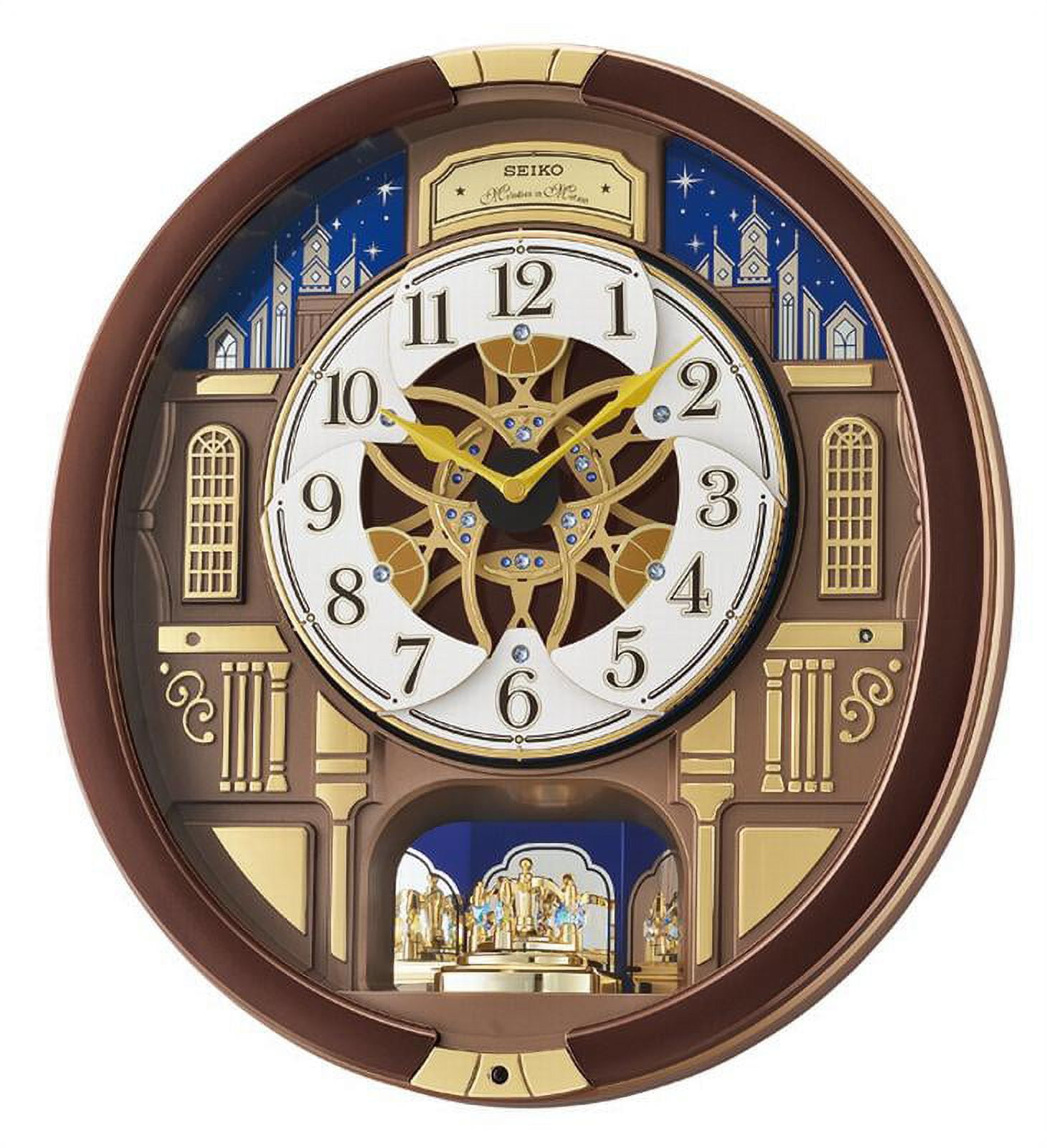 Seiko’s Melodies in Motion Clocks are enchanting and magical. This clock, Nightime City Skyline, brings the nighttime city skyline design to life. On the hour, the dial opens to reveal a turning decorative wheel with sparkling crystals and plays one of eighteen of the finest quality sound melodies. Metallic brown case A demonstration button Volume control Off/On Switch Clock is enclosed in glass Rotating pendulum features sparkling crystals Melodies include: The Four Seasons “Spring,” Kanon, Eine Kleine Nachtmusik, Symphony No. 6 “Pastoral”, “Morning” From Peer Gynt, La Traviata “Drinking Song”, Amazing Grace, The Planets “Jupiter”, Waltz Of The Flowers, Salut d”Amour, Pictures At An Exhibition “Promenade”, Dance Of The Reed Pipes, Deck The Halls, O Tannenbaum, We Wish You A Merry Christmas, Joy To The World, Silent Night, Jingle Bells Powered by 4 C batteries (included) Overall dimensions: 17.5 X 16 X 3.75 inches Quartz crystal movement allows for the most accurate time keeping.