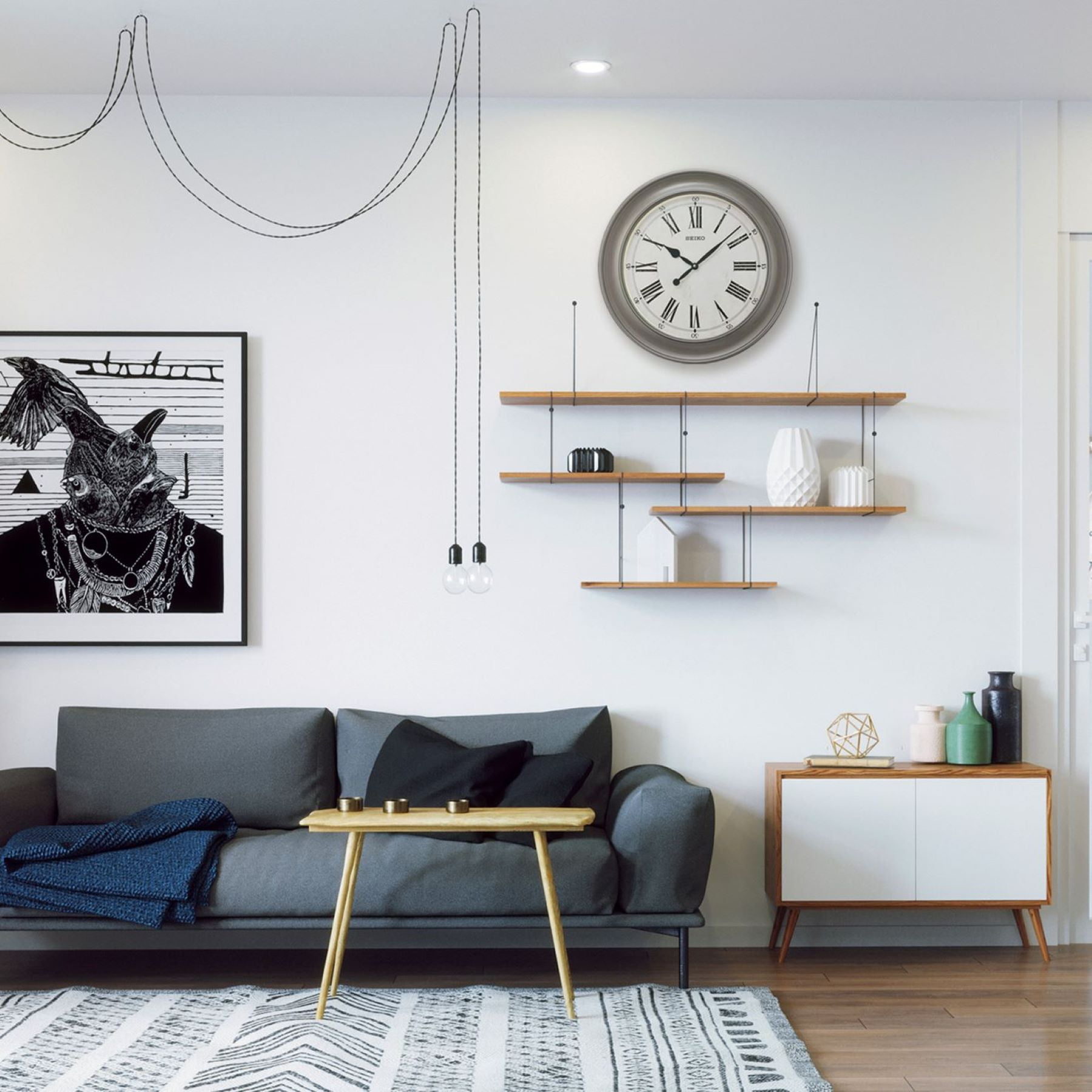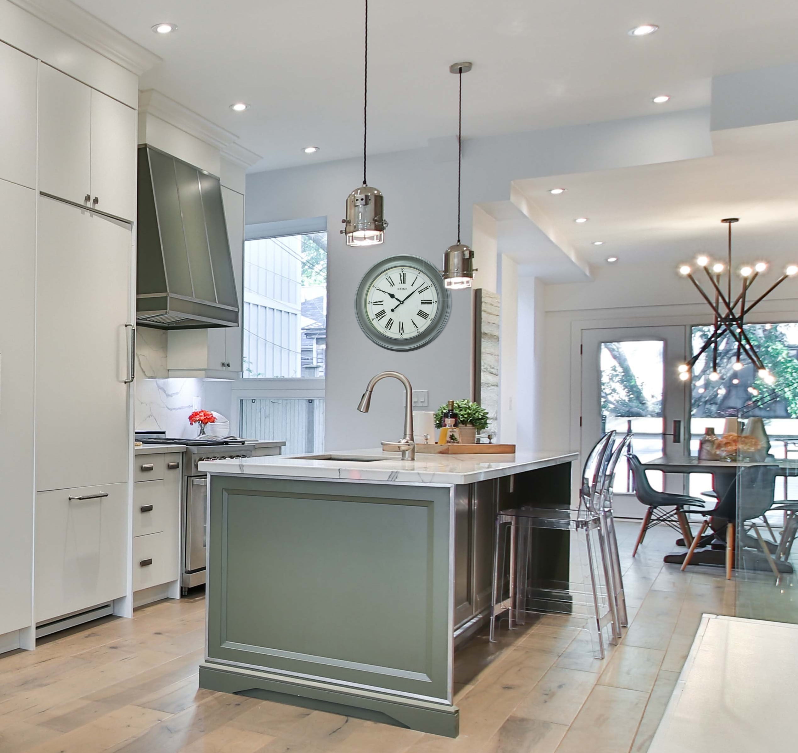 Seiko Noa Wall Clock, 22″ in Gray Oversized round frame The vintage design Black Roman numerals Easy to read Powered by 1 AA battery (included) Overall dimensions: 22.44 X 22.44 X 1.85 inches Quartz crystal movement allows for the most accurate time keeping.