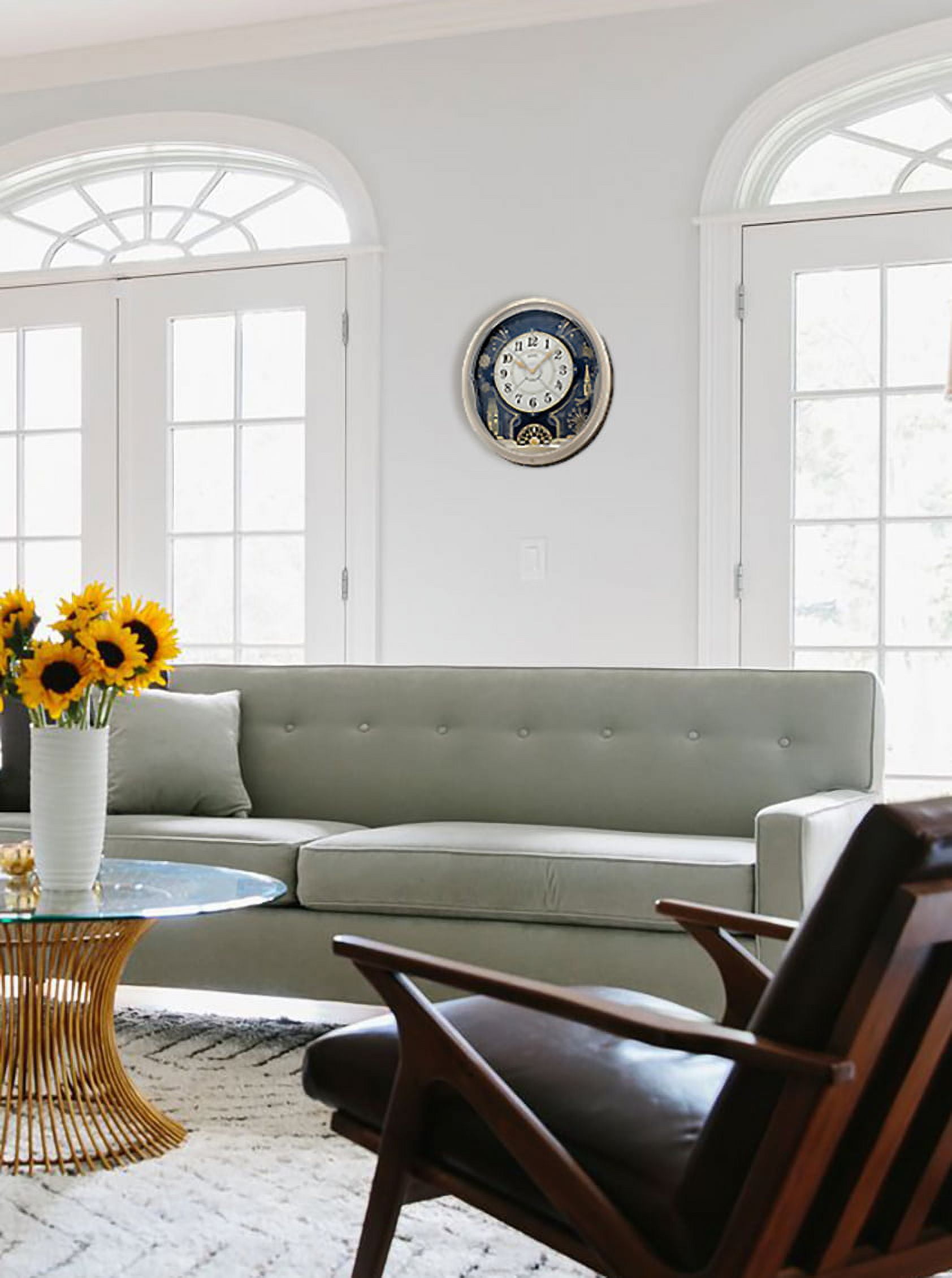Seiko’s melodies in motion clocks are enchanting and magical. This clock, starry night melodies in motion, brings the magic of a starry night to life. On the hour, the dial opens to reveal a turning decorative wheel and plays one of six of the finest quality sound melodies plus an opening and ending melody. It has a metallic silver case, a demonstration button, and volume control. This clock is enclosed in glass, the pendulum features Swarovski crystals and an off/on switch. This clock will light up your house year-round.