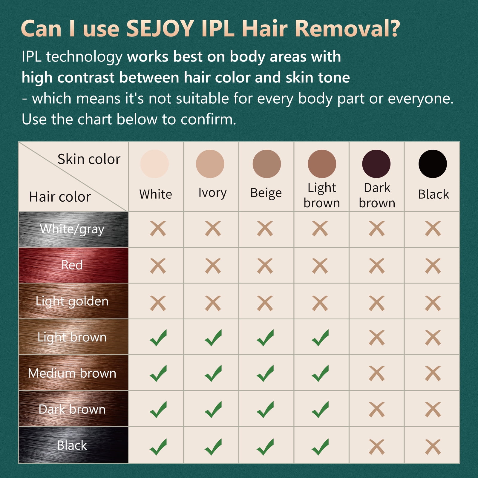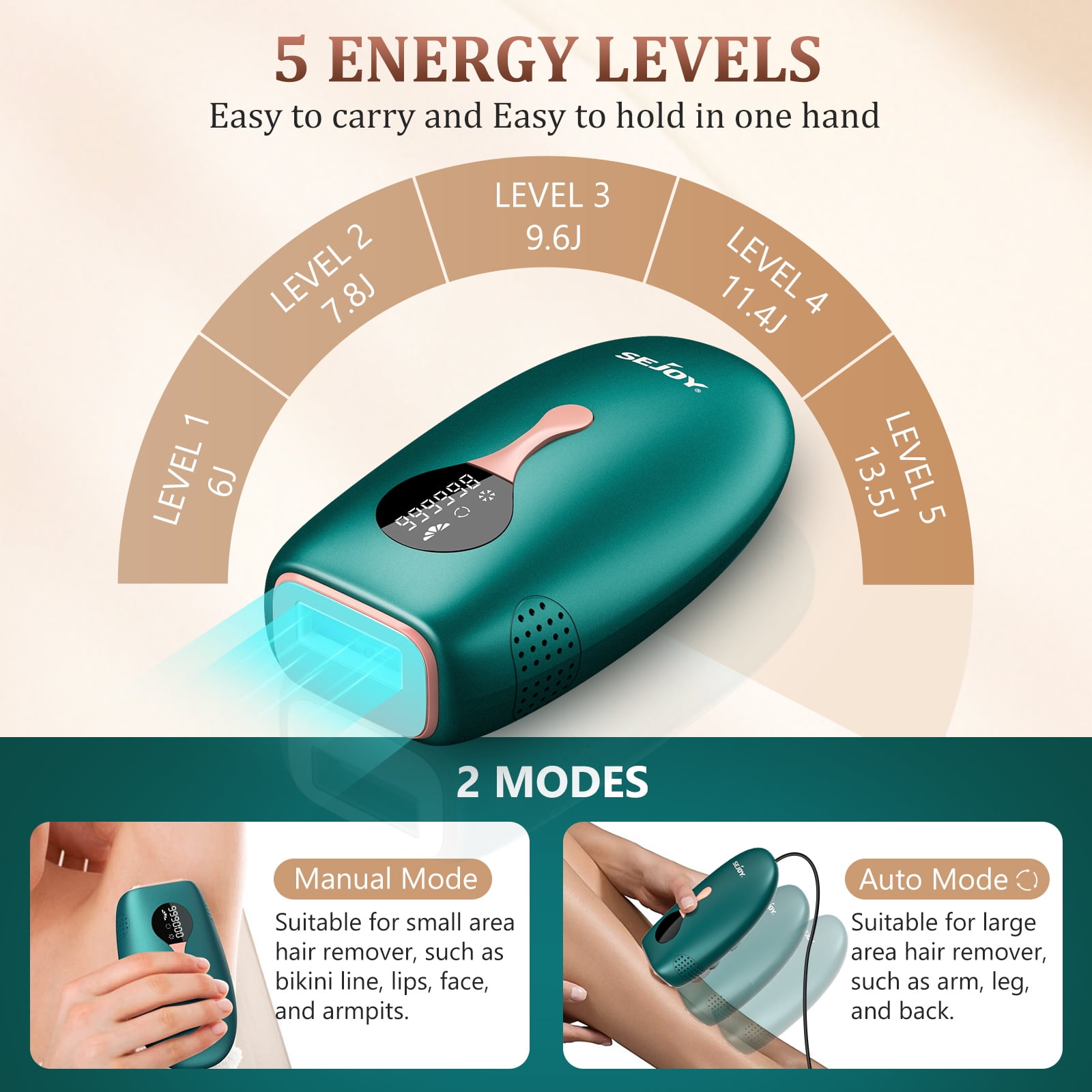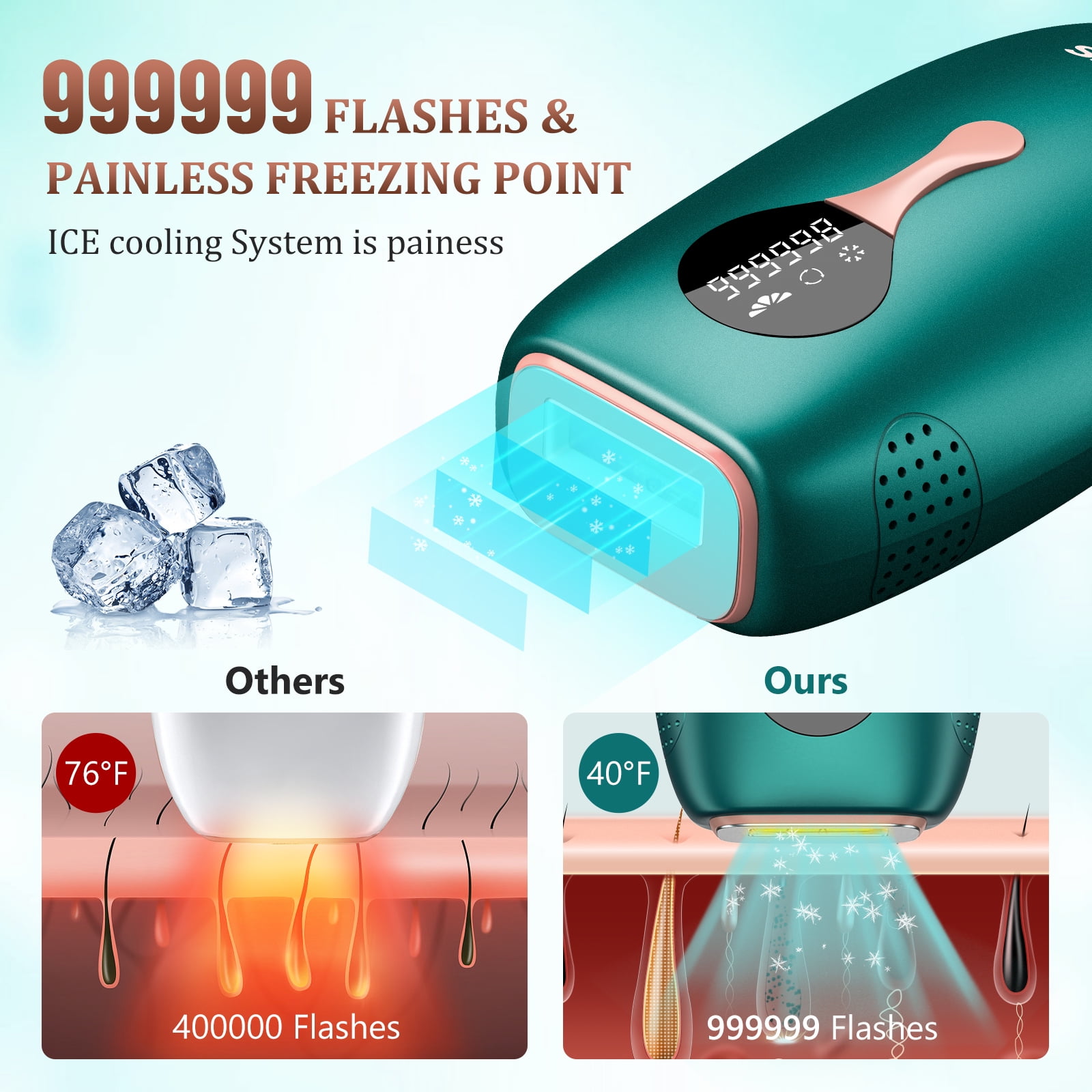 Effective and Painless Hair Removal At Home by Using Our Light And Portable IPL Hair Removal Device Why Choose Sejoy IPL Hair Removal? The Traditional Shaving/Waxing: painful, sensitive to skin, only a Immediate result. The Clinical Treatment: no privacy, several appointments required, cost a lot. Sejoy IPL Hair Removal: One-time investment for life, 999999 flashes per machine for long-term use, long-lasting hair removal in 4 weeks, painless treatments at the comfort of your own home. 50�F ICY SENSSTION during the whole process to avoid skin burn, provide a painless treatment. Our IPL hair removal has been developed by professional team, use high quality material and advanced technology, ensure the safety of the skin during use.Team Sejoy IPL hair removal makes of ice cooling system, large cooling area will shrink pores when using this machine, give you a painless and comfortable experience at the same time.Our design team use premium paint craft and choose the elegant deep sea green, to show more beauty and fashion of the hair removal machine.