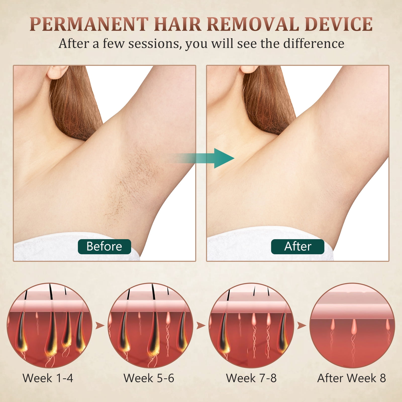 Life-Long Use The epilator hair removal upgrade to 999,999 Flashes, enough for lifelong. Please keep it plugged in an outlet when in use, non-battery operated, you will never need to buy a replacement cartridge for your hair removal device which is an economical at-home solution. Get Salon Results in Just Four Weeks Enjoy smooth skin and get a noticeable reduction in hair. After the first four weeks of treatment continue with biweekly touch-ups to look your best year-round. Sejoy?s flat light window design targets hair at the root while ensuring each flash is painless and efficient. Industry-leading Ice-Cooling Technology Get silky-smooth results without the pain. Sejoy adopts ice-touch technology to lower the temperature from 158? to 50? at the point of contact with your skin. Suitable for Full-body Use Get to work on pesky hairs with Sejoy. Simply select the intensity level suitable for you and treat hair on your arms, legs, underarms, bikini line, and more. What?s in the Box Get fantastic results right from your sofa. Sejoy IPL Hair Removal Package includes the Device, Razor, and Sunglasses. It?s all you?ll need to look and feel your best throughout the seasons. Adjustable Energy Levels The hair removal device has 5 different energy levels to adapt to different skin sensitivities, please gradually increase the level from the first gear. Auto & Manual Mode According to the areas where you want to choose the correct flashing mode: Auto Continuous Mode- For large areas ( Armpits, Legs, Arms, Chest ). Manual Single Mode- Suitable for small areas. (Fingers, Underlip, Bikini Line) Life-Long Use Get Salon Results in Just Four Weeks Industry-leading Ice-Cooling Technology Suitable for Full-body Use What?s in the Box Adjustable Energy Levels Auto & Manual Mode How often to use the hair removal? 1-4 weeks: 3 Times a week. Over 75% hair starts to fall off naturally. 5-6 weeks: Twice a week. New hair falls off and is inhibits growth. 7-8 weeks: Once a week. Hair becomes thinner and less. Q&A Q: Does IPL work on all skin types and hair colors? A: Unfortunately, not all hair and skin types are suitable for IPL treatment. Generally speaking, IPL and laser hair removal do not work on blonde and red hair or very dark skin. Q: Which areas of my body can I use my handset on? A: The Sejoy handset is effective to use everywhere that hair grows, including your legs, underarms, arms, chin, hands, neck, back, and bikini line. It is not recommended to use around your eyes without protective eyewear.