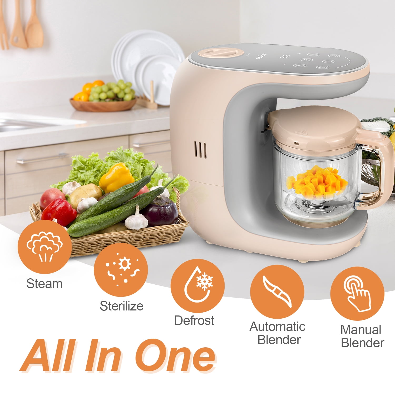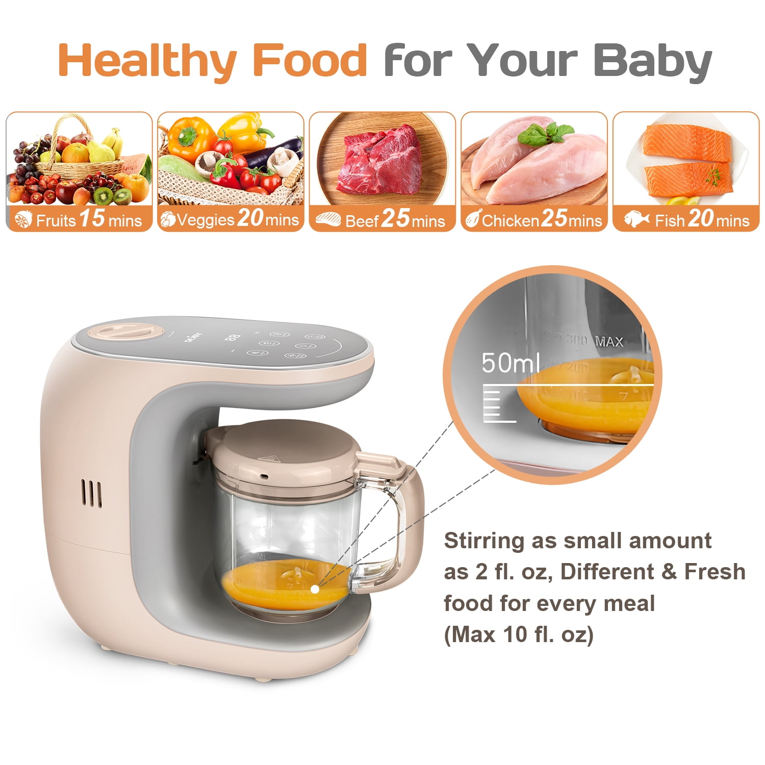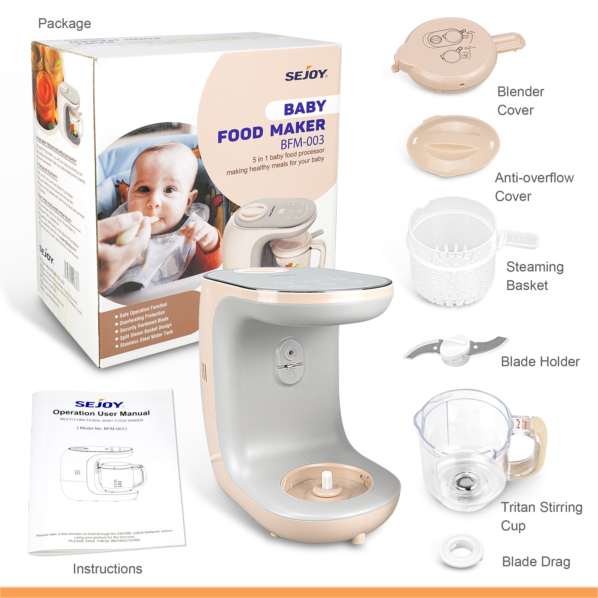 Intelligent Operation LED touch screen control panel allows you to easily select different functions. In the steaming function, you could manually increase or decrease the set time for best cooking state of the food. Safe Operation Function When the product is powered on, if the lid of the stirring cup is not in proper contact with the safety switch or the stirring cup is open, the food processor will not work. Healthy Cooking The unique steaming cycle cook locks in nutrients, flavors and vitamins, two mixing modes to customize the ideal food, ensuring your baby have the tasty and healthy homemade food. Overheating Protection If the water tank runs dry during steaming,the heater will shut off. Please add enough water to the tank to resume operation. Operational safety guarantees The blade has a fixed locking position to make the blade more secure and stable. Food and soup are separated and the thickness of the food could be adjusted according to the baby’s needs. Equipped with the user-friendly handle, more easy and convenient to use. Specification Supply Voltage:120V-60Hz Heating-up Power: 300W Blender Power: 120W Water Tank Capacity:180ml