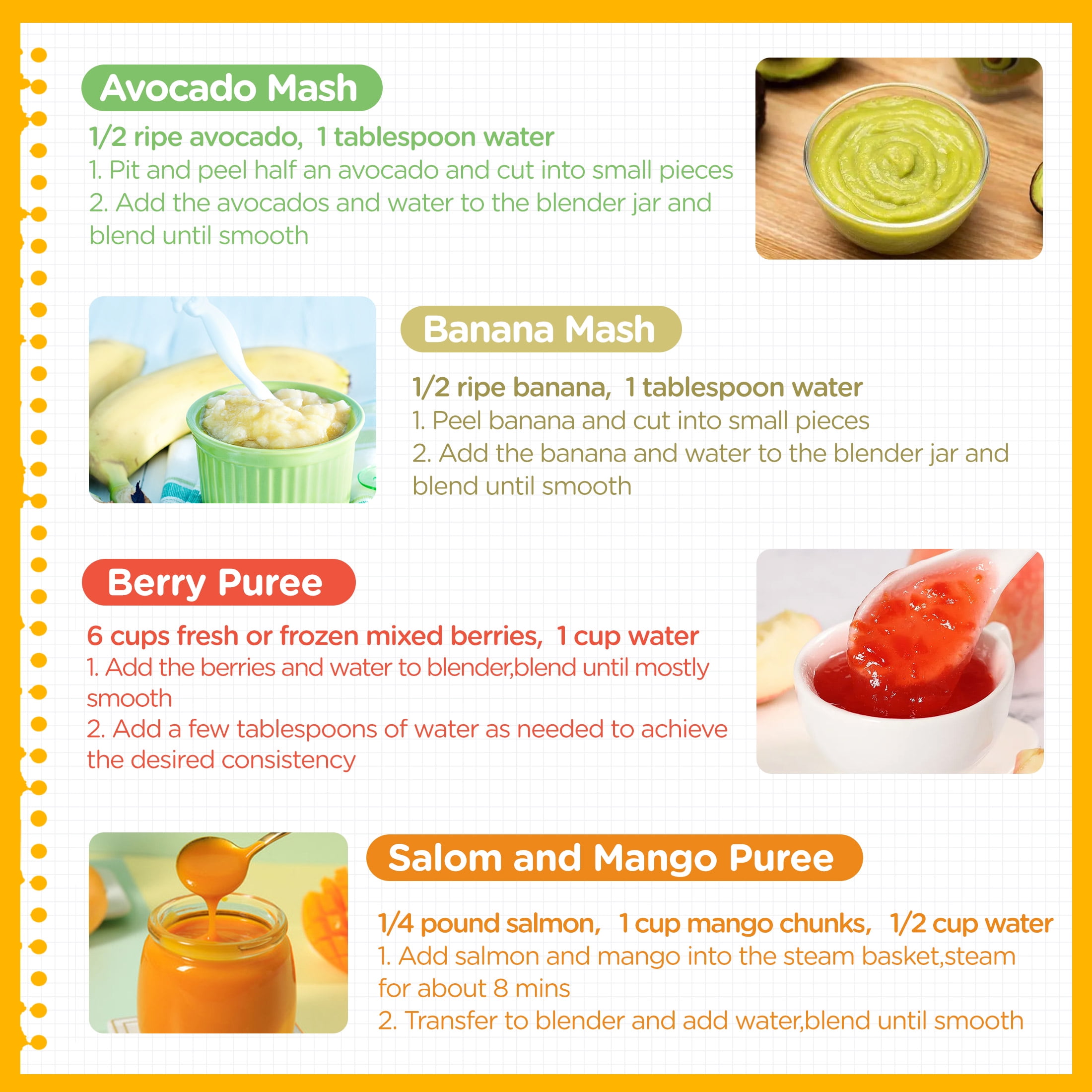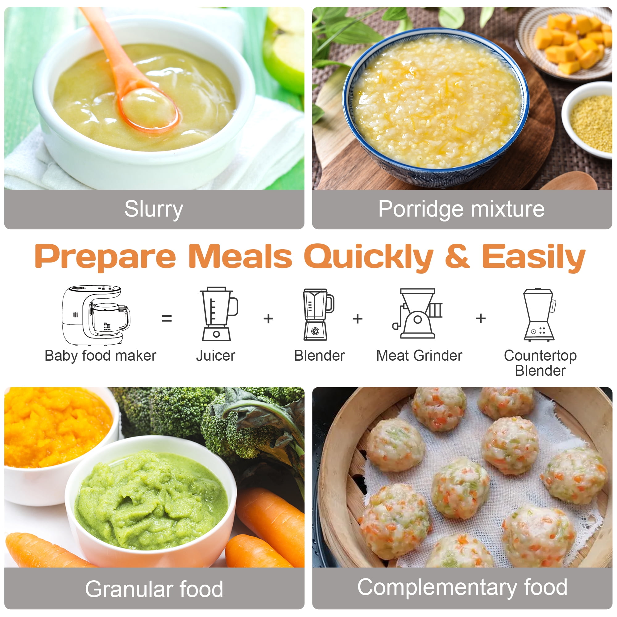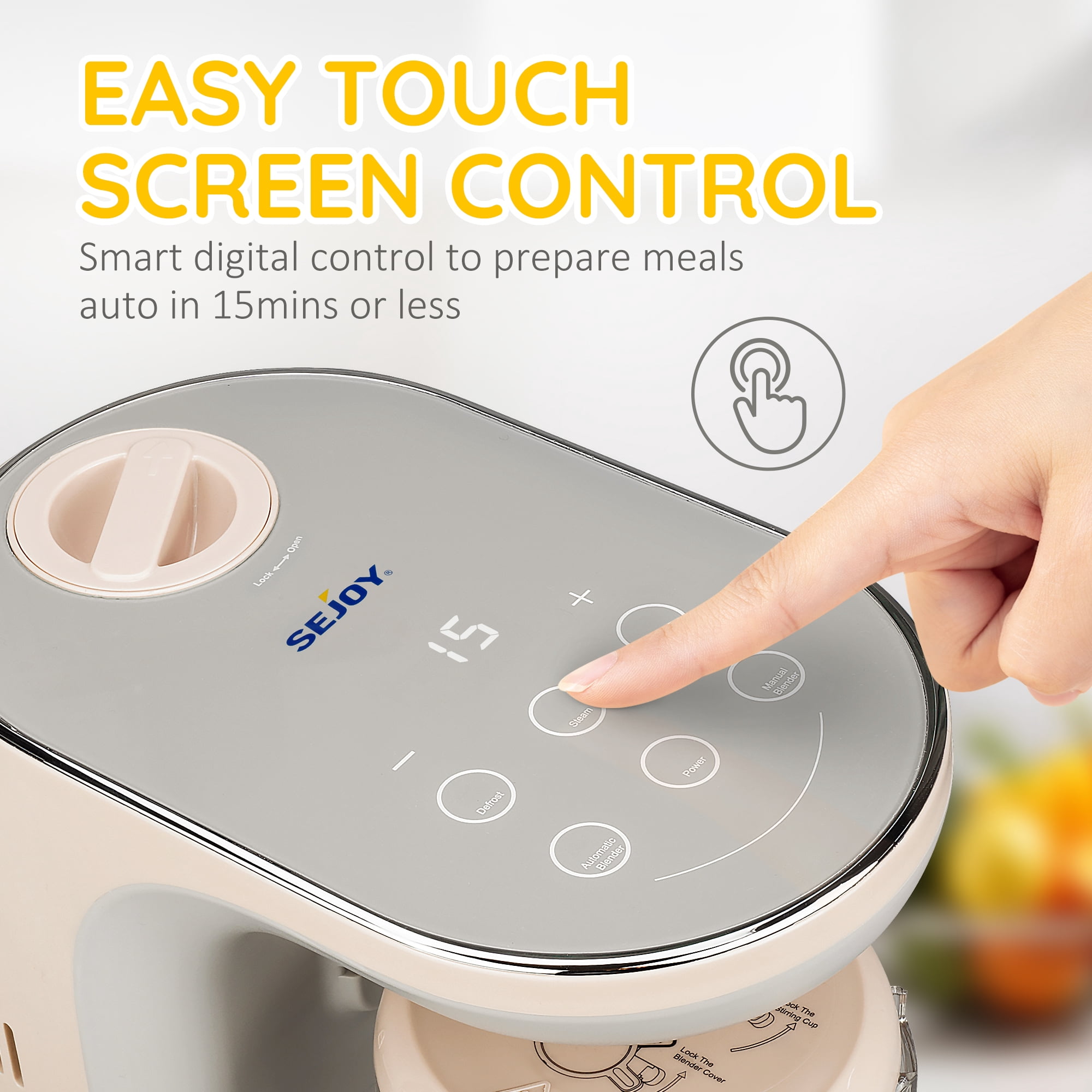 Intelligent Operation LED touch screen control panel allows you to easily select different functions. In the steaming function, you could manually increase or decrease the set time for best cooking state of the food. Safe Operation Function When the product is powered on, if the lid of the stirring cup is not in proper contact with the safety switch or the stirring cup is open, the food processor will not work. Healthy Cooking The unique steaming cycle cook locks in nutrients, flavors and vitamins, two mixing modes to customize the ideal food, ensuring your baby have the tasty and healthy homemade food. Overheating Protection If the water tank runs dry during steaming,the heater will shut off. Please add enough water to the tank to resume operation. Operational safety guarantees The blade has a fixed locking position to make the blade more secure and stable. Food and soup are separated and the thickness of the food could be adjusted according to the baby’s needs. Equipped with the user-friendly handle, more easy and convenient to use. Specification Supply Voltage:120V-60Hz Heating-up Power: 300W Blender Power: 120W Water Tank Capacity:180ml
