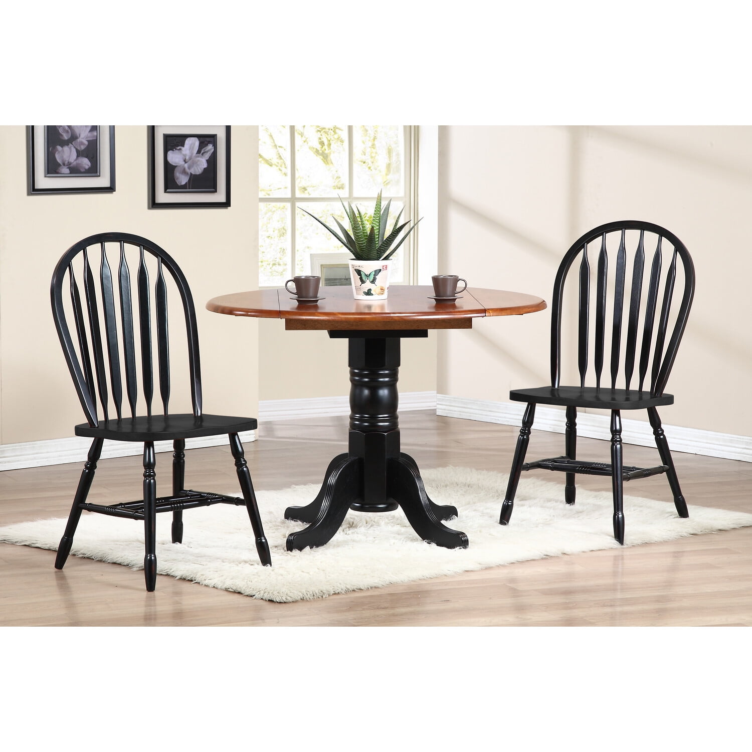 SET OF TWO FULLY ASSEMBLED WINDSOR STYLE DINING CHAIRS – Put your tools away, enjoy two high quality standard height dining chairs with a timeless design that assures your investment will not go out of trend SUSTAINABLE AND EARTH FRIENDLY SOLID WOOD – Crafted from responsibly harvested kiln-dried solid rubberwood, also known as Malaysian oak, a robust hardwood | No particle board, MDF or veneers FREE WOOD SAMPLES & LIFETIME CUSTOMER SUPPORT – Our happy and helpful customer care team located in the USA since 1992 is available to answer your questions at any time CONTEMPORARY COLOR – Beautiful two toned distressed antique black with cherry back accent for a rustic timeworn look DURABLE FINISH – Sealed with a pet and kid-friendly multi-step finishing process, matte lacquer preserves the natural grain patterns adding protection from moisture and daily wear and tear QUALITY CRAFTMANSHIP – Mortis and tenon construction for superior strength | All joints are bolted and epoxied for long term durability ERGONOMICALLY DESIGNED COMFORTABLE CHAIRS – Flat arrowback spindles securely support the half-circle gently angled high back | Slightly scooped shield shaped seats allow you to relax comfortably for long periods of time STURDY DINING CHAIRS – Splayed turned legs have strong wood stretchers that connect legs for stability | Commercial grade steel braces for heavy duty support tested to 350 lbs. CHAIR DIMENSIONS – 38”H x 20.5”D x 19.5”W ; Seat: 18”H x 17”D x 18”W | Back: 21”H x 19.5”W | Feet diameter: 1“ | Weight (2): 12 lbs. FRIENDLY DISCLAIMER- Studio photography lighting, slight measurement and weight variances are possible, your viewing device may display colors differently than in real life ARRIVES IN ONE BOX – Securely packaged with no assembly required EASY TO CLEAN & ENJOY – Use a cloth dampened with water or furniture polish, do not use solvents such as alcohol for cleaning