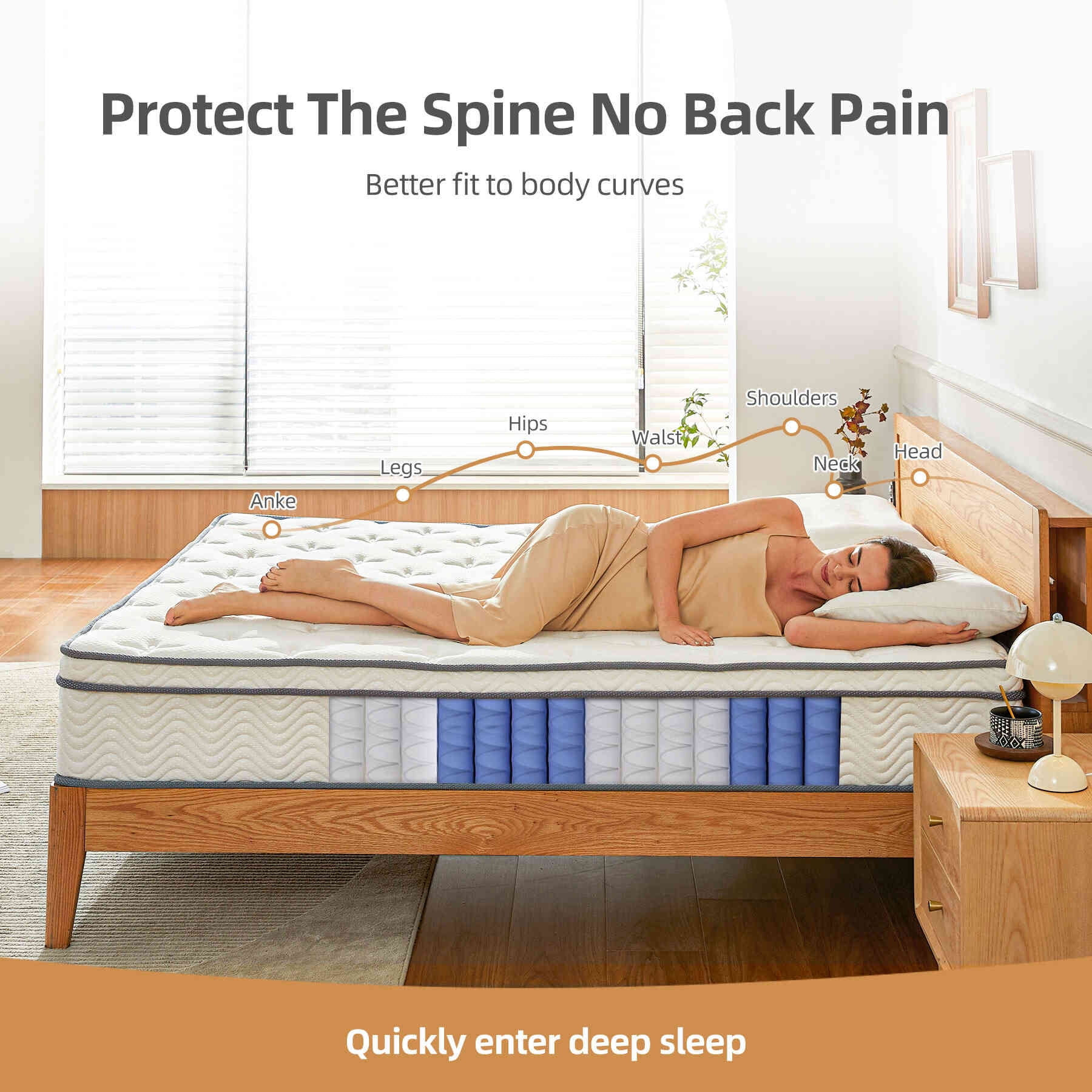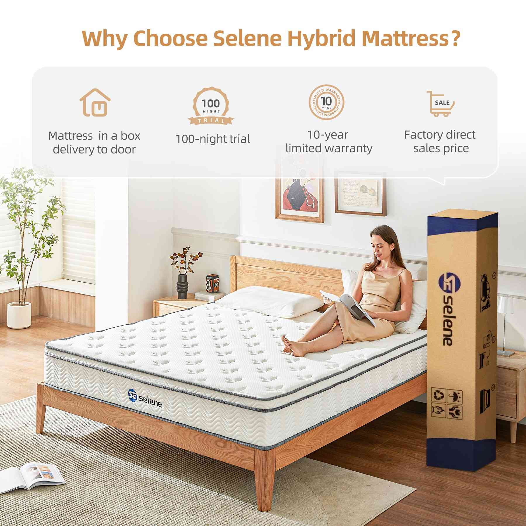 【Skin-Friendly and Breathable】Selene queen mattress adopted 3D soft knitted fabric on the top cover which is breathable and moisture-absorbing, the memory foam inside hybrid mattress is CertiPUR US Certified for safety & durability, friendly for all people including pregnant and kids, you can sleep on this queen size mattress with confidence. 【Pocket Spring for Better Support】This innerspring mattress constructed by hundreds of individual pocketed spring coils which offers you with enough support from head to toe and the hybrid construction create comfortable feel, no worry about sagging. 【Motion Isolation for Soundly Sleep】The pocket spring in mattress work independently, it tends to reduce noise and isolate motion when you move, effectively avoid movement interference between partners, create a quiet and undisturbed sleep with this hybrid memory foam mattress. 【Suitable for All Sleepers】Selene queen size mattress is ergonomically designed to conform your curves and keep spinal alignment, relieve pressure points and let go of your fatigue. The comfort memory foam layer can support your body in every position to provide a whole night of peaceful sleep, it is ideal for all body types and sleep styles. 【Mattress in a Box】Selene mattresses ships compressed, rolled, and boxed in packaging. Simply unbox, unroll and safe to sleep on, please wait 48-72 hours to fully expand and any potential odor to dissipate. You will get 100 nights trial. We commit to offer you a good sleep, please feel free to contact us at any time for support.