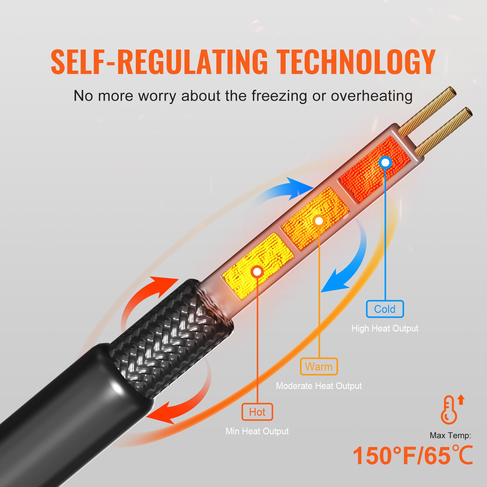 VEVOR Pipe Heating Cable: If you are bothered by the destructive ice dams on the roof, or you want to keep water flowing in winter – our electric water pipe heat cable is what you need! VEVOR 100FT roof heating cable with self-regulating technology can automatically adjust its temperature depending on ambient temperatures;; [Package Content] 50PCS x Clip & Spacer
