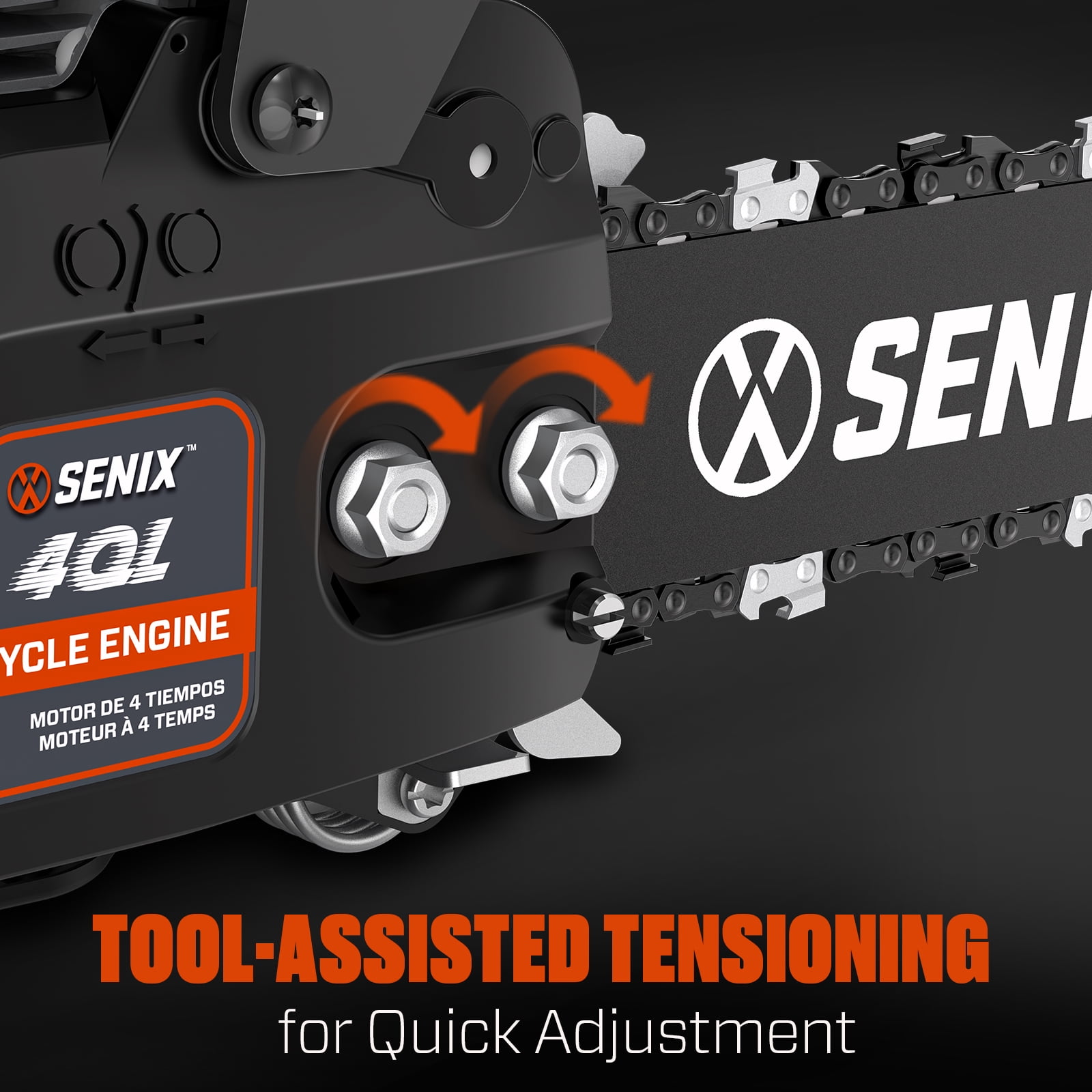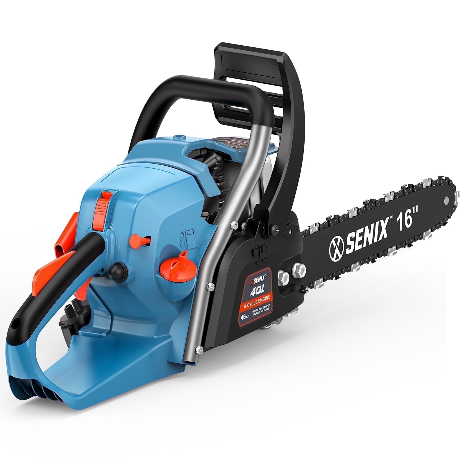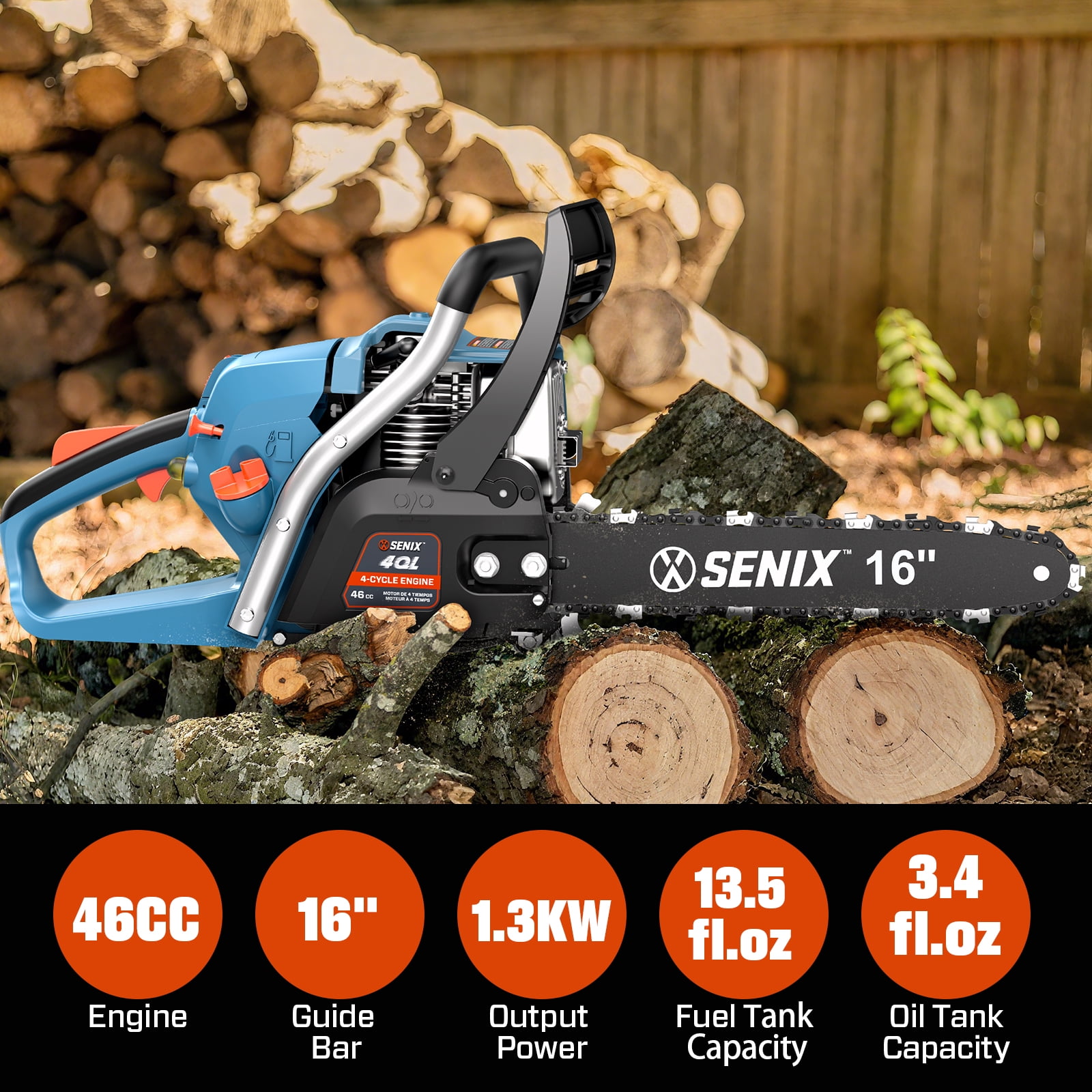 Simplify yard work with the SENIX 16-Inch 46cc 4-Cycle Gas Chainsaw, ideal for trimming limbs, small branches, and trees. Its 16-inch bar and chain deliver aggressive, smooth cutting, while auto-choke and compression release ensure easy starting. The full crank 46cc 4-cycle engine offers strong power with low vibration—no gas-oil mixing needed, and lower emissions than 2-cycles. Patented 4QL Technology enables all-directional use (no stalling/oil leakage) and keeps the motor lubricated. Features include a loop handle for 360°maneuverability, automatic oiling system, and included bar/chain cover for safety. Skip tedious maintenance with this handy tool. Specifications: 4QL Engine: 4-Cycle/ 46cc Bar Length: 16″ Chain speed: 59.06 ft/s(18 m/s) Chain Pitch:3/8″ Chain Gauge:0.05″ Number of Drive Links:57 Power Source: Gas Fuel Tank Capacity: 13.5 fl.oz Oil Tank Capacity: 3.4 fl.oz Engine Power: 1.3kW (1.74 hp) Rotating Speed: 7500 RPM Weight: 12.6 lbs