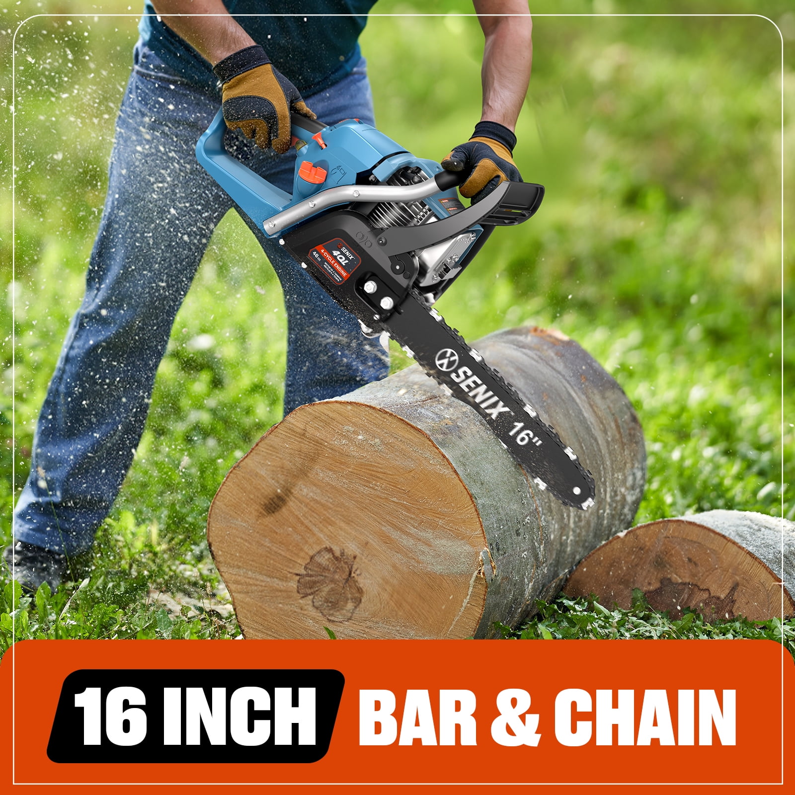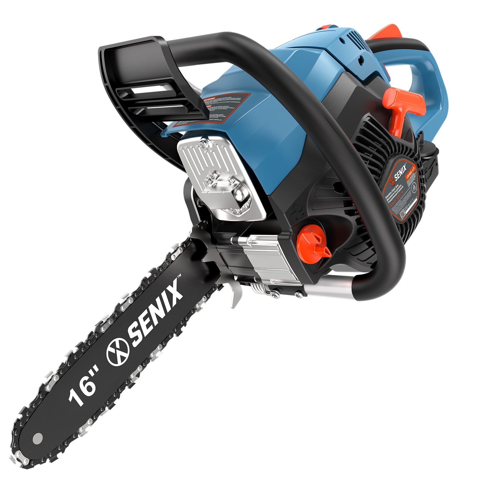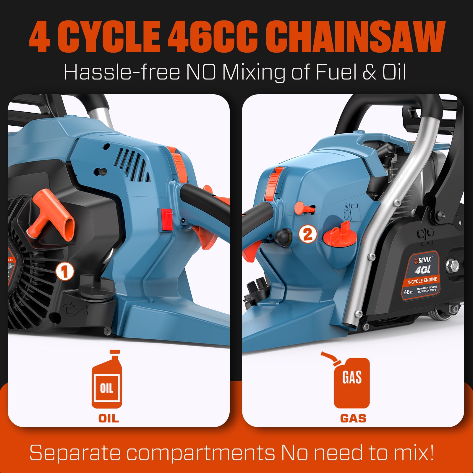 Simplify yard work with the SENIX 16-Inch 46cc 4-Cycle Gas Chainsaw, ideal for trimming limbs, small branches, and trees. Its 16-inch bar and chain deliver aggressive, smooth cutting, while auto-choke and compression release ensure easy starting. The full crank 46cc 4-cycle engine offers strong power with low vibration—no gas-oil mixing needed, and lower emissions than 2-cycles. Patented 4QL Technology enables all-directional use (no stalling/oil leakage) and keeps the motor lubricated. Features include a loop handle for 360°maneuverability, automatic oiling system, and included bar/chain cover for safety. Skip tedious maintenance with this handy tool. Specifications: 4QL Engine: 4-Cycle/ 46cc Bar Length: 16″ Chain speed: 59.06 ft/s(18 m/s) Chain Pitch:3/8″ Chain Gauge:0.05″ Number of Drive Links:57 Power Source: Gas Fuel Tank Capacity: 13.5 fl.oz Oil Tank Capacity: 3.4 fl.oz Engine Power: 1.3kW (1.74 hp) Rotating Speed: 7500 RPM Weight: 12.6 lbs