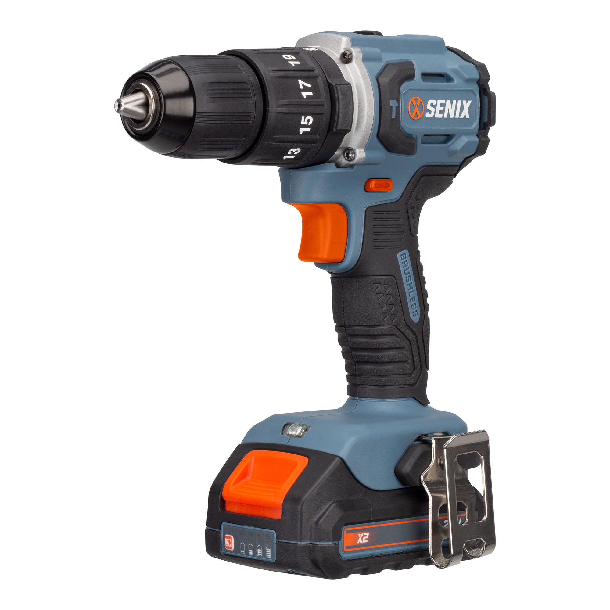 Senix PDHX2-M2 20V Max Brushless Drill Driver, 2.0Ah, 45 ft-lbs, 2200 RPM High performance with a 2-speed gear box delivering up to 45 foot-pounds of torque, 2200 RPM, and 34,000 IPM Durable 1/2-inch keyless, ratcheting chuck for increased strength and longevity Powerful 20 Volt Max* brushless motor for efficient performance and extended runtime Versatile 19-position clutch and 2-speed gear box to accommodate various drilling and driving tasks Ergonomic and compact design enhances user comfort during extended use 3-mode bright LED light with On/Off button for improved visibility in low-light conditions Includes belt clip, Phillips head driving bit, 20V Max* 2.0 Ah lithium-ion battery, and 20V Max* 2 Amp lithium-ion battery charger