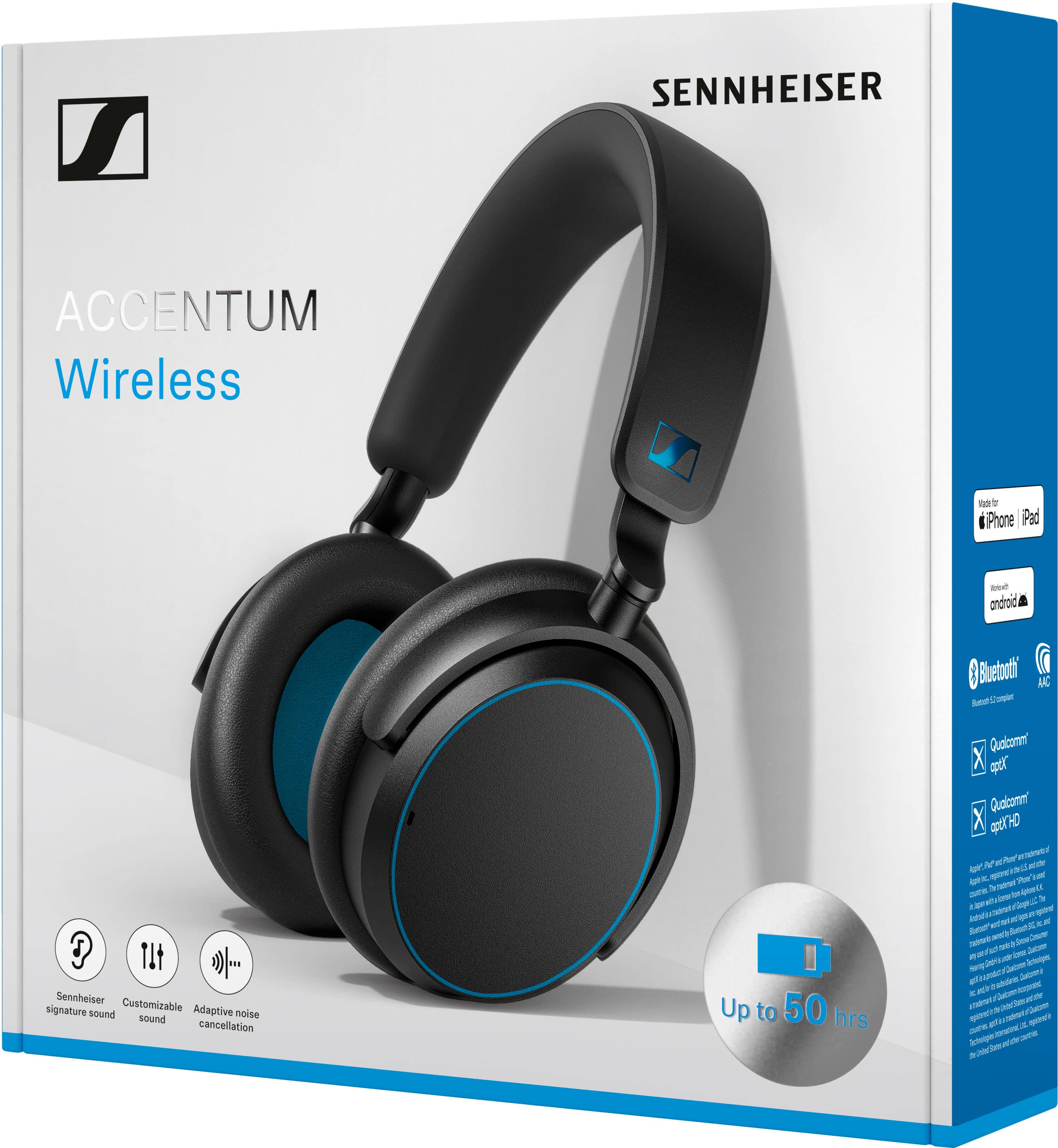 No matter how fast life moves, you can take it all with ACCENTUM Wireless – the perfect, on-the-go headphone for every journey. Experience high-quality, take-anywhere wireless audio with an unrivaled 50-hour battery playtime and hybrid ANC for distraction-free enjoyment throughout your day. ACCENTUM’s listening experience is elevated by the captivating, high-quality sound delivered by Sennheiser’s meticulously engineered transducer system. This fantastic audio can be personalized with sound modes, including Bass Boost or Podcast mode, or precisely tailored via the built-in 5 Band equalizer. Take on any environment without distraction with the hybrid ANC, which lets you listen on your terms, even in busy outdoor environments or crowded places. Need to hear your surroundings without removing your headphones? Transparency mode lets in external sounds at a touch. ACCENTUM gives you fuss-free, everyday simplicity and effortless ease of use. Control is direct and intuitive, with dedicated buttons and one-touch voice assistant access. From your morning commute to your late-night chillout, ACCENTUM keeps you incredibly comfortable thanks to its lightweight, ergonomic design and soft-touch headband. Thanks to robust Sennheiser build quality, fold-flat design for easy portability and fast USB-C charging, it’s ready for every day’s adventures.