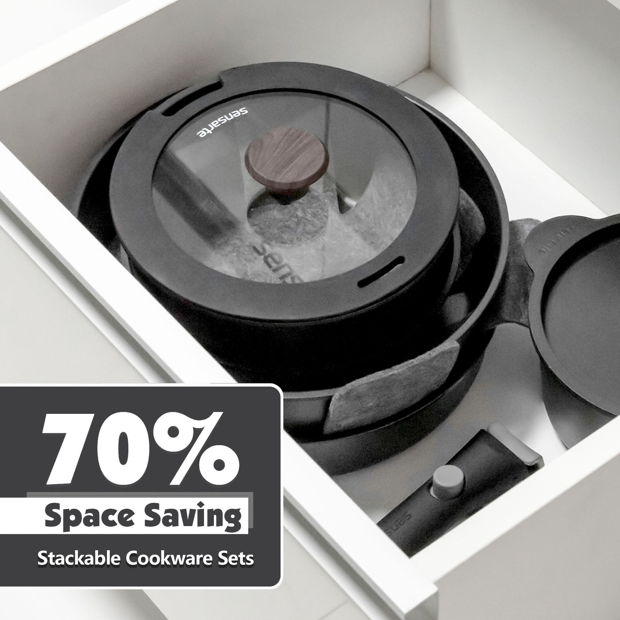 SENSARTE Nonstick Pots and Pans Set with Detachable Handle, 18Pcs Induction Kitchen Cookware Set Stackable, Dishwasher/Oven Safe(Black)