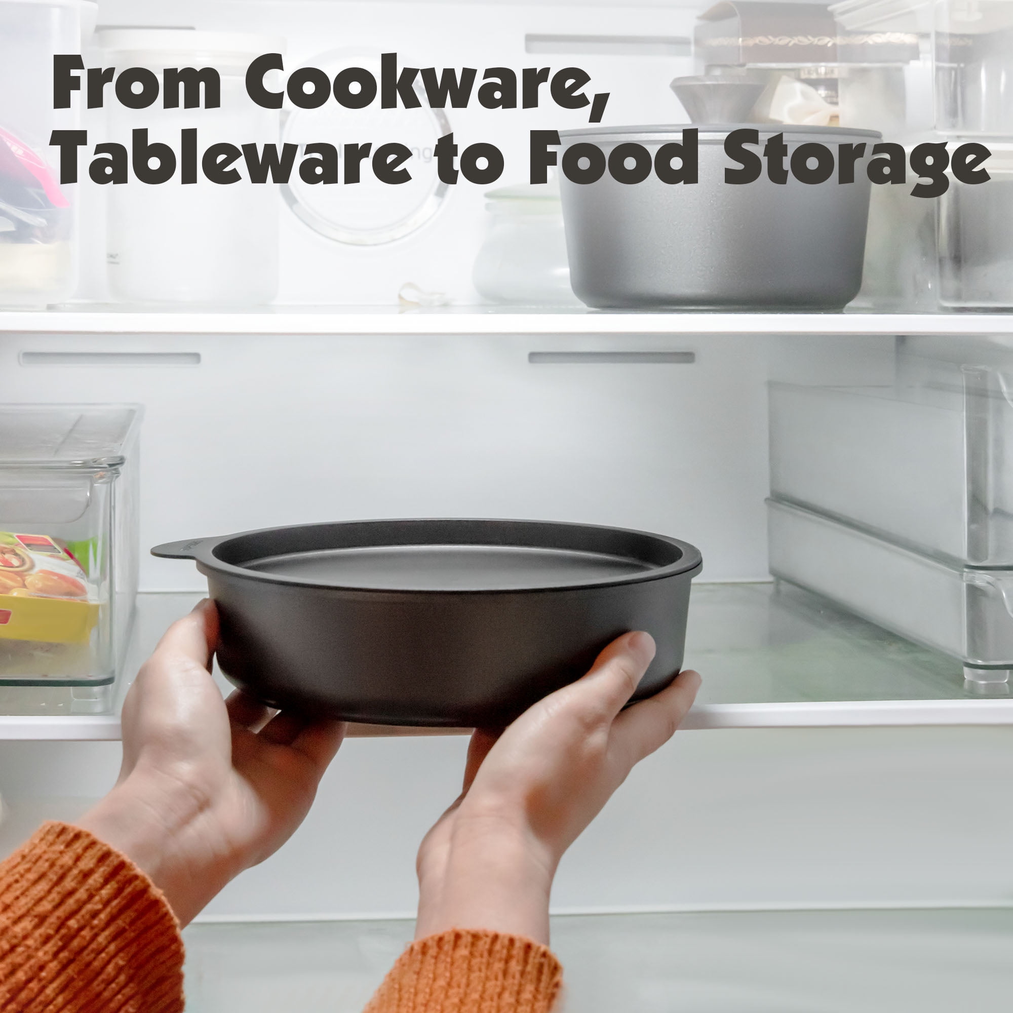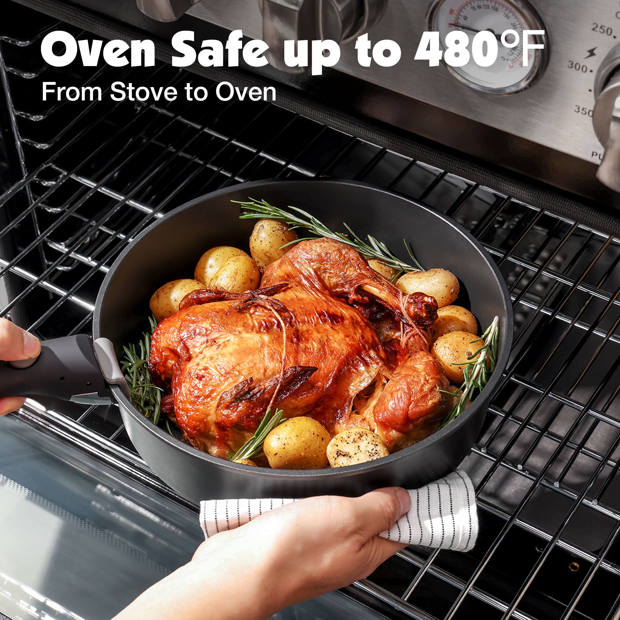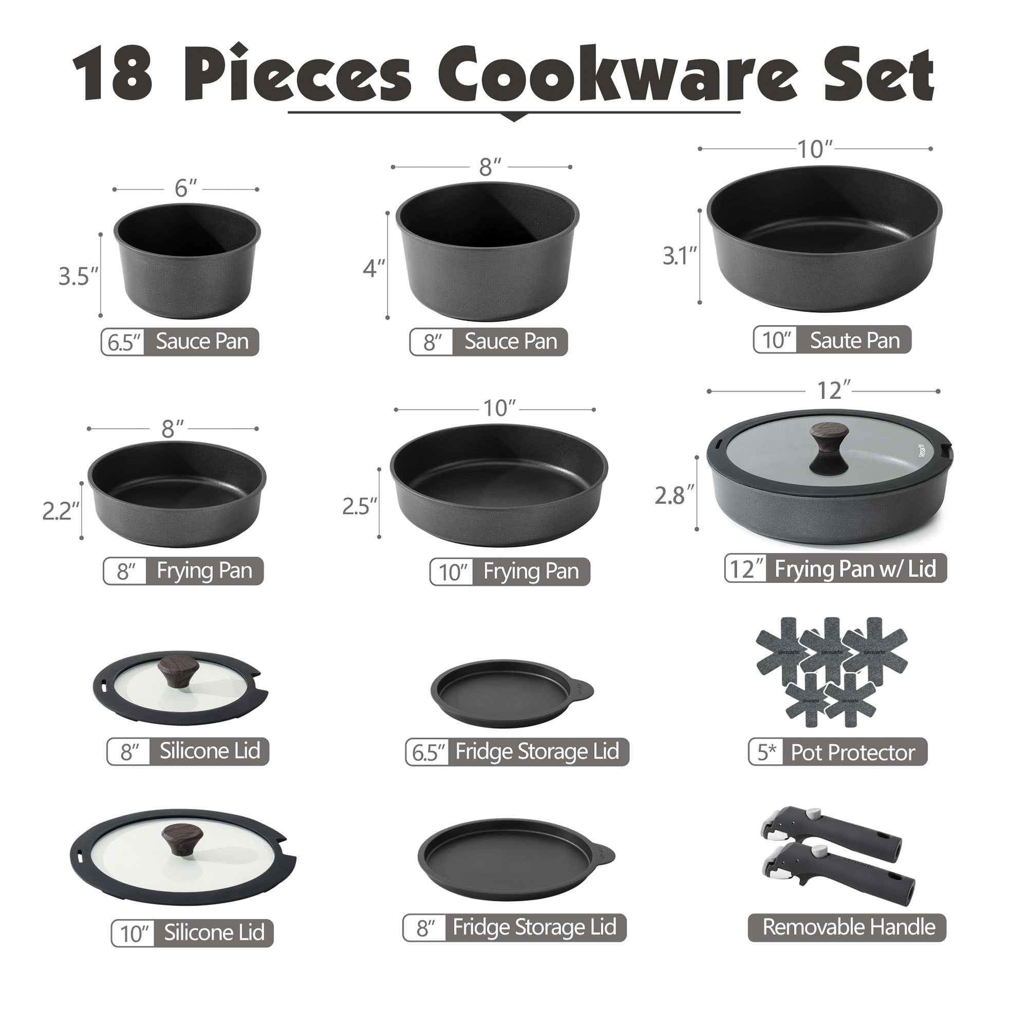 The removable handle coming with the cookware sets can withstand a weight of up to 22 lbs which can be safely used for cooking a variety of ingredients. Anti-Oxidation Coating: The full-body coating prevents oxidation and blackening, keeping your pot looking new for longer. Works on All Stoves: The magnetic stainless steel base fits gas, electric, induction, and halogen cooktops. Space-Saving Handle: The removable handle makes storage easy, and free pot holders prevent scratches. Freshness-Locking Lids: Food-grade silicone and airtight lids keep leftovers fresh in the fridge. Oven-to-Table Ready: Oven/Dishwasher safe with a detachable handle—use for cooking, serving, or storage. This 18Pcs Cookware Set includes: 2Qt Sauce Pan, 3Qt Sauce Pan with Lid, 8″ Frying Pan, 10″ Frying Pan, 12″ Frying Pan with Lid, 10″ Saute Pan with Lid, 6.5″ Fridge Storage Lid, 8″ Fridge Storage Lid, 2x Removable Handles, 5x Pan Protectors