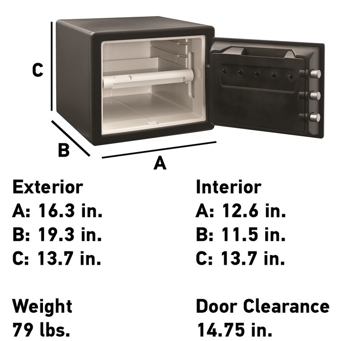 - Exterior: 16.3 in W x 19.3 in D x 13.7 in H; door requires 14.75 in of clearance to fully open; interior: 12.6 in W x 11.5 in D x 9.6 in H; 0.82 cubic foot capacity; weighs 77 Lbs