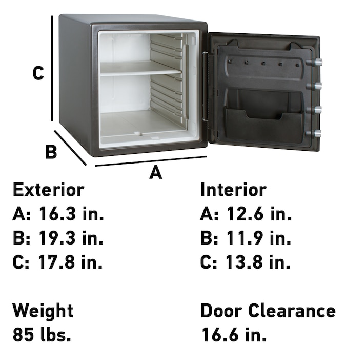 - Exterior: 16.3 in W x 19.3 in D x 17.8 in H; door requires 16.6 in of clearance to fully open; interior: 12.6 in W x 11.9 in D x 13.8 inch H; large 1.23 cubic foot capacity; weighs 85 lbs
