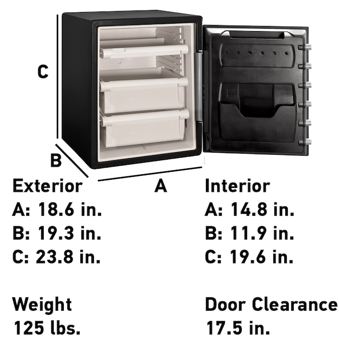 - Exterior 18.6 in W x 19.3 in D x 23.8 in H, door requires 17.5 in of clearance to fully open, interior 14.8 in W x 11.9 in D x 19.6 in H, extra large 2.0 cubic foot capacity, weighs 125 Lbs