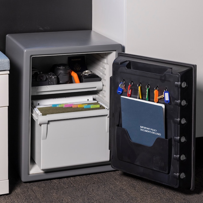 - Set your own digital combination fire safe with secondary locking key for strong security; digital combination safe features six live-locking bolts, pry-resistant hinge bar, tray, and file organizer