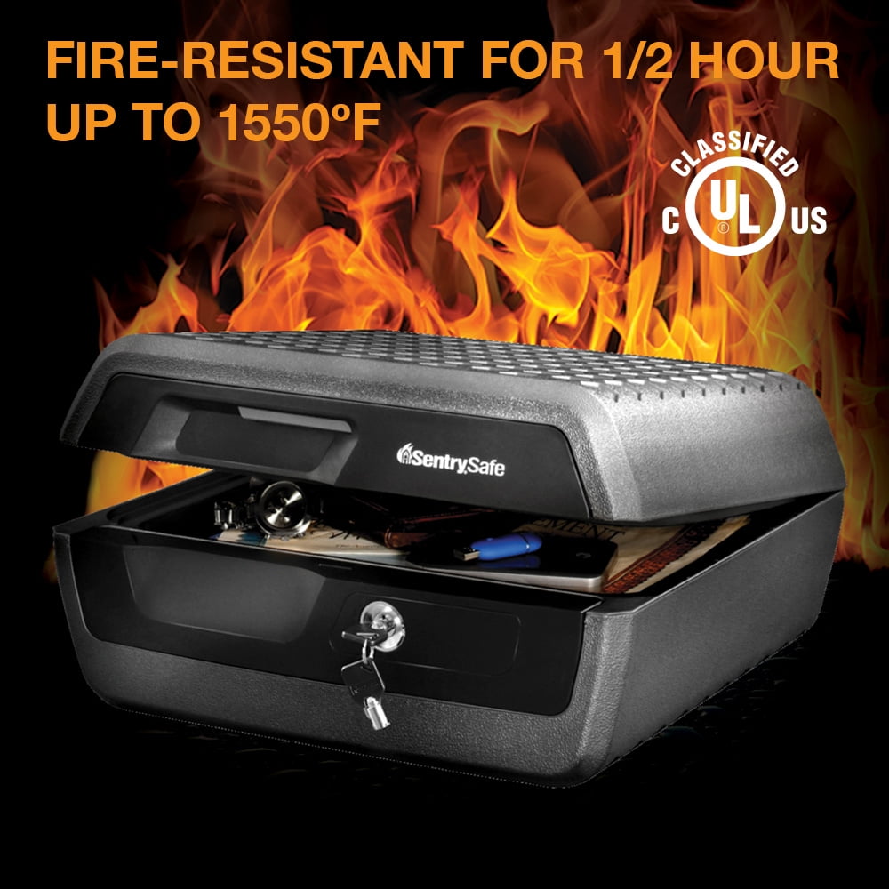 SentrySafe CHW30200 Fire Resistant Box Safe and Waterproof with Tubular Key Lock 0.36 cu. ft.: Fireproof Box Safe is UL Classified to protect your valuables in a fire for a 1/2 hour up to 1550°F (843°C) Waterproof Box is ETL Verified to protect your valuable items from flood damage up to 72 hours Chest features a tubular key to help prevent unauthorized access in case of theft SentrySafe digital media protection is ETL Verified to protect tablets, phones, external hard drives, memory cards, USB drivers, CDs, DVDs and other electronic storage devices Exterior: 7.6 in H x 16.5 in W x 14.8 in D; Interior: 5.4 in H x 12.6 in W x 9.2 in D; Capacity 0.36 cubic feet; weighs 24 pounds