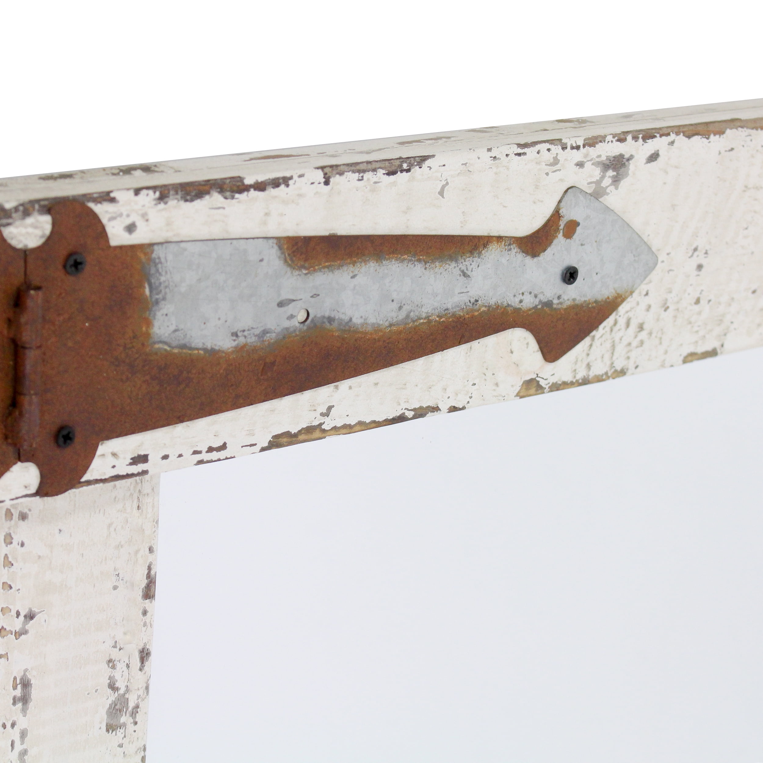This wall mirror is the perfect addition to any rustic or farmhouse style space. Rustic metal arrow hinges add character to the wooden frame with it’s distressed white finish. This mirror works well as a bathroom vanity or simply as an accent mirror for your living space.