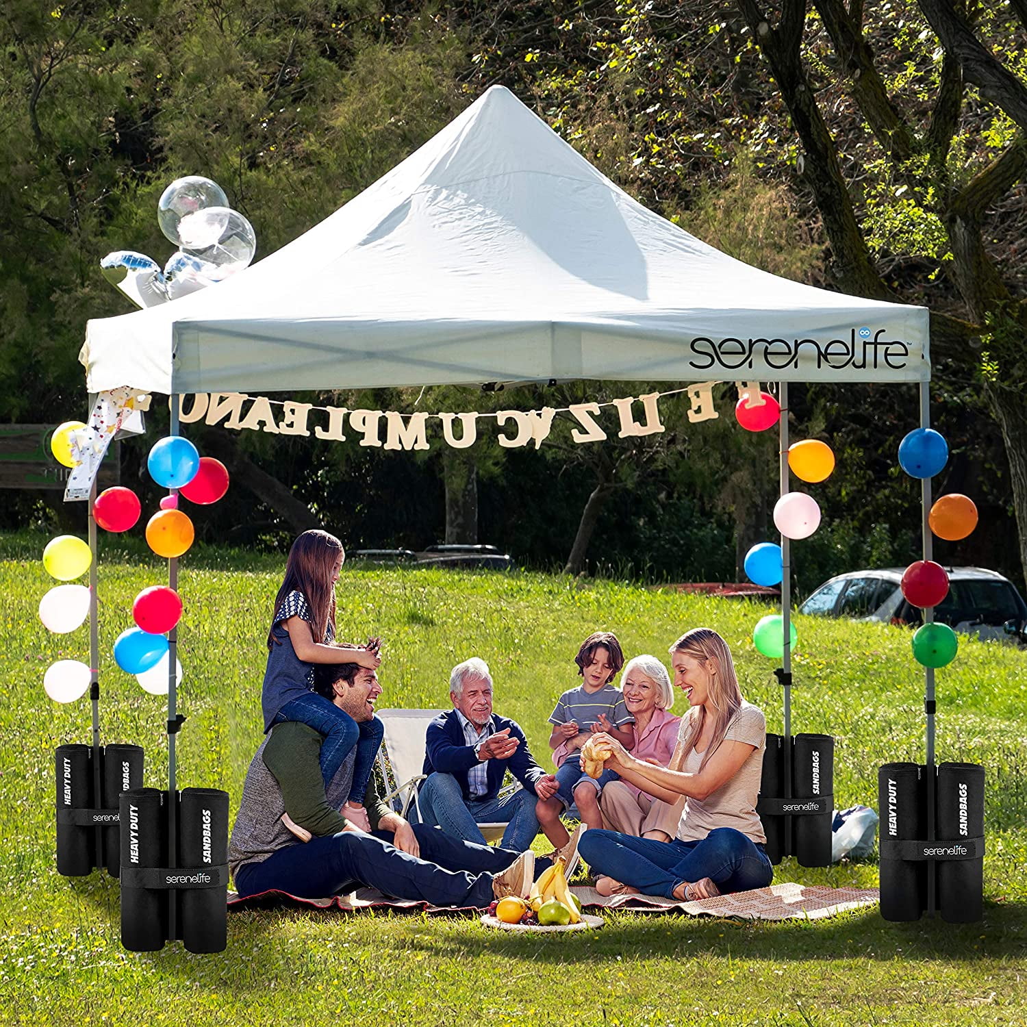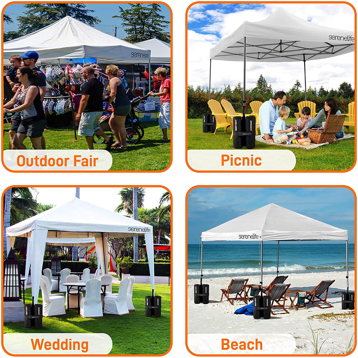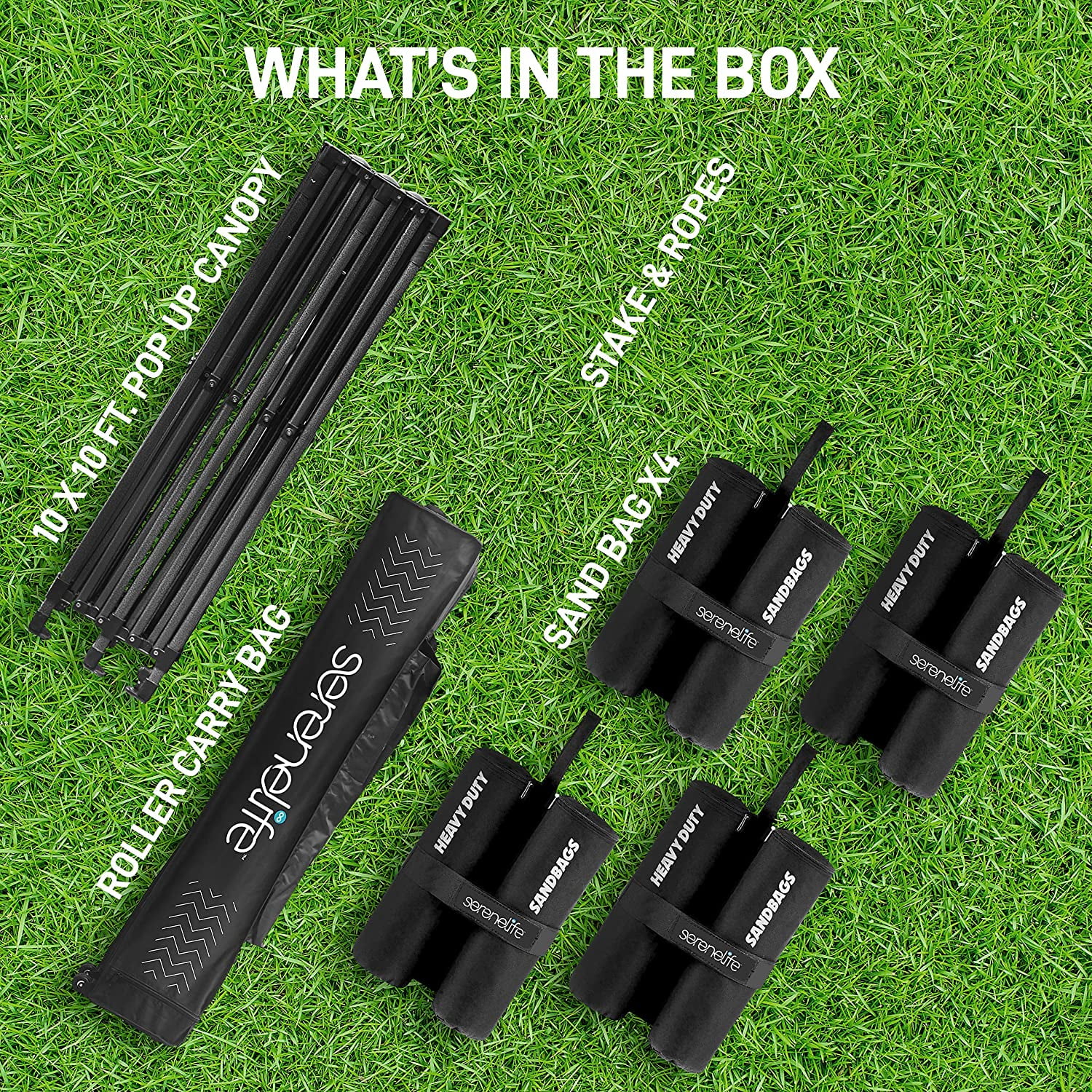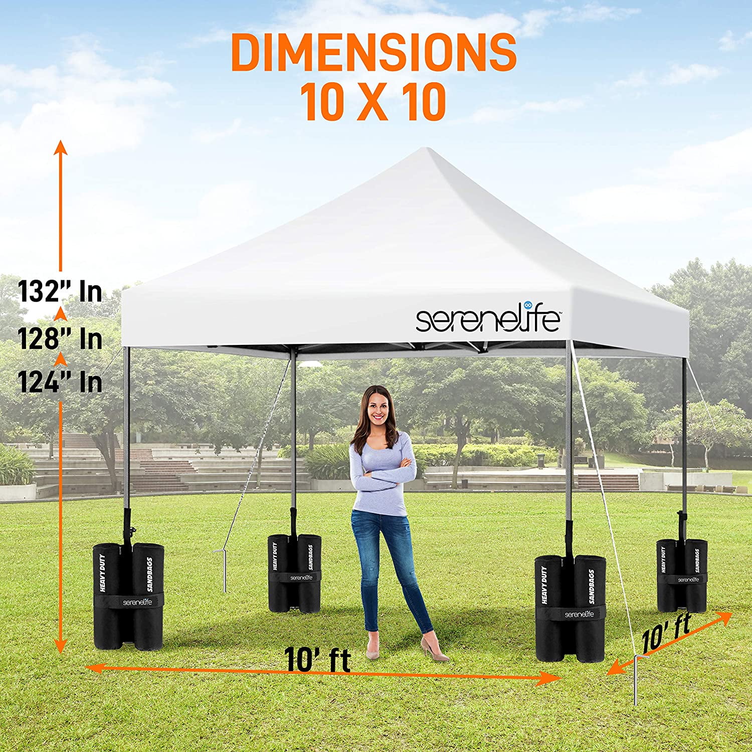 UV PROTECTION: This easy up canopy features a 500D with PU coated polyester that serves as a UV blocker and UPF 50+ from sunshine. The roof is also 100% water-resistant weatherproof making it suitable for sunny & wet rainy seasons. EASY TO SET UP: The SereneLife sport canopy collapsible shade tent instant canopy can be assembled by one person. It is equipped w/ push sliders, height adjustable push-button thumb lock leg extenders and highly attached velcro to keep canopy stick on the frame. 100 SQUARE FEET: SereneLife covered tent canopy has a total assembled size of (LxWxH) 120″ x 120″ x 133″ –inches and provides 100 square feet of shade and UV protection. Can cover 4 tables, 3 beach chairs and 10 people at the same time. MADE TO LAST: The foldable tent canopy features 500 deniers’ waterproof polyester with PU coated top and rust-resistant steel frame with a black powder-coated finish to prevent rust, corrosion, peeling, or chipping so it can withstand repeated use. WHEELED CARRY BAG: This heavy-duty canopy set comes w/ wheel roller carry bag for portability and easy storage, (4) 35 lb. sandbag, & stake & ropes. Perfect for beach, camping, backyard party, picnic, garden wedding event, outdoor sport & more. Care instructions: Hand Wash.