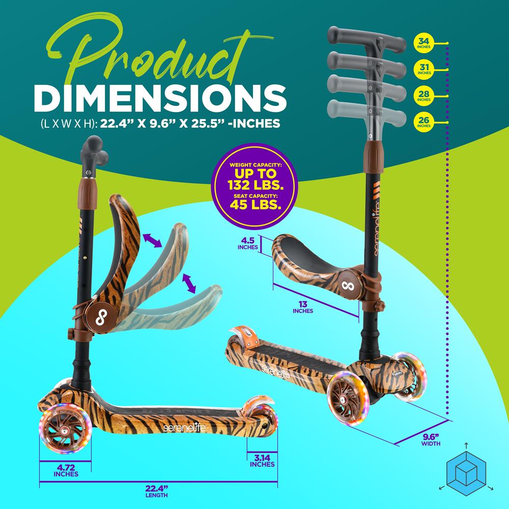 MULTI-COLOR WHEEL LIGHTS: The Infinity 3-Wheel Kick Scooters for Kids feature colorful LED turning wheel lights that light up in a variety of flashing colors as you scoot, adding a fun twist to the ride! It also makes the scooter stand out. SIT OR STAND DESIGN WITH FOOTREST: This SereneLife scooter for toddlers is equipped w/ a unique 45lb capacity removable flip-out seat which kids can use while cruising along with the built-in foot pad. Can be detached when they feel more confident standing up ADJUSTABLE HANDLEBAR: The lightweight and compact kids scooter features an adjustable handlebar w/ 4 height options — 25.5/27.5/31/34 inches, works w/ kids of all ages. Ideal for little ones ages 1 year old and up with a weight capacity of 132 lbs SMOOTH RIDE: The mini toddler trike 3 wheel scooter is equipped w/ anti-slip and wide deck that is large enough to fit both feet. Also has smooth 120mm/80mm gliding roller wheels that run smoothly even on surfaces that are uneven or bumpy LEAN-TO-STEER TECHNOLOGY: Features easy maneuvering w/ lean-to-steer technology, which means the mini scooter is controlled by leaning rather than turning the steering wheel, this design helps your child develop balance skills, coordination and more