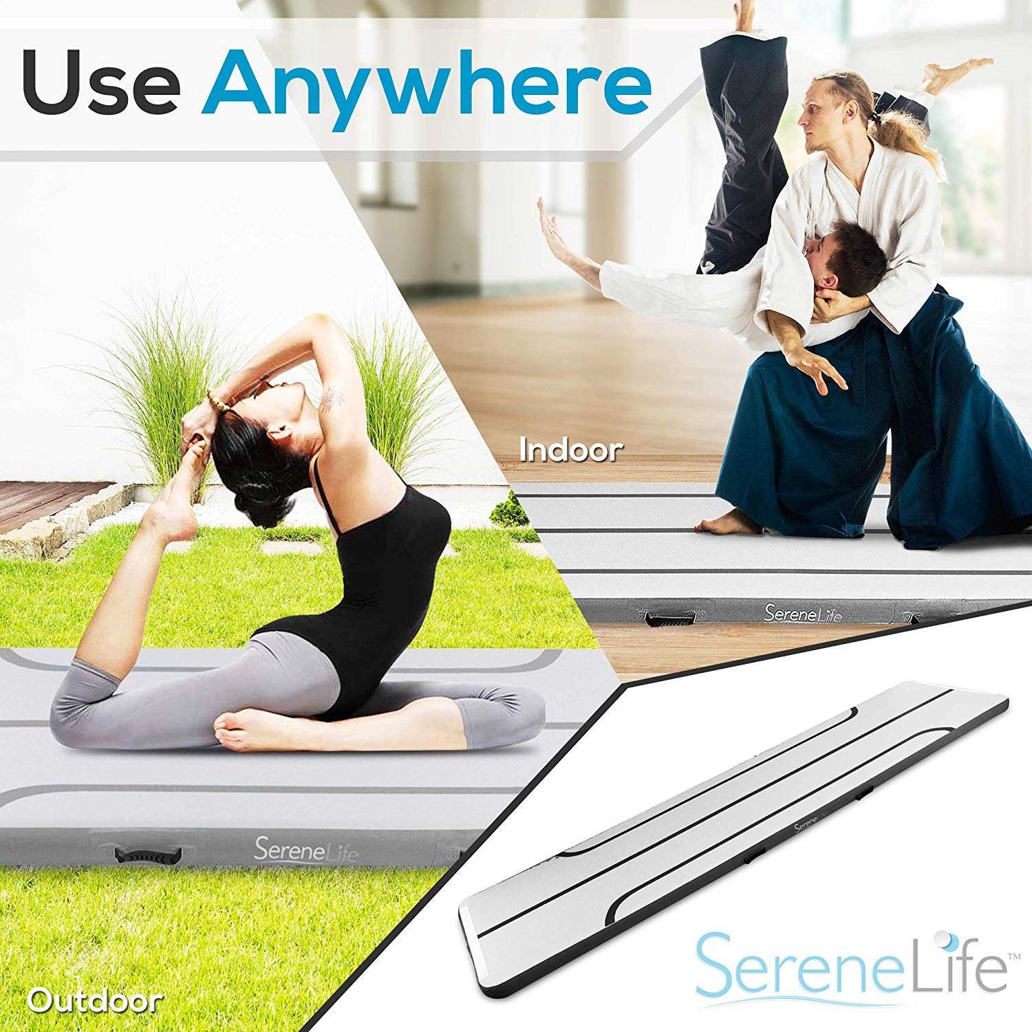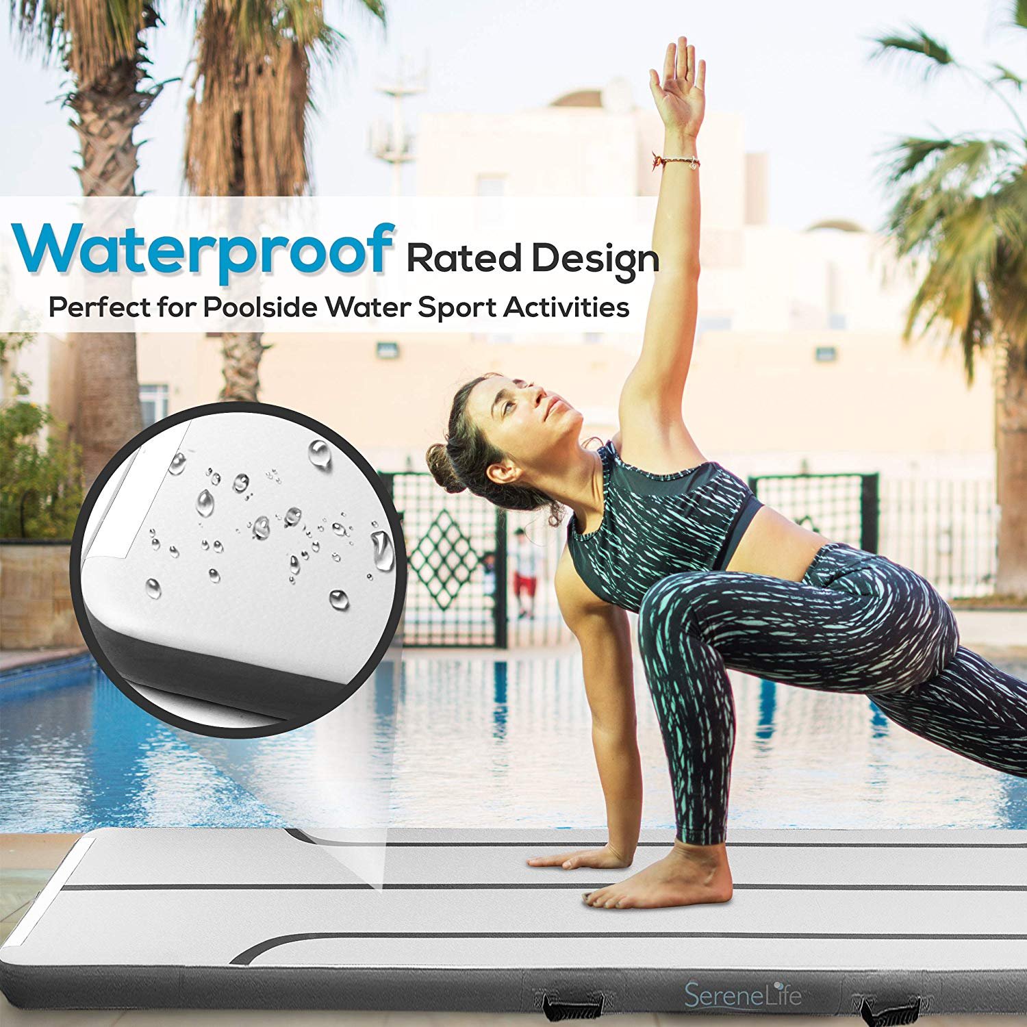 9. 8 FEET LONG: This 9. 8+ feet air mat gymnastics Tumble Track has a total inflated size of 118. 0″ X 39. 4″ X 4. 0″ Inch (lxwxh) and provides extra-wide Track pad cushion for full-body support for the stunt, back handspring, handstand practice, and more. COMFORTABLE AND BOUNCY: The air tumbling track mat inflatable gymnastics mat features a comfortable and bouncy crash tumble mat design perfect for yoga, gymnastics, cheer practice, martial arts training. Ideal for home, fitness gym, park, and beach WATERPROOF GRADE DESIGN: SerenLife inflatable air mat tumble track gymnastics equipment has a waterproof rated design so it can also be used on water as floating beach mat or for any poolside water sport activities. PERFECT THICKNESS: The Tumble Track air mat inflatable tumbling mat is made W/ highly durable puncture-resistant, thick drop stitch, layered reinforced PVC Polyester w/ PVC thickness of 0. 08cm on each side. Great for indoor/outdoor Use QUICK INFLATE ELECTRIC AIR PUMP: This gymnastics air floor mat inflatable gym mat has a quick-access valve cap and comes w/ 120V electric air pump for fast and easy inflating/deflating. Also has handle grips and velcro straps to prevent sliding