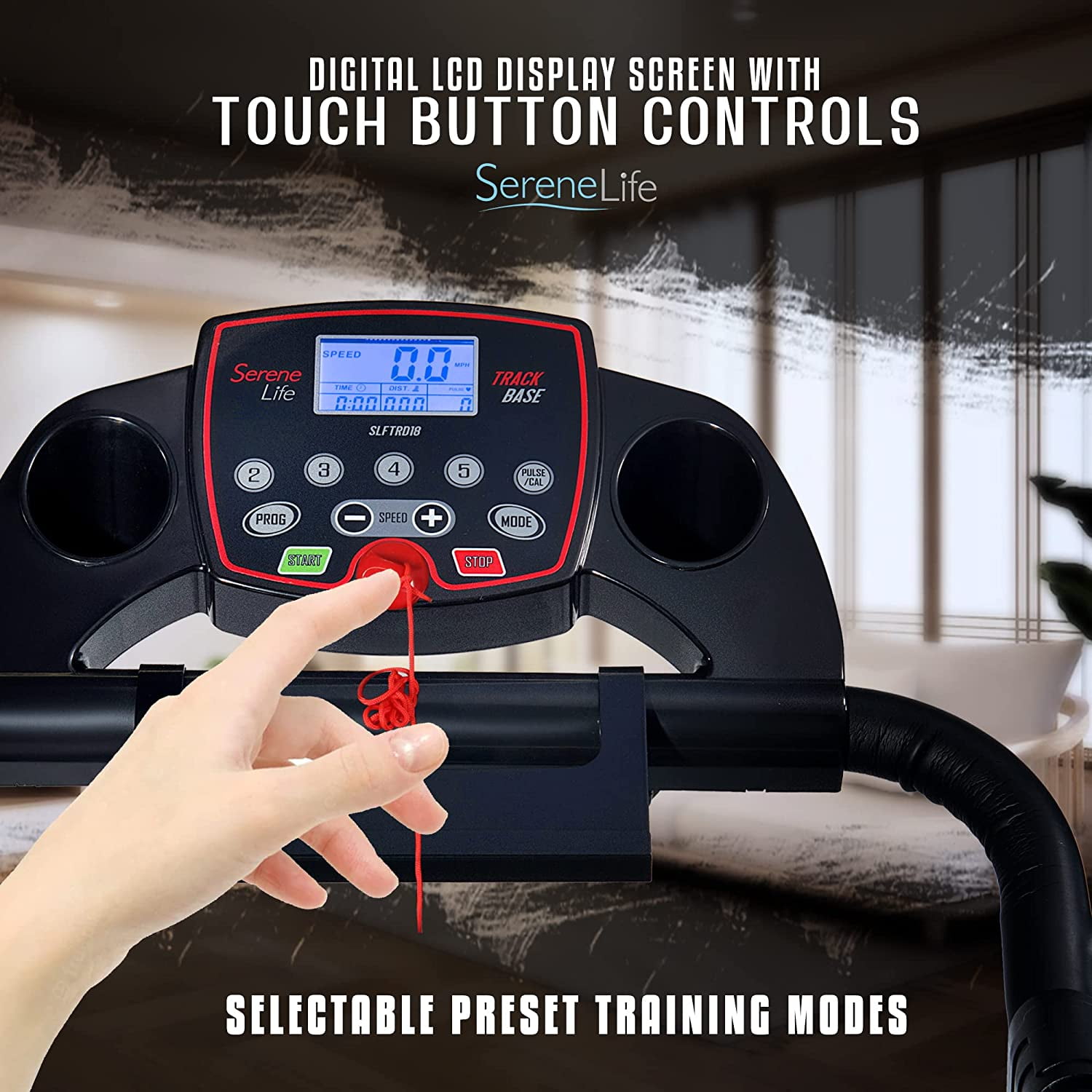 SLFTRD18Digital Smart Treadmill Track Base Smart Digital Treadmill with Downloadable App Features: Smart Digital Treadmill Design Get Connected with the ‘Fit Show’ App Pairs to Your Device via Bluetooth Connectivity Running & Training Data Statistics Readout Compact Form-Fitting Design for Any Room in the House Built-in Hand Grip Sensors for Pulse Monitoring Digital LCD Display Screen with Touch Button Controls Displays Run Time, Distance, Speed, Calories Burned, Heart Rate Adjustable Speed Settings Selectable Preset Training Modes Simple Electric Motorized Plug-in Design Convenient Folding Style for Easy Setup & Storage Used for Walking, Jogging, Running Exercise Training Perfect for Weight Loss, Cardiovascular Fitness, Endurance & Stamina Building Integrated Safety Key, Emergency Power Off Removable Book / Tablet Device Holder*Some Assembly Required The ‘Fit show’ App: Train Smarter and Connect via Your Favorite Device Works with Smartphones, Tablets, Laptops, etc. Free to Download via Your Smartphone Multifunctional Sports App Connect to the Treadmill via Bluetooth App Provides Access to Exercise Activities Linked to ‘HealthKit’ to Record and Collect Activity Data Easily Share Health and Fitness Data via social media Available for iOS and Android Bluetooth Connectivity: Hassle-Free Pairing, No Password Required Compatible with All of Today’s Latest Bluetooth Devices (Smartphones, Tablets, Laptops, Computers, etc. )Bluetooth Version: 4. 0 BLE Technical Specs: Motorized Treadmill Motor Power: 1. 0HPRunning Belt / Running Surface Size (L x w): 39. 3’’ x 13. 4’’ -inches Adjustable Speed: 0. 6 – 6. 0 MPH (Up to 10 KMH)Maximum Weight Support: Up to 265 lbs. Power Supply: 120VThe SereneLife Track Base Smart Digital Treadmill with Downloadable App – Smart Digital Treadmill Design – Get Connected with the ‘Fit Show’ App – Pairs to Your Device via Bluetooth Connectivity – Running & Training Data Statistics Readout – Compact Form-Fitting Design for Any Room in the House – Built-in Hand Grip Sensors for Pulse Monitoring – Digital LCD Display Screen with Touch Button Controls – Displays Run Time, Distance, Speed, Calories Burned, Heart Rate – Adjustable Speed Settings – Selectable Preset Training Modes – Simple Electric Motorized Plug-in Design – Convenient Folding Style for Easy Setup & Storage – Used for Walking, Jogging, Running Exercise Training – Perfect for Weight Loss, Cardiovascular Fitness, Endurance & Stamina Building – Integrated Safety Key, Emergency Power Off.