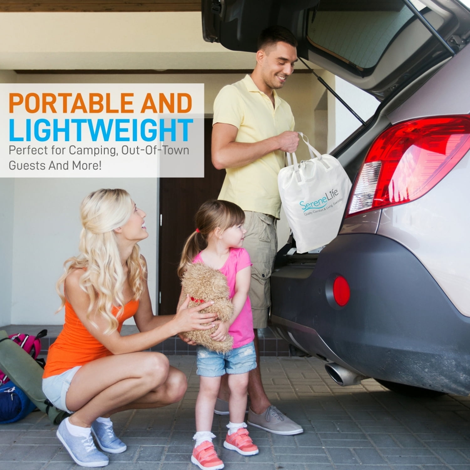 Comfortable and portable mattress for traveling, camping, overnight guests, and more Full-size mattress made from thick PVC with a soft, premium flocked sleeping surface Built-in high-output AC pump effortlessly inflates the mattress in just minutes Flocked top helps ensure your sheets won’t shift or bunch during slumber Storage bag and 2 repair patches are included for storage and maintenance Supports up to 500 pounds, perfect for kids and adults alike PVC Thickness: 0.02 inches Weight Capacity: 500 pounds Color: Gray Dimensions (L x W x H): 73 x 53 x 17 inches (Deflated) Dimensions (L x W x H): 75 x 55 x 18 inches (Inflated) Weight: 20.75 pounds Manufacturer warranty: 1-year warranty
