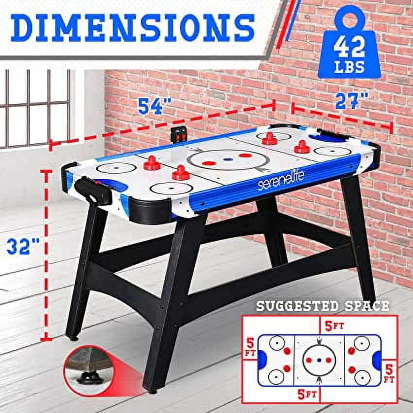 A 12V FAN POWERED SURFACE: With the 12V fan motor that pushes air on the surface, game nights with our hockey table will have a smoother gliding effect during the game. The surface is also durable and scratch resistant, ready for a longer gameplay. DIGITAL LED SCOREBOARD: Featuring a digital and electronic led scoreboard with a built-in score tracker and puck dispenser, game nights with the air hockey table will be fun. It also comes with adjustable foot caps, leverers and crossbar leg support. PERFECT FOR FAMILY GAME NIGHTS: Game nights will be more enjoyable with our 54″ SereneLife Air Hockey Table, ideal for any game room, indoor or outdoor. Play and enjoy with our hockey table, and it will undoubtedly become a favorite during game nights. MID-SIZE ARCADE TABLE: With the 54 inch and 4.5 ft game table with stylish design and fun colors, game nights will be much more enjoyable. Assuring a compact, high quality and a sturdy construction, game nights with the family can last longer. ACCESSORIES INCLUDED: A complete package that comes with 4 pushers and 2 pucks, the game table are all set up and ready to play. Our air hockey board game table is perfect for a friendly and enjoyable 2v2 gameplay, suitable for both kids and adults.