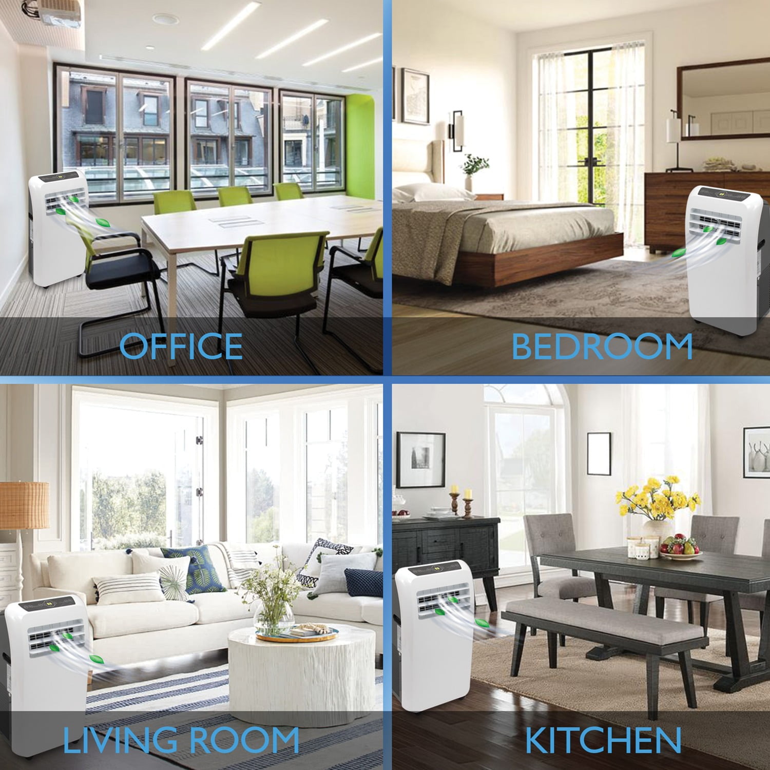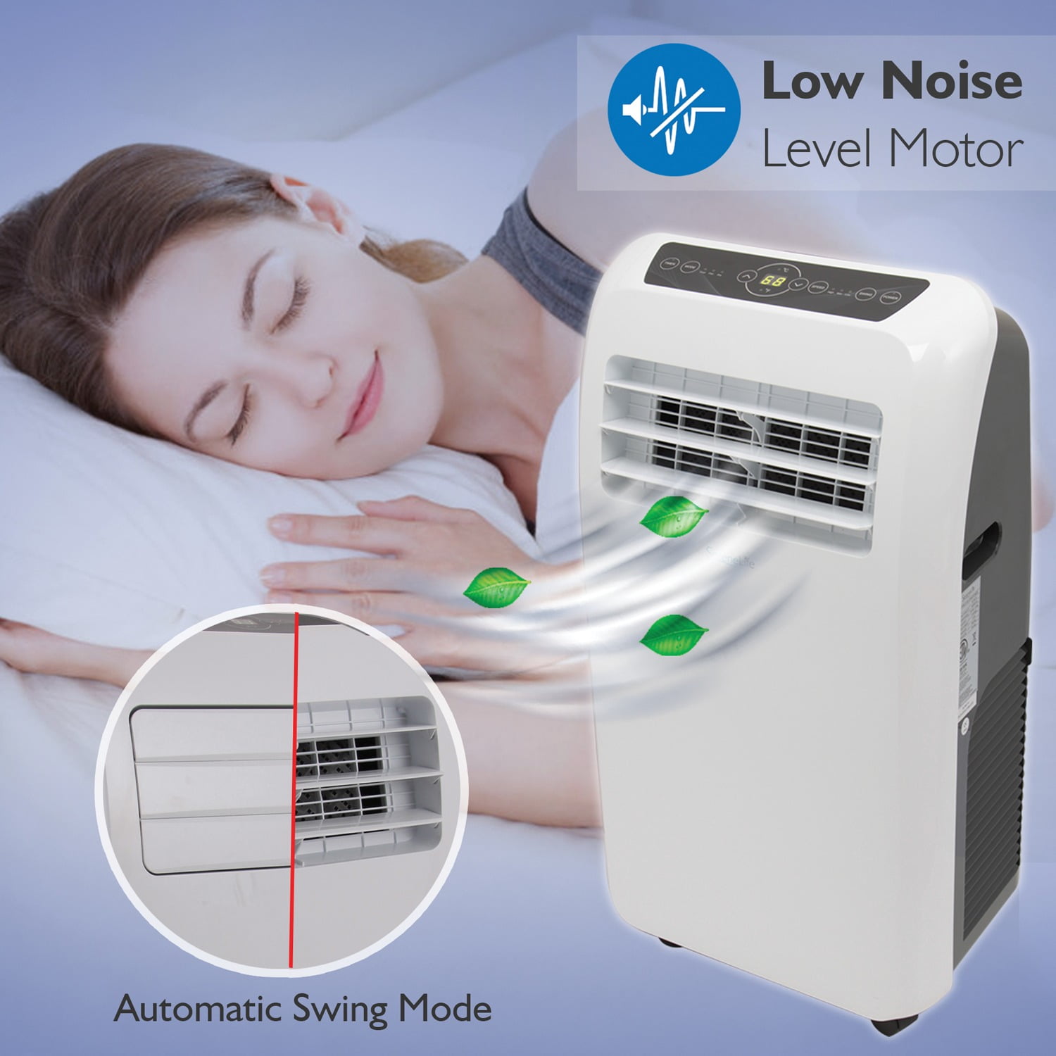 Get comfort any time of year with this free-standing air conditioner, heater, and dehumidifier combo Cools and heats rooms up to 325 square feet 4 operation modes including AC cool, heat, dehumidifier, and fan with temperature control and 3 fan speed adjustments Includes remote control, exhaust hose, and universal window mount exhaust kit Simple electric plug-in operation with 12,000 BTUs of cooling and heating power Pumps up to 3.8 pints of water per hour Adjustable 24-hour timer customizes to your schedule and automatic swing mode provides optimal air circulation Low noise-level motor Sleek, modern design with digital touch panel, compact and portable with rolling wheels Removeable, washable filter screen provides easy maintenance 4.3-foot power cord allows for ample range of movement Rated power: 1350 watts Airflow: 223 CFM Operating noise level: 56 to 59 dBA Fan settings: Low/medium/high Construction material: Engineered ABS housing Remote control battery type: 2 x AAA batteries, included Power supply: 120 volts Color: White Dimensions (L x W x H): 17.4 x 13.4 x 32.1 inches Weight: 70.3 pounds Manufacturer warranty: 1-year warranty