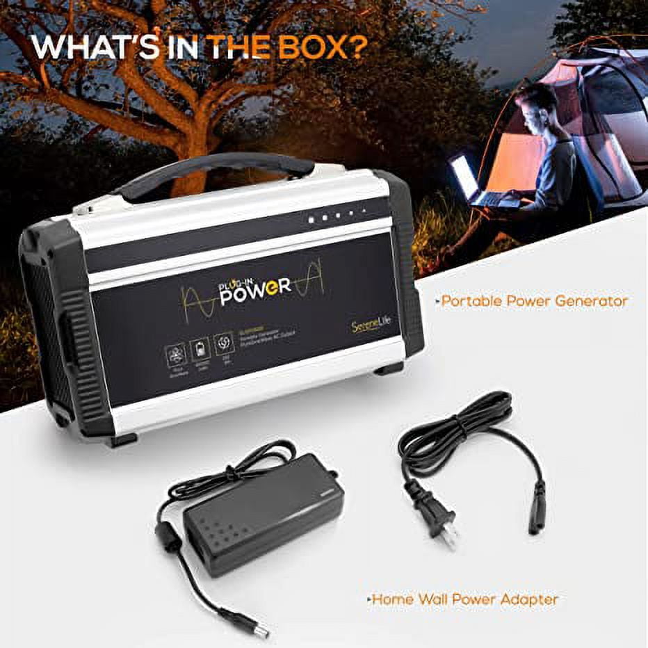SereneLife portable charger power: 60,000mah capacity, 222-watt, 3.7v lithium polymer for power & device charging. the compact power supply has a variety of outputs including 120v ac outlet inverter, dc outputs & dual USB device charge ports for simultaneous charging. compatible with solar panels: power charging station for emergency, camping, & other outdoor trips. this portable power pack supply is compatible with solar panel generators & comes with simple electric plug-in design. 3-prong plug power outlet: this silent and gas-free power generator comes with a standard 3-prong outlet which works with plugs from other countries. charging the system is easy via the included wall power adapter 222 watts. works with multiple devices: compatible with various devices such as phones, tablets, laptops, cameras, and running lights. it is suitable with small home appliances as well. weighs 3.3lbs, fits perfectly in the backpack for long road trips. guaranteed safe to use advanced safety operations such as emergency light button switch, voltage control & short circuit/overpower protection. this power bank also has a battery level indicator for easy monitoring.