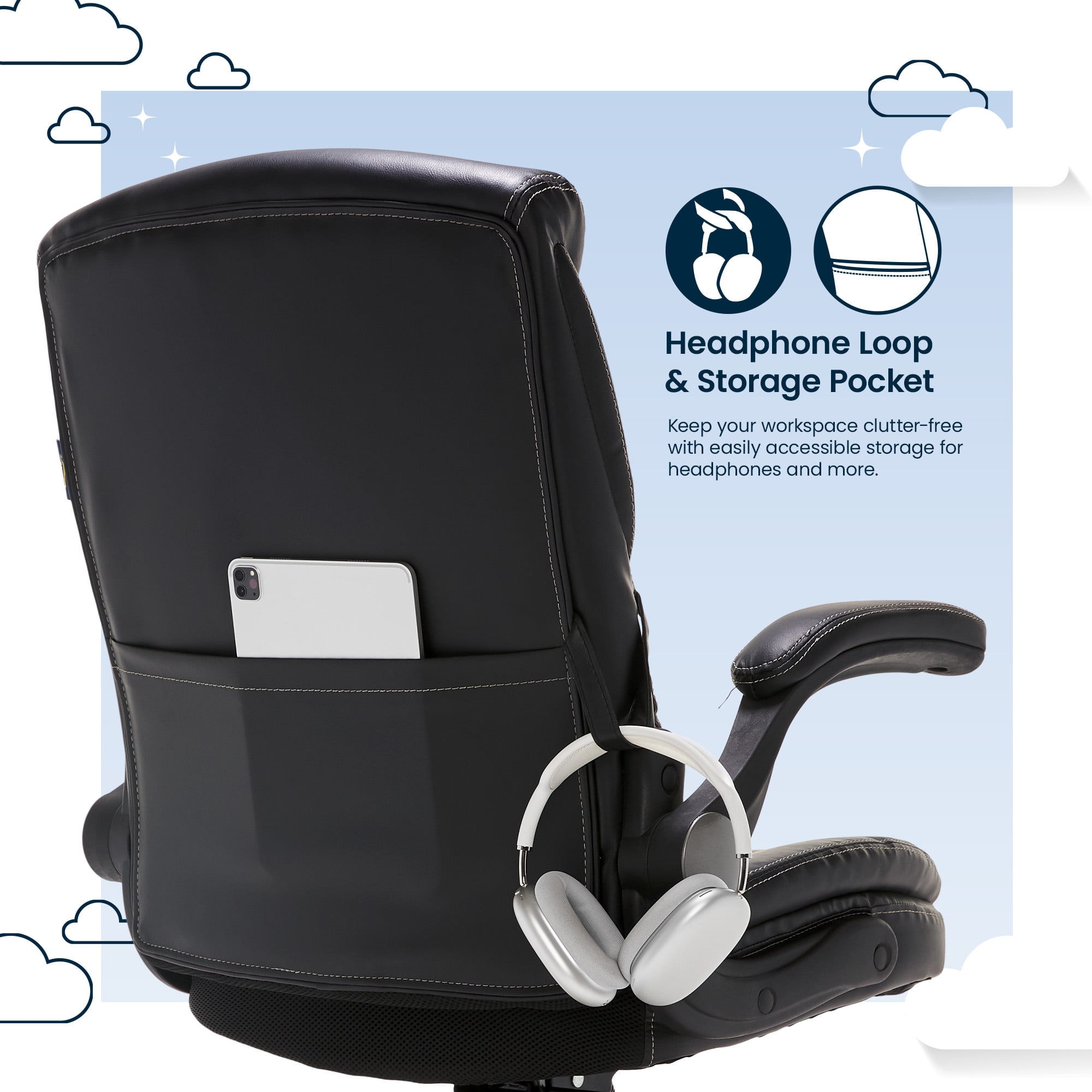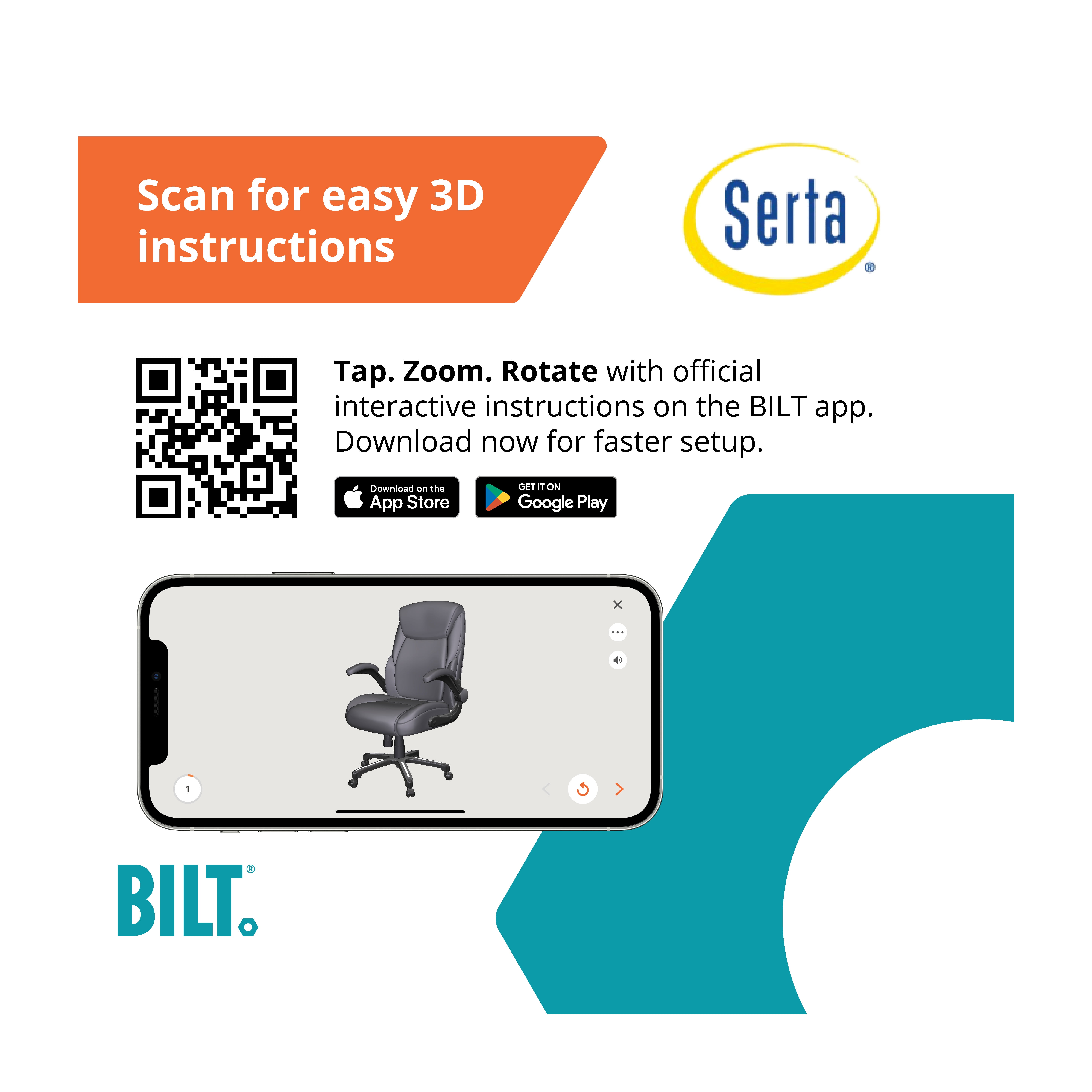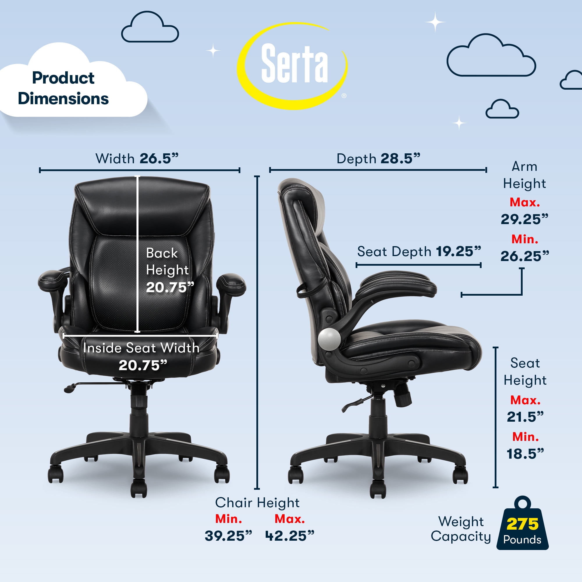 The Serta Manager’s Office Chair is the ideal desk chair for creating style and comfort in your work space Made with individual coils and supportive memory foam in seat for comfort that lasts all day Stylish black, gray or brown bonded leather upholstery options Deep and supportive AIR lumbar on the back and seat flexes and pivots with your body, providing continuous support Ergonomic flip-up armrests keep you comfortable while doing computer work, writing or gaming Customize the way you sit with the gas lift adjustable seat height Features tilt and tension controls 5 Caster wheels make rolling smooth and easy Easy swivel ability for convenient mobility Perfect for any office or home Conveniently placed rear pouch for storage and a headphone loop Assembly Required Chair Dimensions: 26.5in W x 28.5in D x 39.25in – 42.25in H (67.31cm W x 72.39cm D x 99.69cm ? 107.31cm H) Product Weight: 48.9 lb (22.18 kg) Packaging Dimensions: 26″ L x 15.25″ W x 24.25″ H Packaging Weight: 48.94 lb (22.2 kg) Model #: 49987, 49987-B, 49987-C