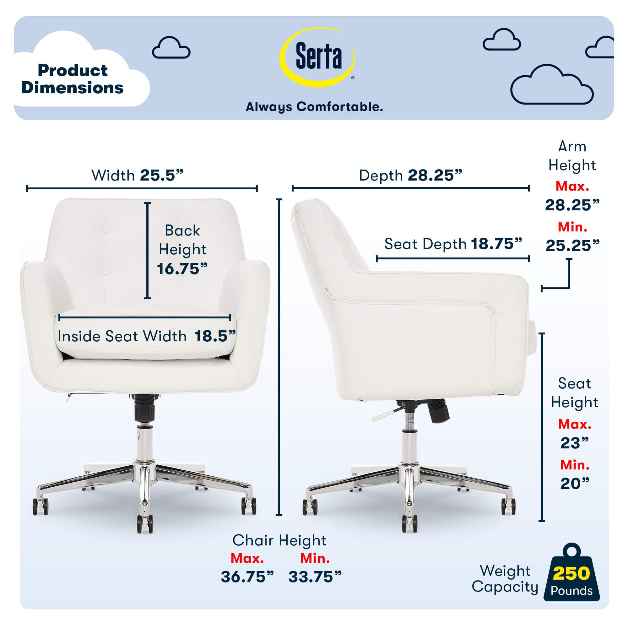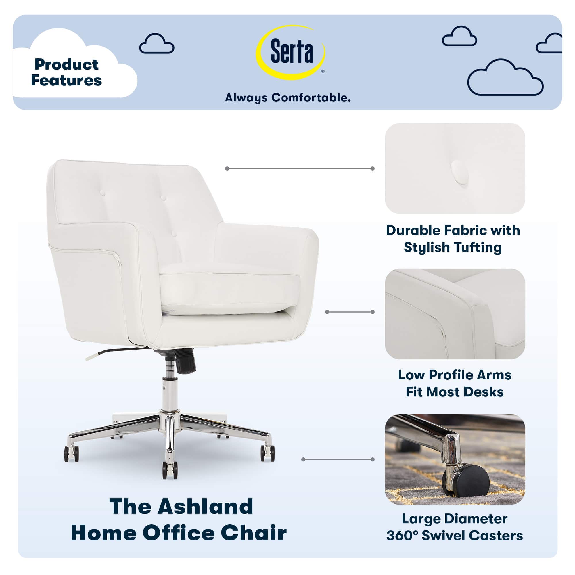 Take your home office up a notch with the Serta Ashland Home Office Desk Chair. Great for stylized home office spaces or entertainment rooms, this trendy chair combines chic modern design with enhanced comfort features. The memory foam cushions in the seat and arms keep you comfortable and supported during work or play. A chrome-finished stand offers 360-degree swiveling and height control, so you can adjust the chair to fit any space. The Serta Ashland Ergonomic Home Office Chair comes in a variety of colors in bonded leather or fabric to upgrade the look and comfort of your home, office, or entertainment space.