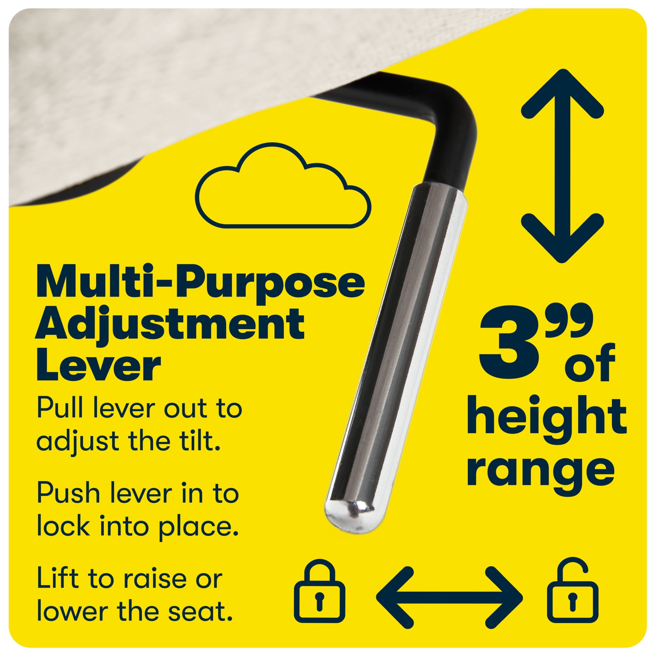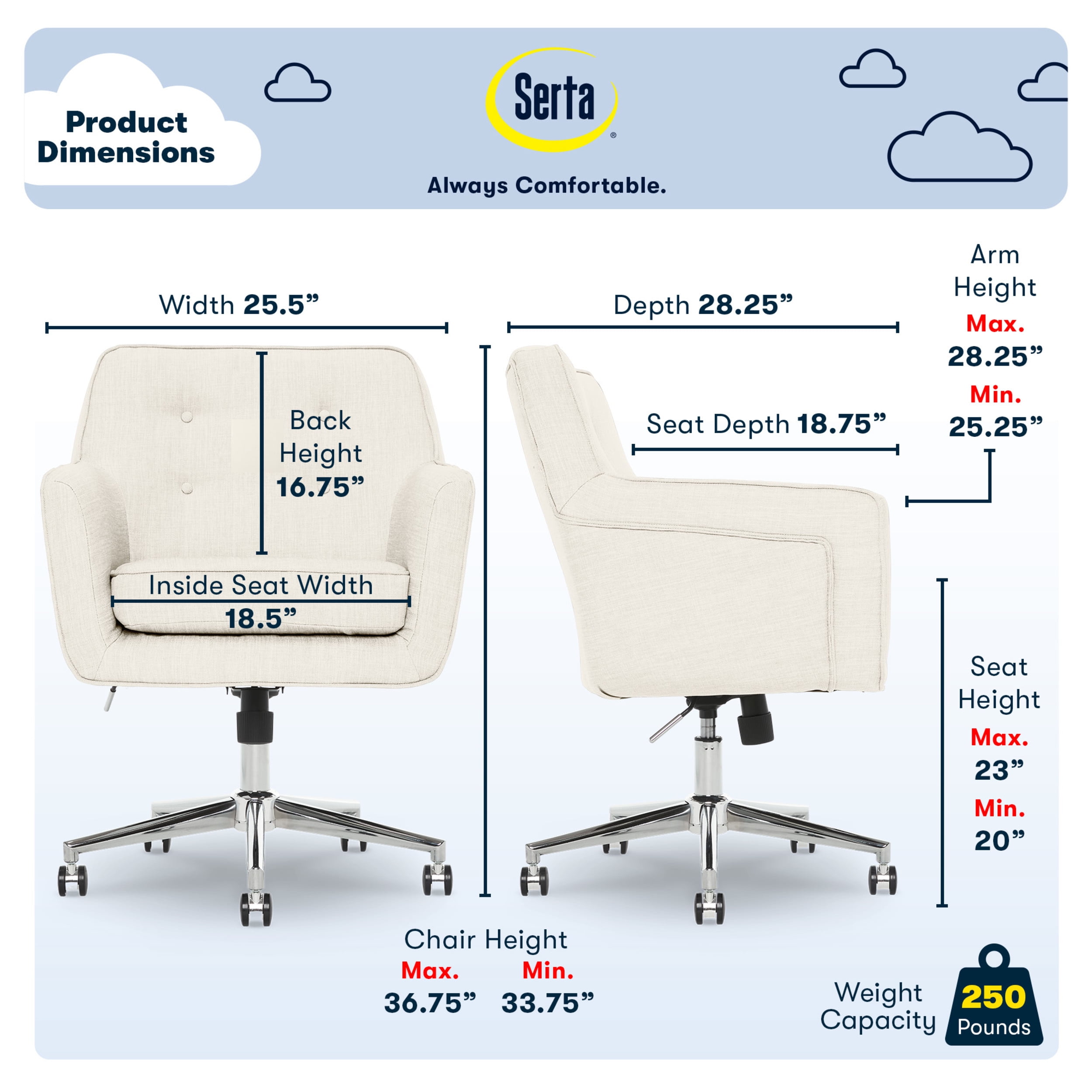 CHIC & TRENDY STYLE: Combines the elegance of a mid-century modern accent chair with the ergonomic design of an office chair. The classy button-tufted mid-back and low-profile arms sit atop a sleek, chrome finish base. Available in durable twill woven fabric or bonded leather in 11 colorful options. COMFORTABLE & VERSATILE: The well-cushioned backrest, memory foam seat cushion, and padded armrests offer a comfy place to perch. Ideal for casual use rather than long hours of sitting. Can be used as a vanity chair in the bedroom, or a teacher chair in the classroom. SERTA FOAM & CERTIFICATION: All Serta chairs use quality, non-recycled, non-toxic foam, exceed minimum industry testing standards, and are certified by the American Chiropractors Association. FUNCTIONAL & DURABLE: Stainless steel base supports up to 275 lbs and rolls on 360º dual castor wheels with seat-side lever for tilt lock and height adjustment. EASY ASSEMBLY: Simple and quick assembly with hardware kit included. Estimated time of 15 minutes. Weight Capacity: 250 lbs. Dimensions: 25.5W x 28.25D x 33.75H in Assembly Instructions
