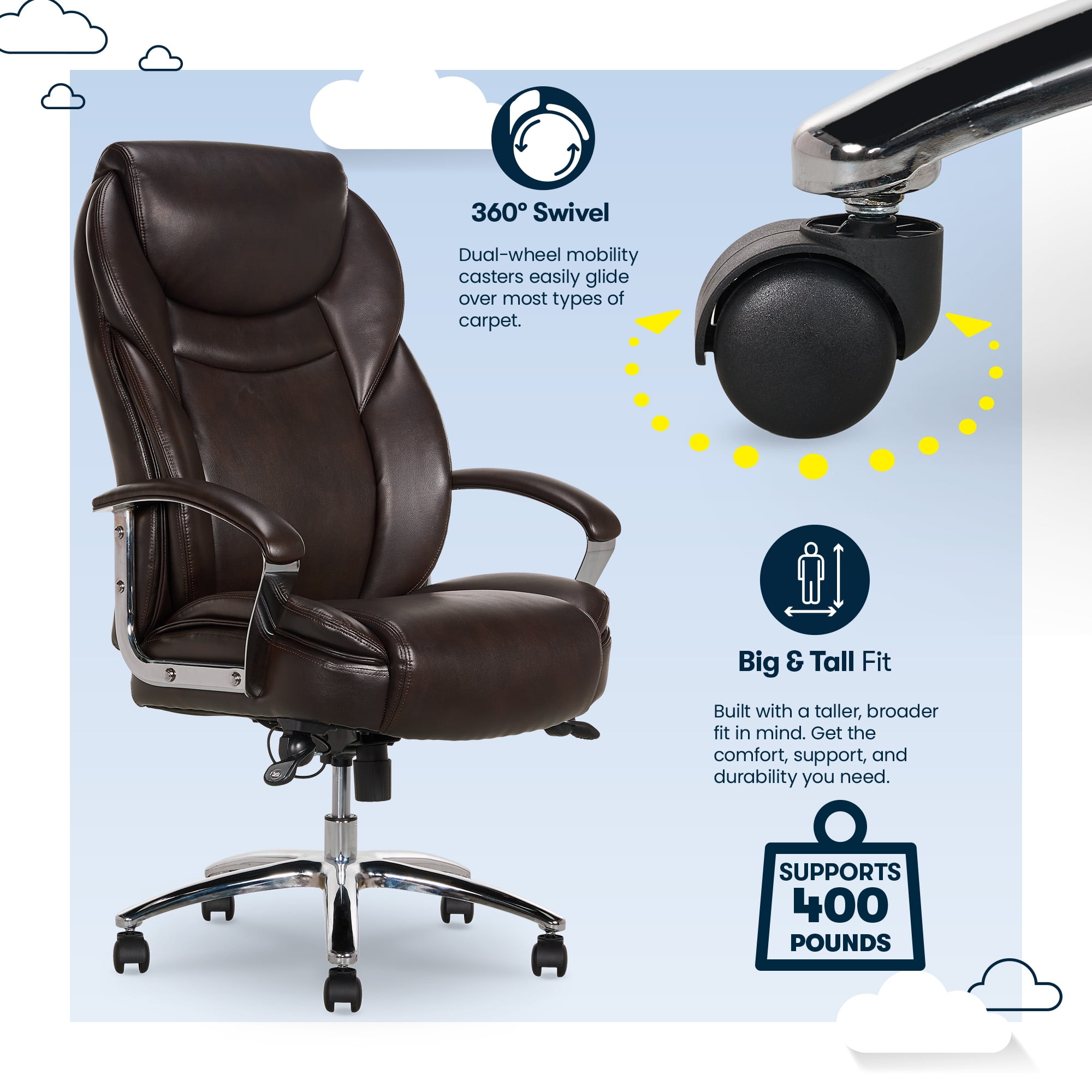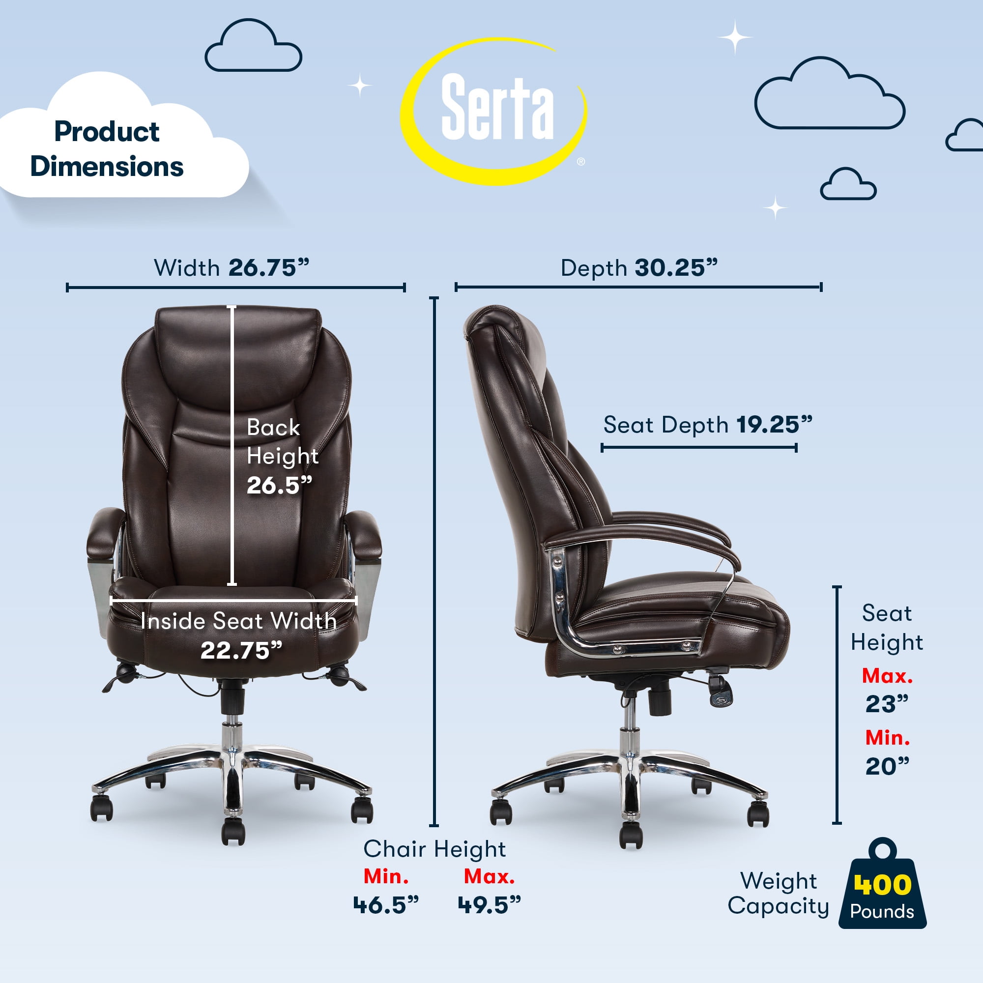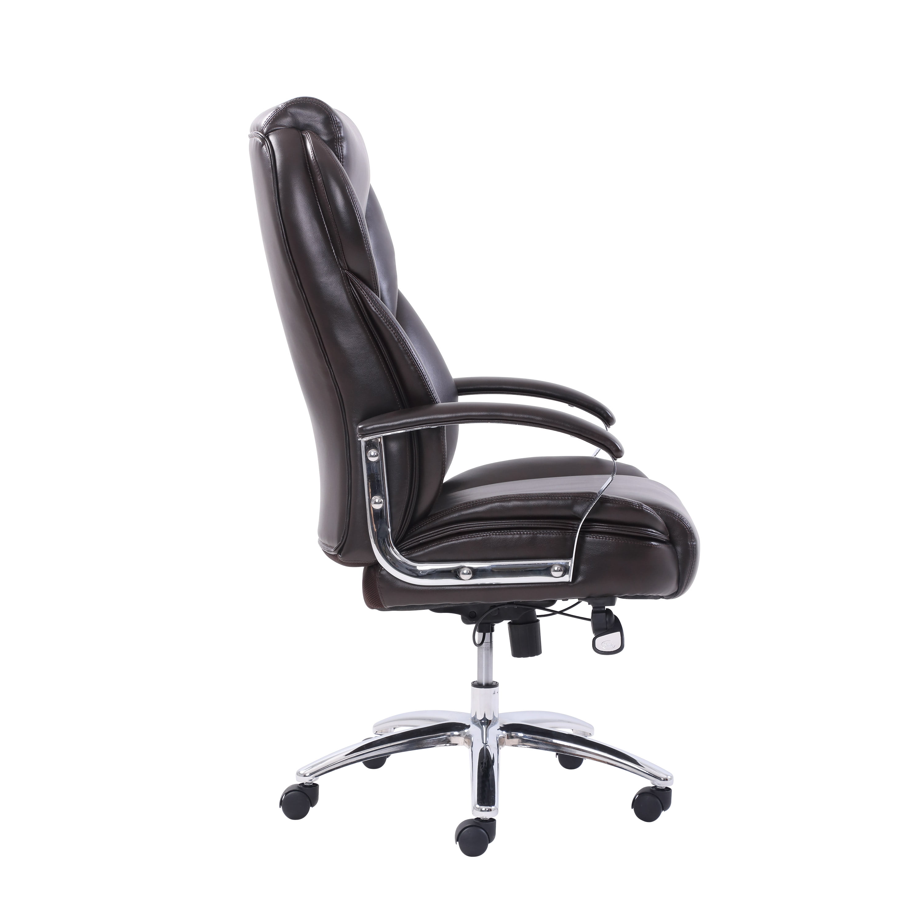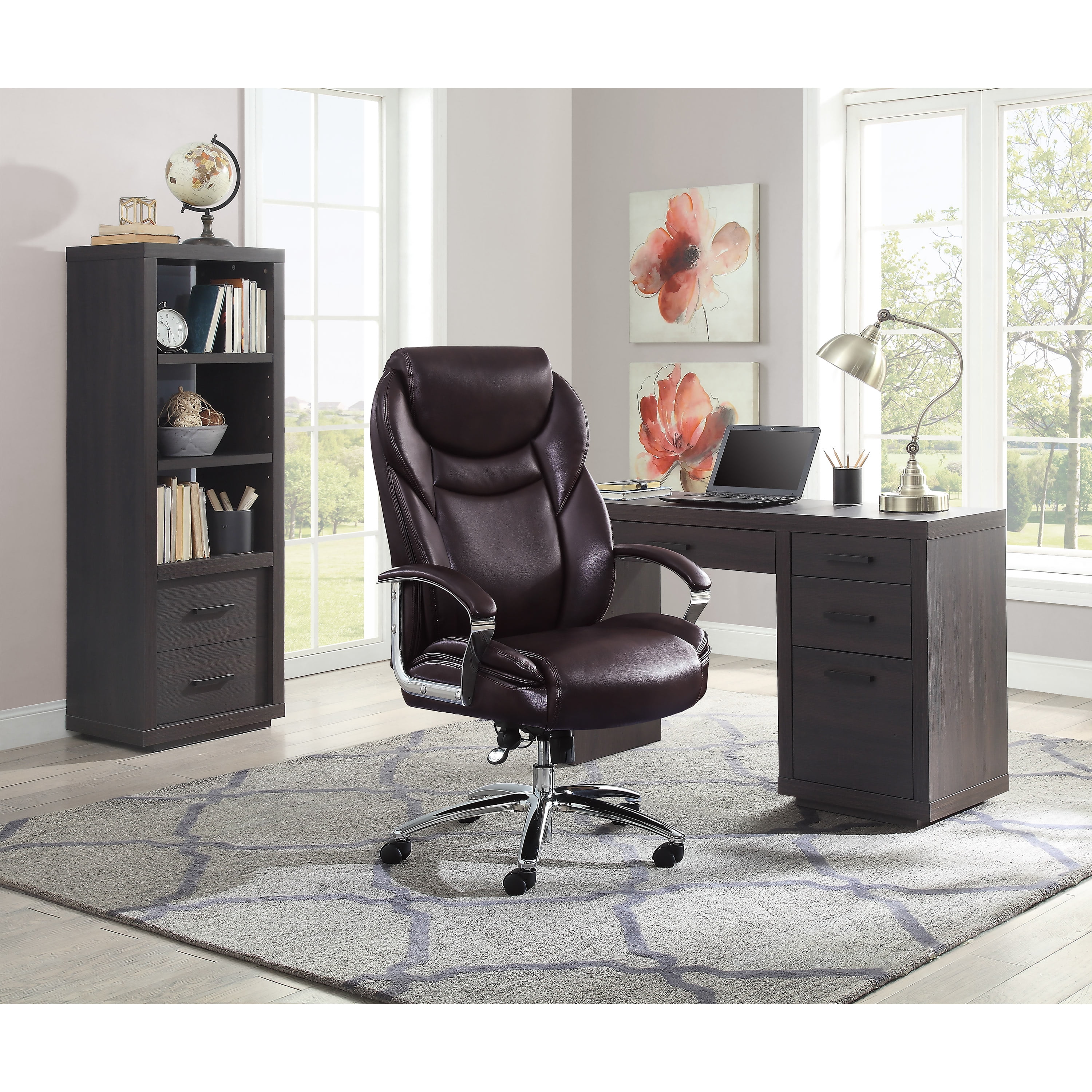 Style and comfort go hand-in-hand with this amazing desk chair Made with individual coils and high density memory foam for extra support Supportive headrest and lumbar zones allow you to have all day comfort while doing computer work or gaming Stylish and ergonomically positioned chrome arms with soft padded arm rests for ultimate comfort while working Seat-side paddle for adjustable seat height Features tilt and tension controls Generously padded, soft body pillows for the seat and back make this executive style chair extremely comfortable Beautiful, rich bonded brown leather upholstery Durable chrome base with dual wheel casters 5 Caster wheels make rolling smooth and easy Perfect for any room in the house Complements most any decor Commercial quality for users up to 400 lbs 3D interactive assembly guide available through free BILT app (Download from the app store or Google Play) Dimensions: 26.5in W x 28.5in D x 39.25in – 42.25in H (67.31cm W x 72.39cm D x 99.69cm – 107.31cm H) Model #: 49734DS