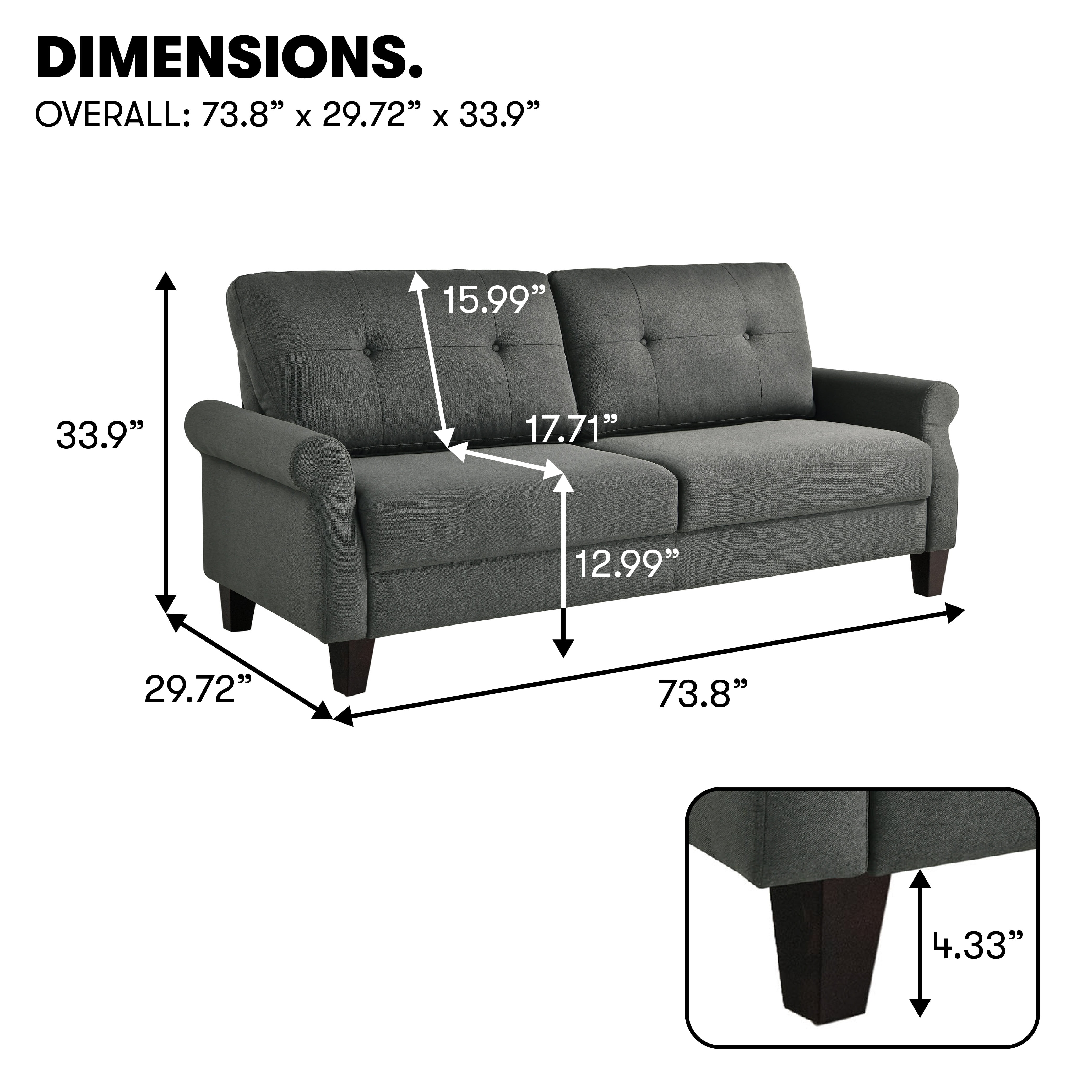 Classic Rolled Arms: Experience timeless comfort with elegantly rolled arms that add a classic touch to the sofa. These arms not only enhance the aesthetics but also provide a cozy and inviting feel Sophisticated Button Tufting: Elevate the sophistication of your living space with button tufting on the back cushions. This meticulous detailing adds a touch of luxury, creating a visually appealing focal point Premium Comfort Technology: Enjoy superior comfort and support with the combination of high-density foams and Dream Coils. This ensures a plush seating experience that retains its resilience over time. Durable Wooden Legs: Enhance the durability and style of the sofa with sturdy wooden legs. The natural finish adds a warm and inviting element to the design while providing a solid foundation. Effortless Assembly: Enjoy convenience with a design that prioritizes easy assembly. The sofa is crafted for straightforward setup, allowing you to quickly and effortlessly integrate it into your living space.
