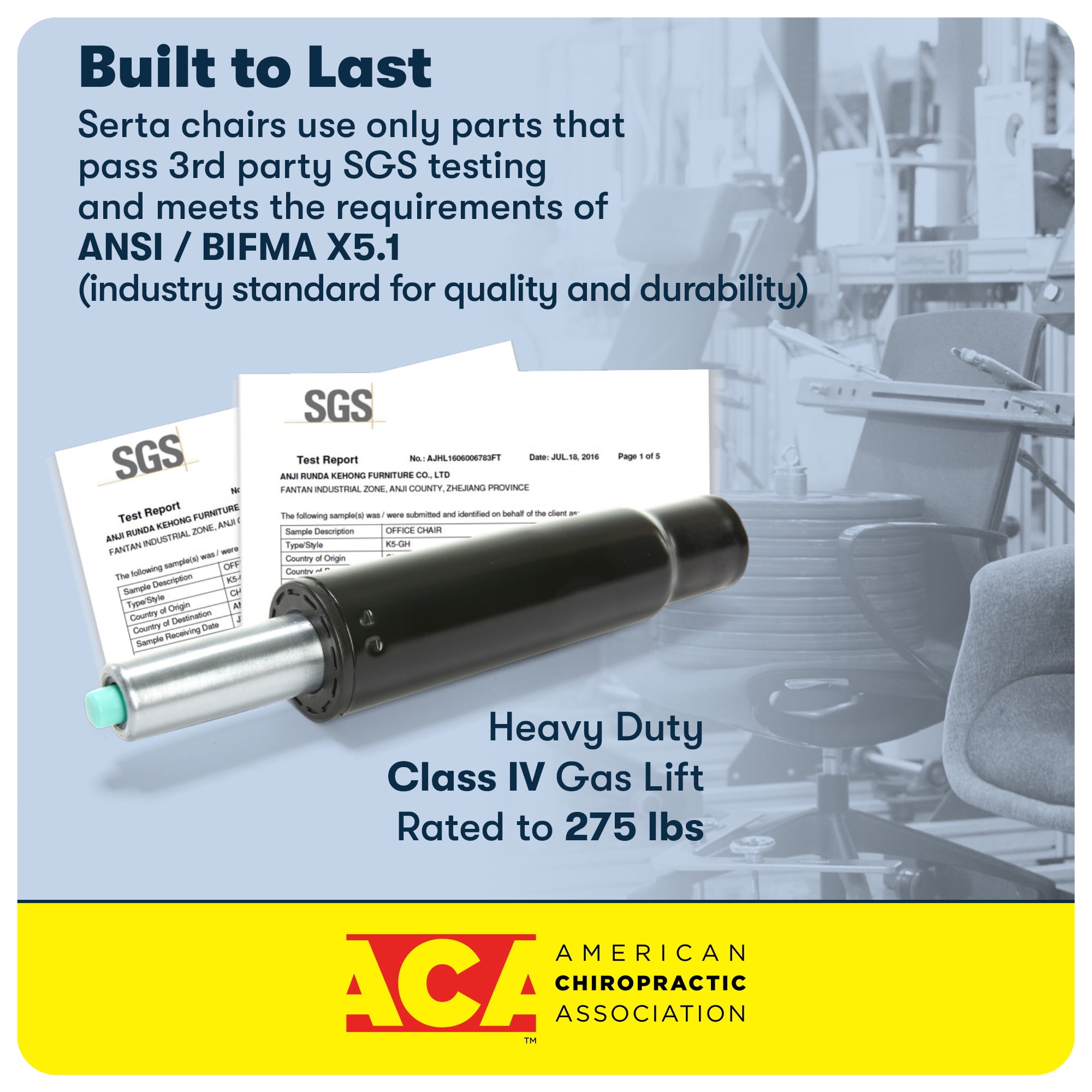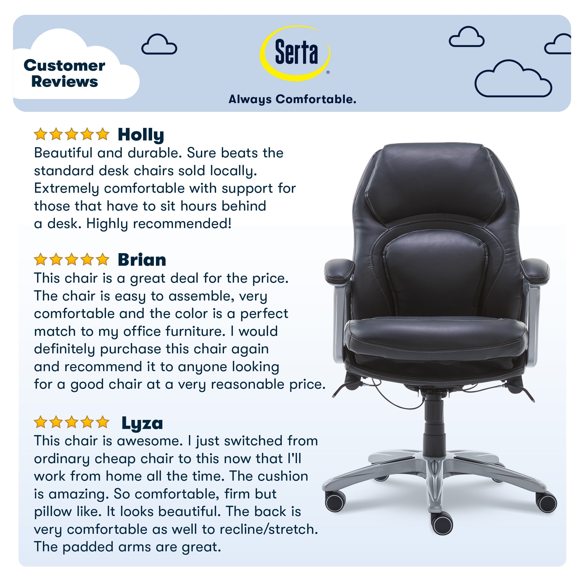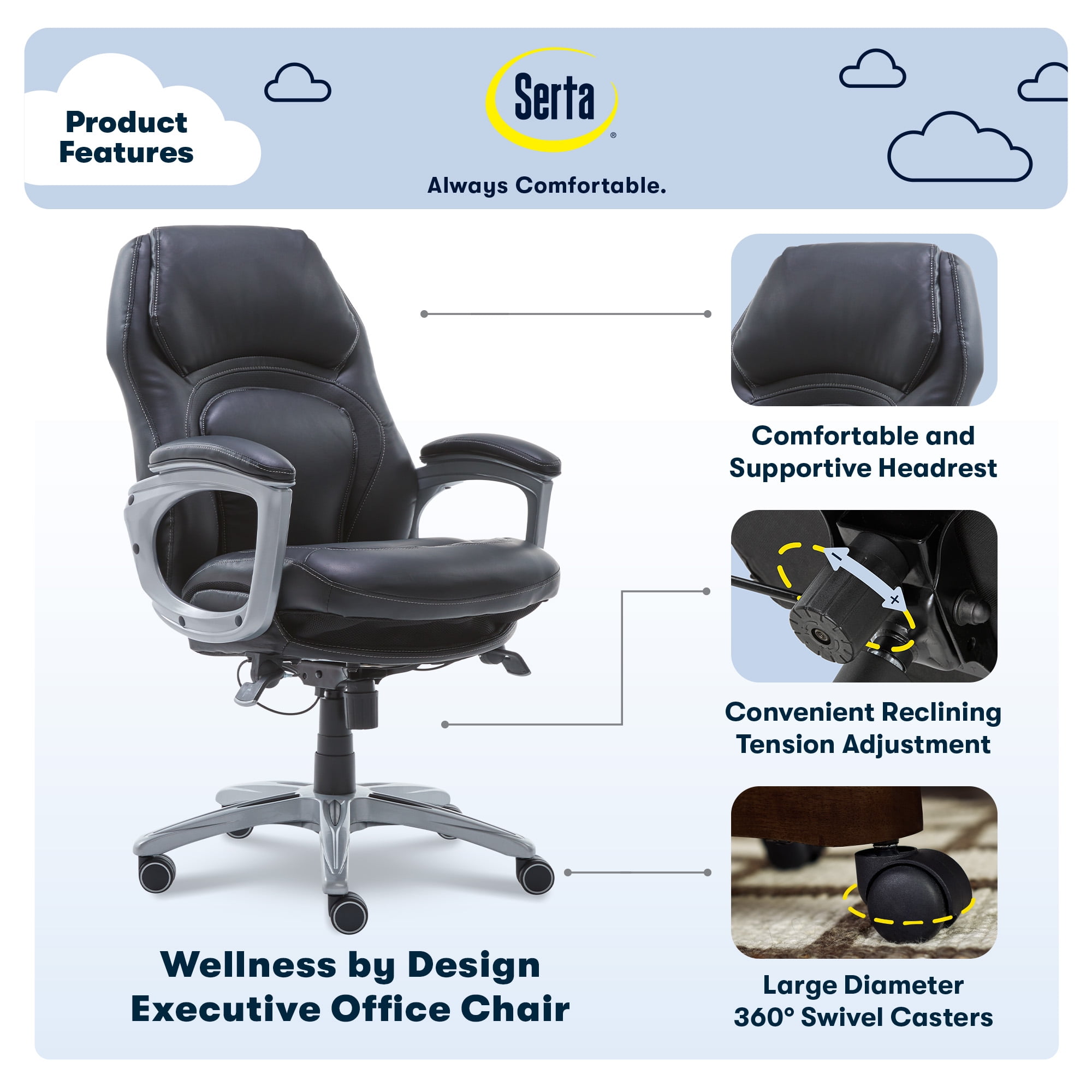 Keep your back happy at the office by using the Serta Back in Motion Health & Wellness Eco-friendly Bonded Leather Executive Office Chair – Smooth Black. This super comfortable chair features a heavy-duty base in an iridescent silver finish and is upholstered in eco-friendly, smooth black bonded leather. Its deep, ergo layered body pillows feature breathable perforated zones ideal for sitting for long periods of time. An active lumbar pivots with your movements providing continuous lumbar support throughout the day. Ergonomically positioned seat-side cable actuated levers control the pneumatic lift and lock out features. Its hand sculpted iridescent silver painted arms comes with soft padded armrests for exceptional hand, wrist, and forearm comfort. Some assembly is required.