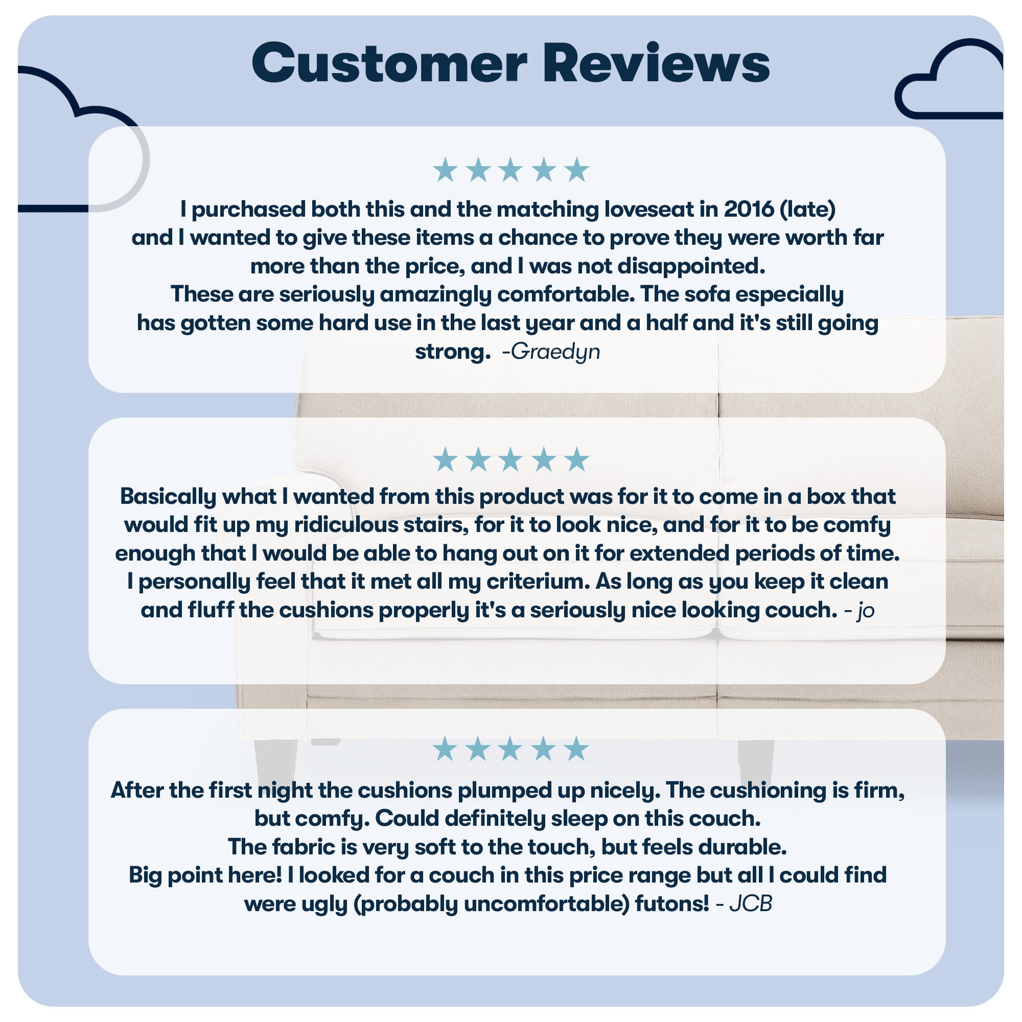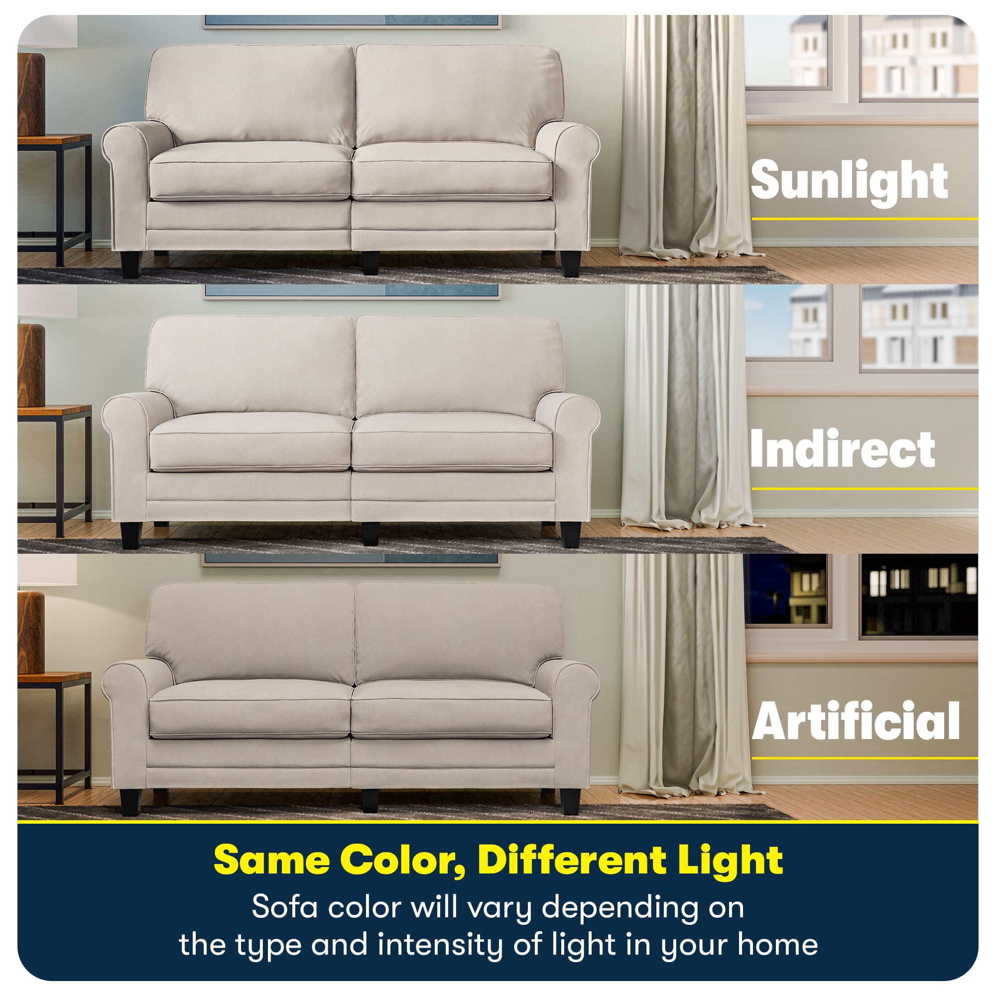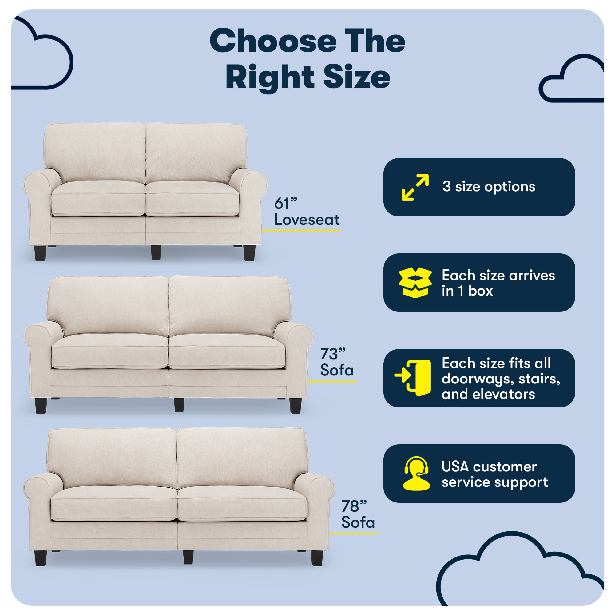 Whether you’re furnishing your first home or seeking a space-saving solution for your existing space, Serta delivers. Our conveniently packaged sofas arrive directly at your door in one carton, and they provide the perfect blend of style and comfort you’ve come to expect from Serta. Don’t let living in a modestly sized apartment, or being on a managed budget, be the limiting factors to creating a welcoming home. The Serta Copenhagen collection is designed specifically for smaller living spaces, offering 61″, 73″ and 78″ length options. With a seat depth of 20.5″ you can still relax comfortably without the sofa taking up too much space. However, this means the sofa’s proportions are better-suited for users under 6 feet tall. The unopened box will fit any doorway, hall, stairwell, or elevator. Once in your home, it will thrive in smaller living rooms or home offices, but is a versatile choice for dorms, kid’s rooms, den, and family rooms. Plus, its low-profile will make any smaller space feel open and airy, giving the freedom to mix and match with other furniture pieces. This inviting sofa features clean lines and rolled arms for a timeless look. Upholstered in an anti-pilling polyester fabric or durable bonded leather, the Copenhagen is easy to care for and spills are simple to clean. 13 color options are available to complement your décor. Please note that the actual color may differ slightly from what appears online depending on the amount of light and the positioning of the sofa in any space. Soft pillow backs, generously filled with soft fibers, rest against a backrest with structured webbing to keep things comfortable and supportive. The seat cushions are filled with high-density, non-recycled Serta quality foam, which cover individually wrapped pocket coils for a supportive core and semi-plush sit. Welcome the Serta Copenhagen Sofa into your home for modern style and comfort with space-saving functionality. Lounging or relaxing has never been so convenient. Features: SPACE-SAVING DESIGN: Its compact size and low-profile (61″ wide x 33″ deep x 36″ high) make this two-seater couch a great choice for smaller apartments or lofts, living rooms, or home offices. Fits all doorways, halls, stairs or elevators. Better-suited for users under 6ft tall. MODERN CLASSIC: Combines traditional and minimalist design with rolled arms for a sleek and modern look. Upholstered in a no-pill polyester fabric or smooth bonded leather with piped edges for a tailored finish in 13 color options. Easy to clean and maintain. SIT BACK & RELAX: The loose pillow backs are generously filled with soft fibers and supported by structured webbing within the backrest for comfort and support. The pocket coil seat cushions filled with high-density foam provide a semi-plush sit and have removable covers for effortless cleaning. SERTA FOAM & BUILD: Made of a solid wood frame fitted with sinuous springs for extra support and sturdy solid wood legs that can handle up to 450 lbs. All Serta sofas use quality, non-recycled foam for breathability and safety. EASY ASSEMBLY: Simple and quick assembly with hardware kit included. We offer USA Customer Support.