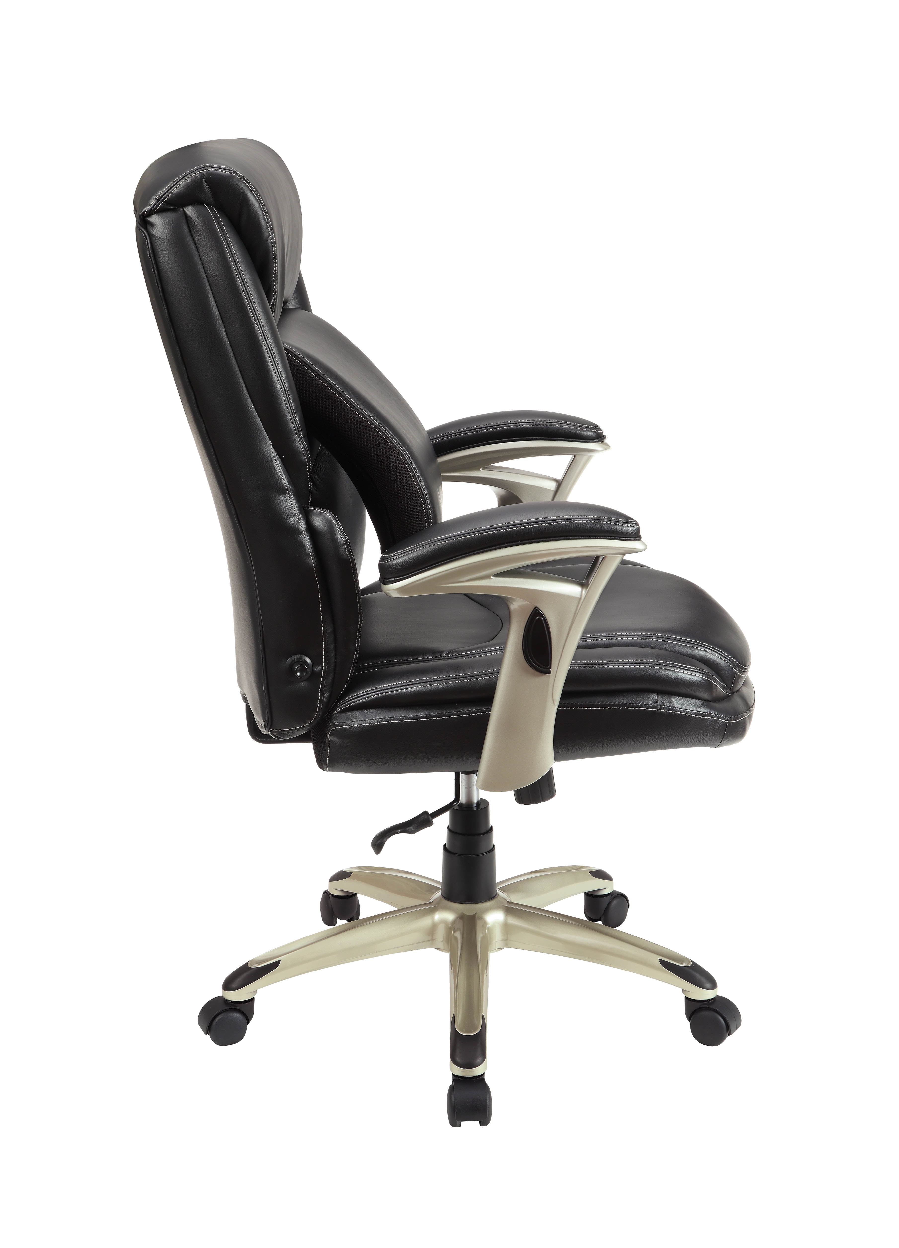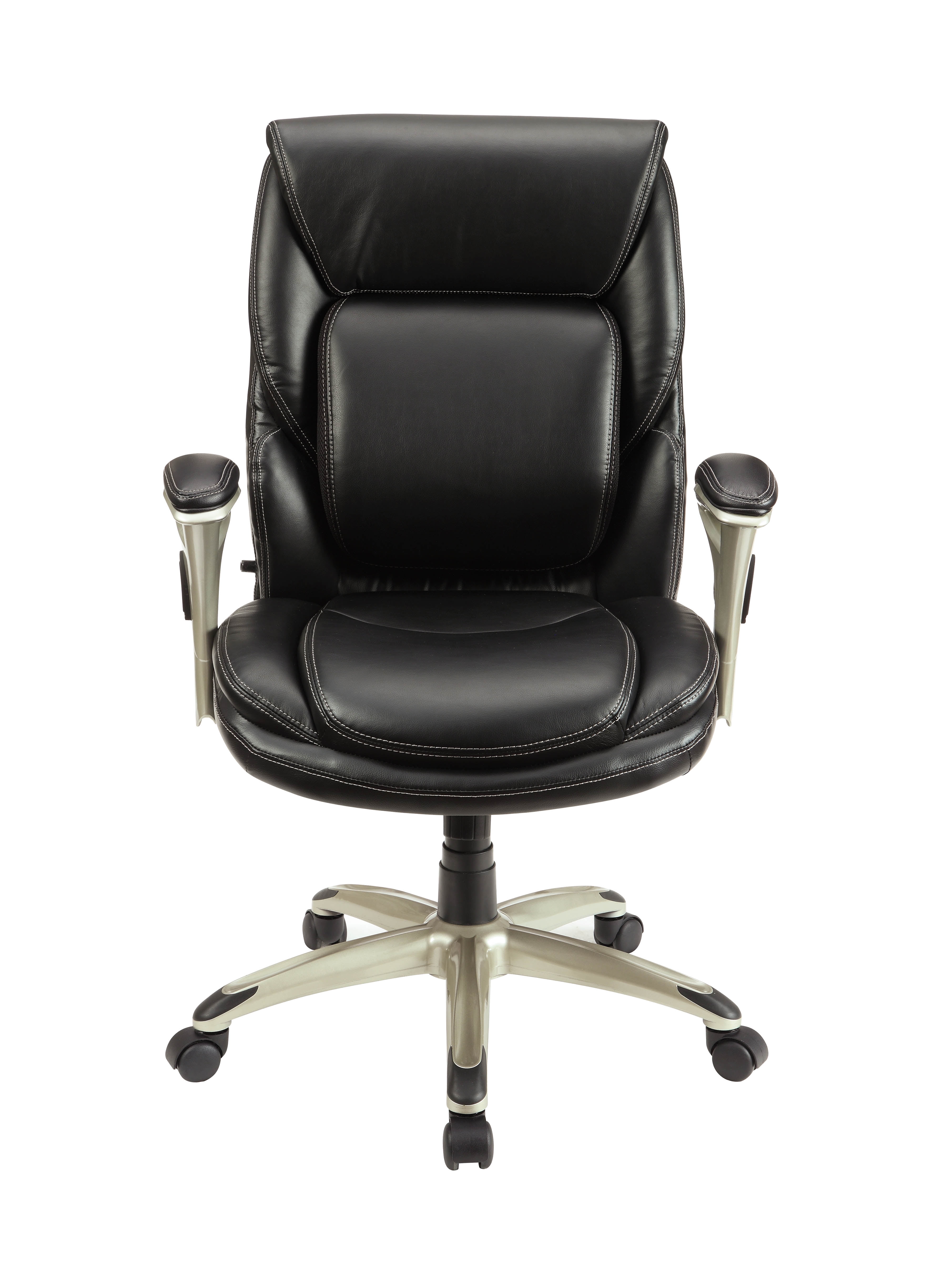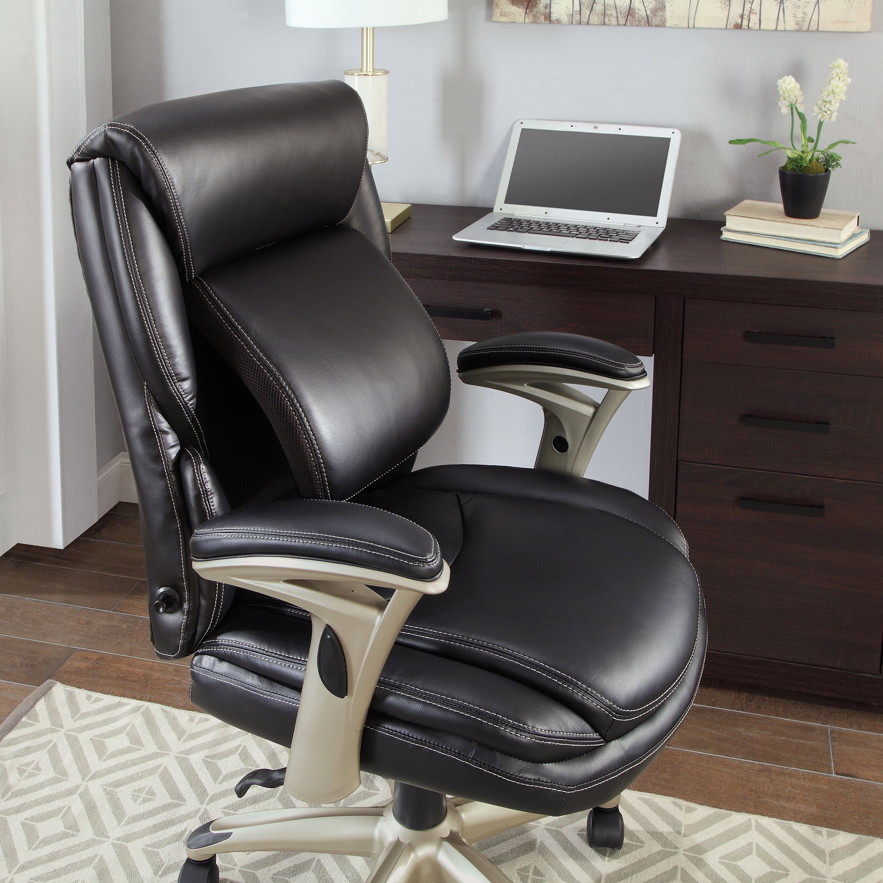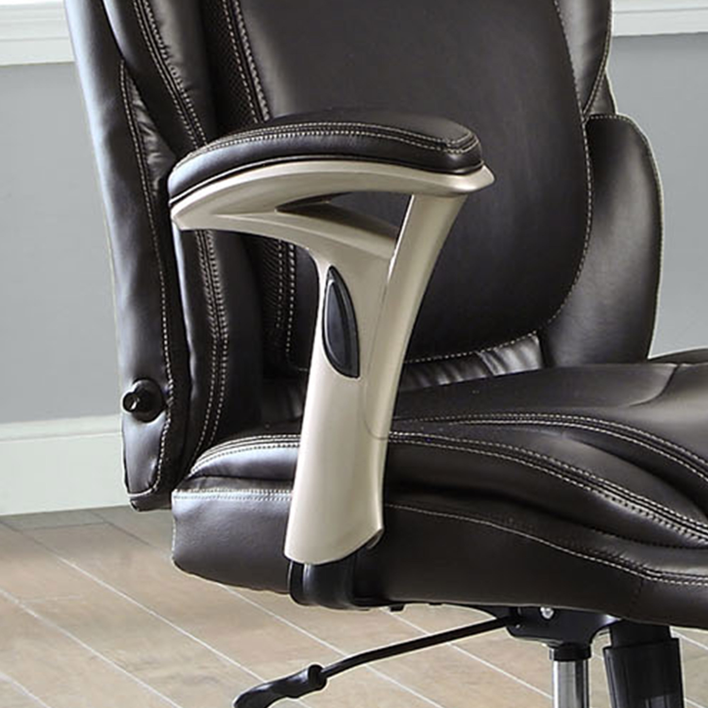 Serta Executive Manager Chair with Adjustable Lumbar Support and Comfort Coils, Black Ideal for a computer desk, gaming table, or office area Adjustable Infinity Lumbar Zone for personalized support Elevated headrest promotes neck and upper-back relaxation Pneumatic gas lift with tilt tension and lockout adjustment Push-button arm height control for easy adjustments Black bonded leather upholstery for a sleek look Deep, supportive seat with Comfort Coils for enhanced comfort 5 wheels for smooth rolling and swivel action Minimal assembly required Supports up to 275 LB