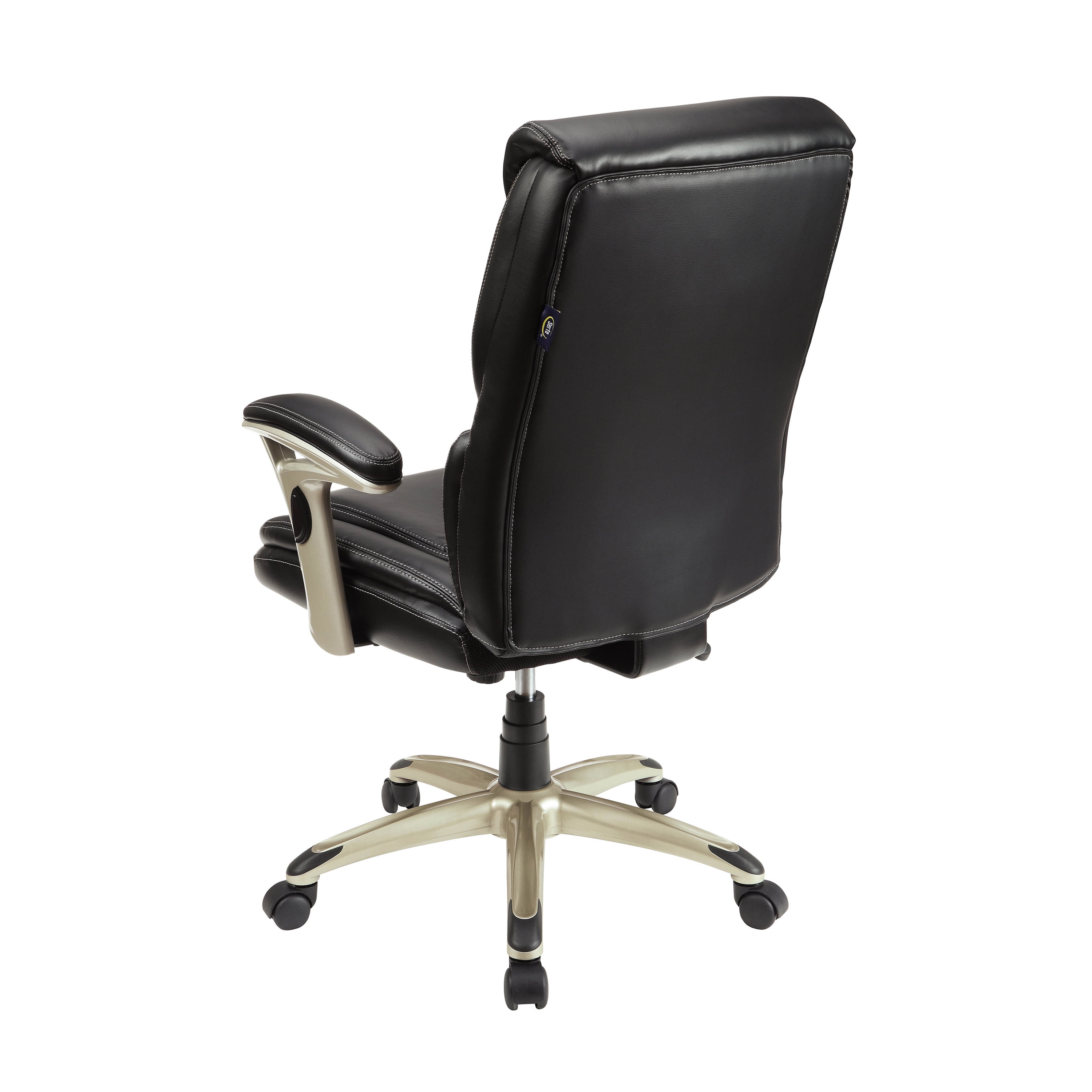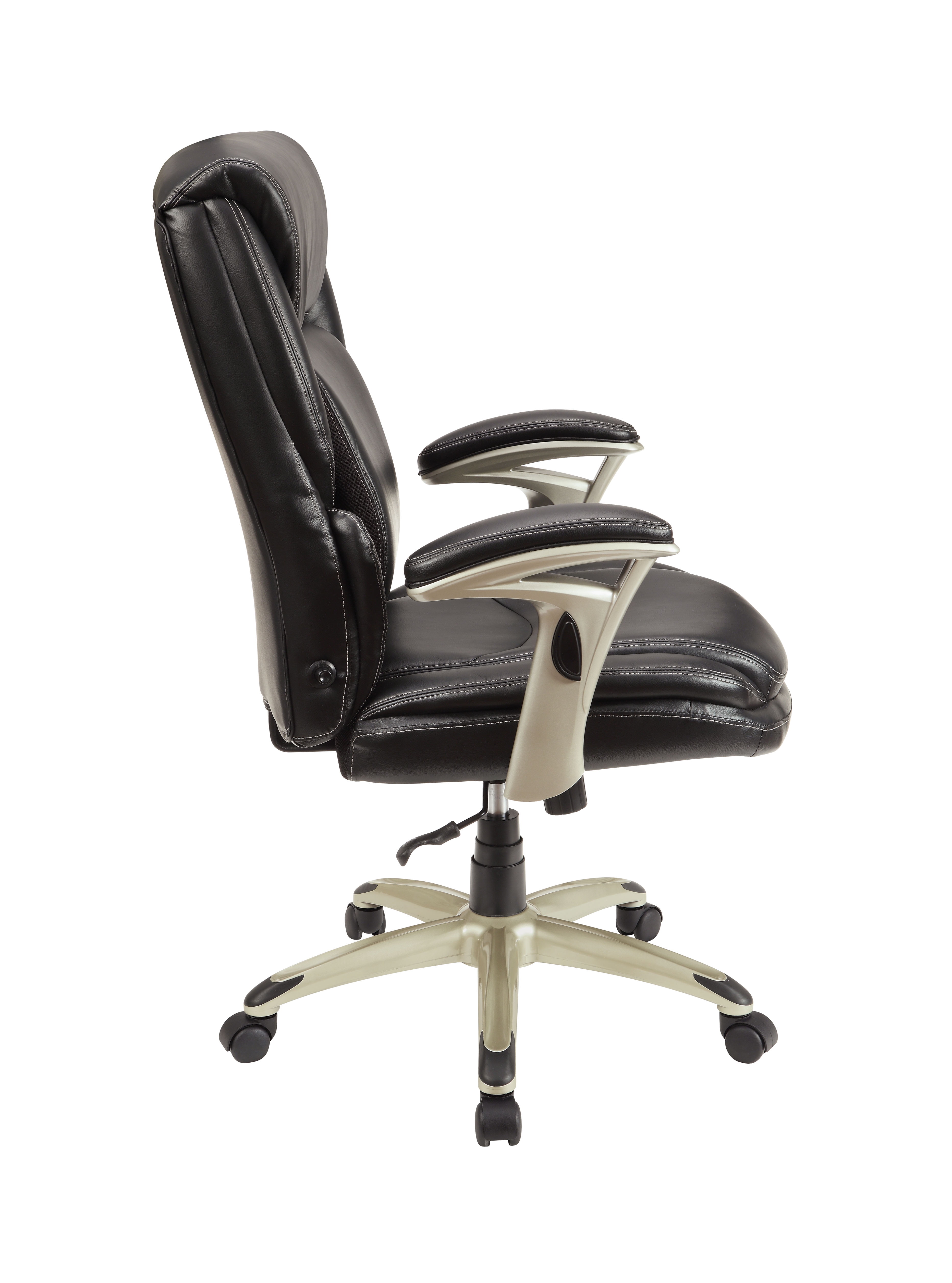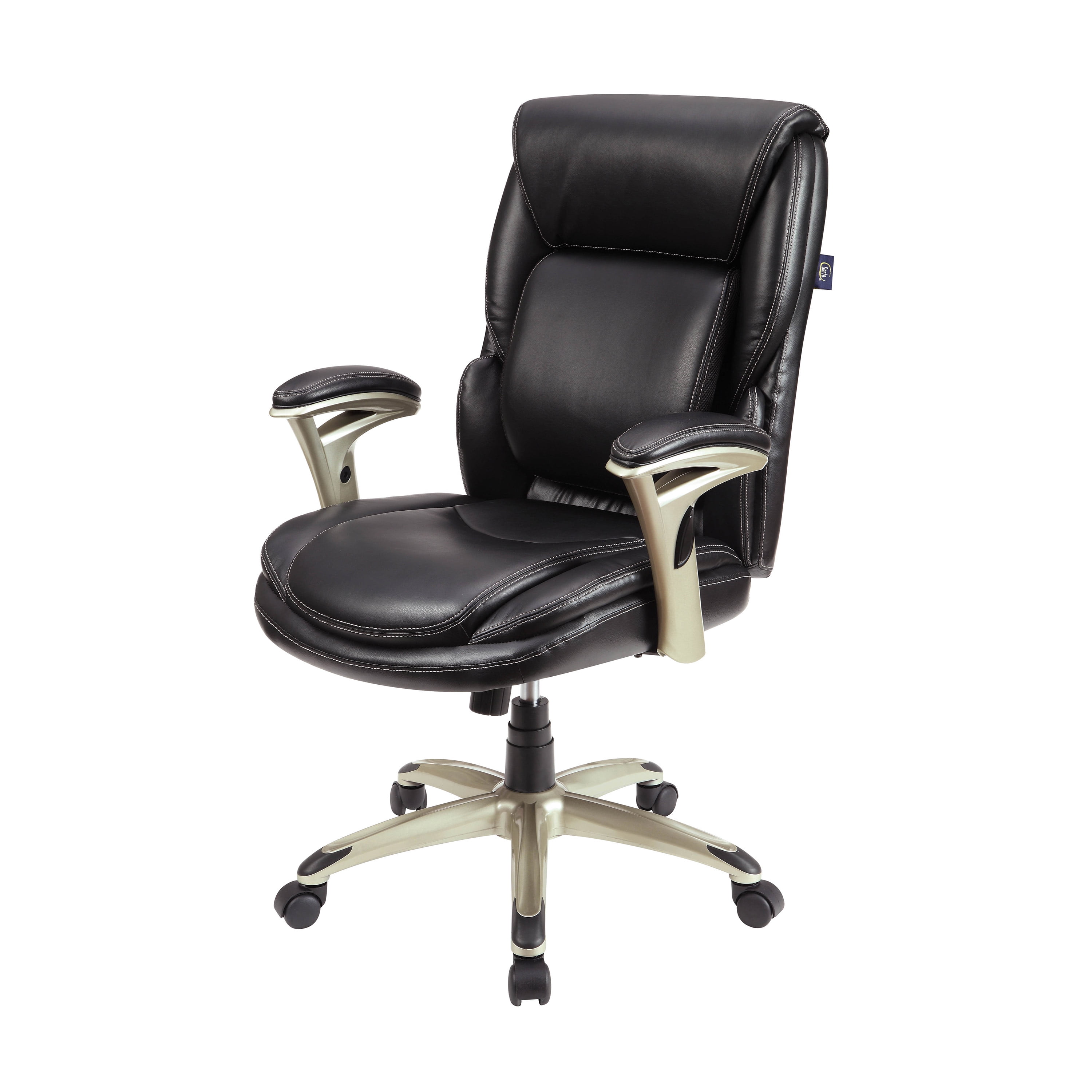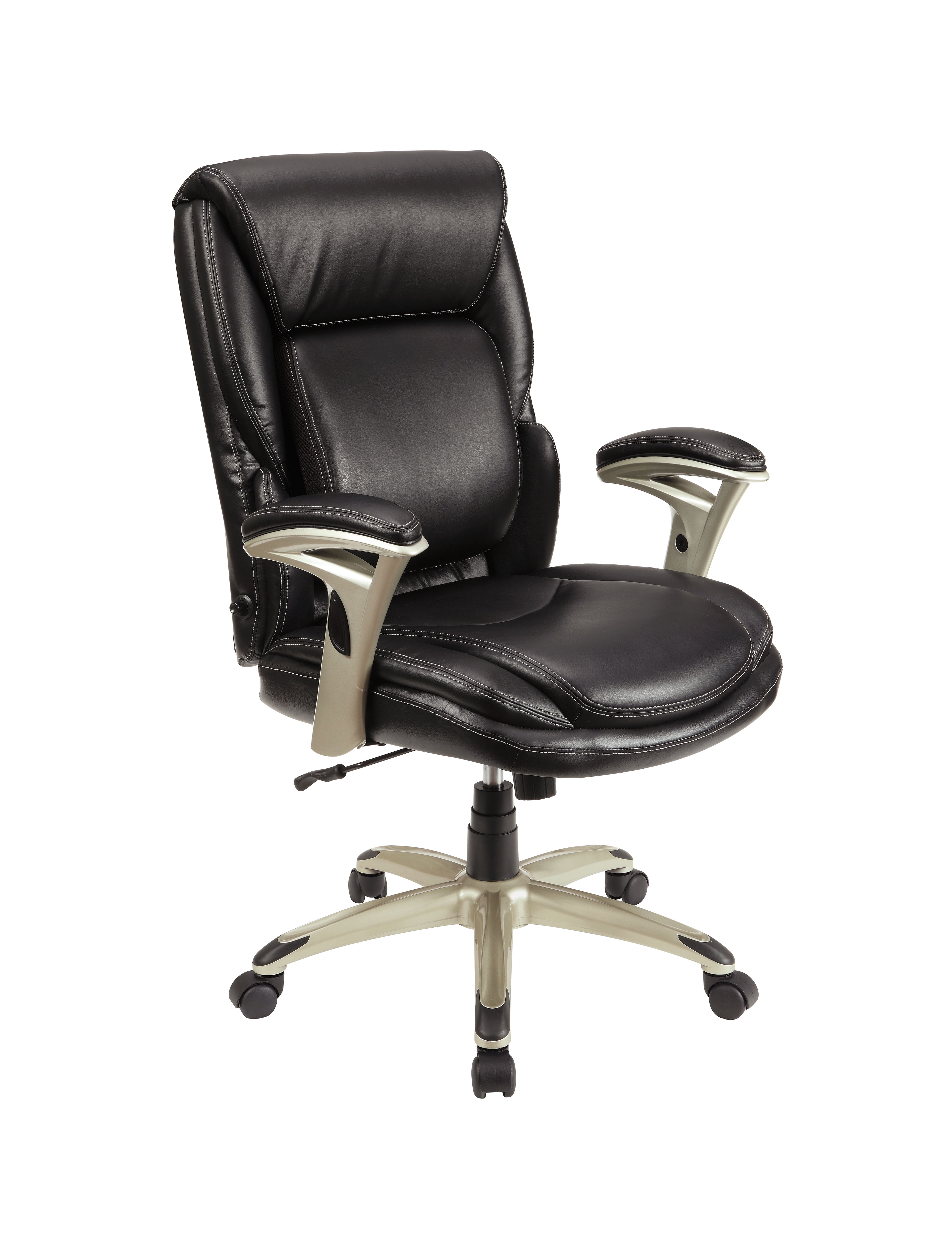 Serta Executive Manager Chair with Adjustable Lumbar Support and Comfort Coils, Black Ideal for a computer desk, gaming table, or office area Adjustable Infinity Lumbar Zone for personalized support Elevated headrest promotes neck and upper-back relaxation Pneumatic gas lift with tilt tension and lockout adjustment Push-button arm height control for easy adjustments Black bonded leather upholstery for a sleek look Deep, supportive seat with Comfort Coils for enhanced comfort 5 wheels for smooth rolling and swivel action Minimal assembly required Supports up to 275 LB