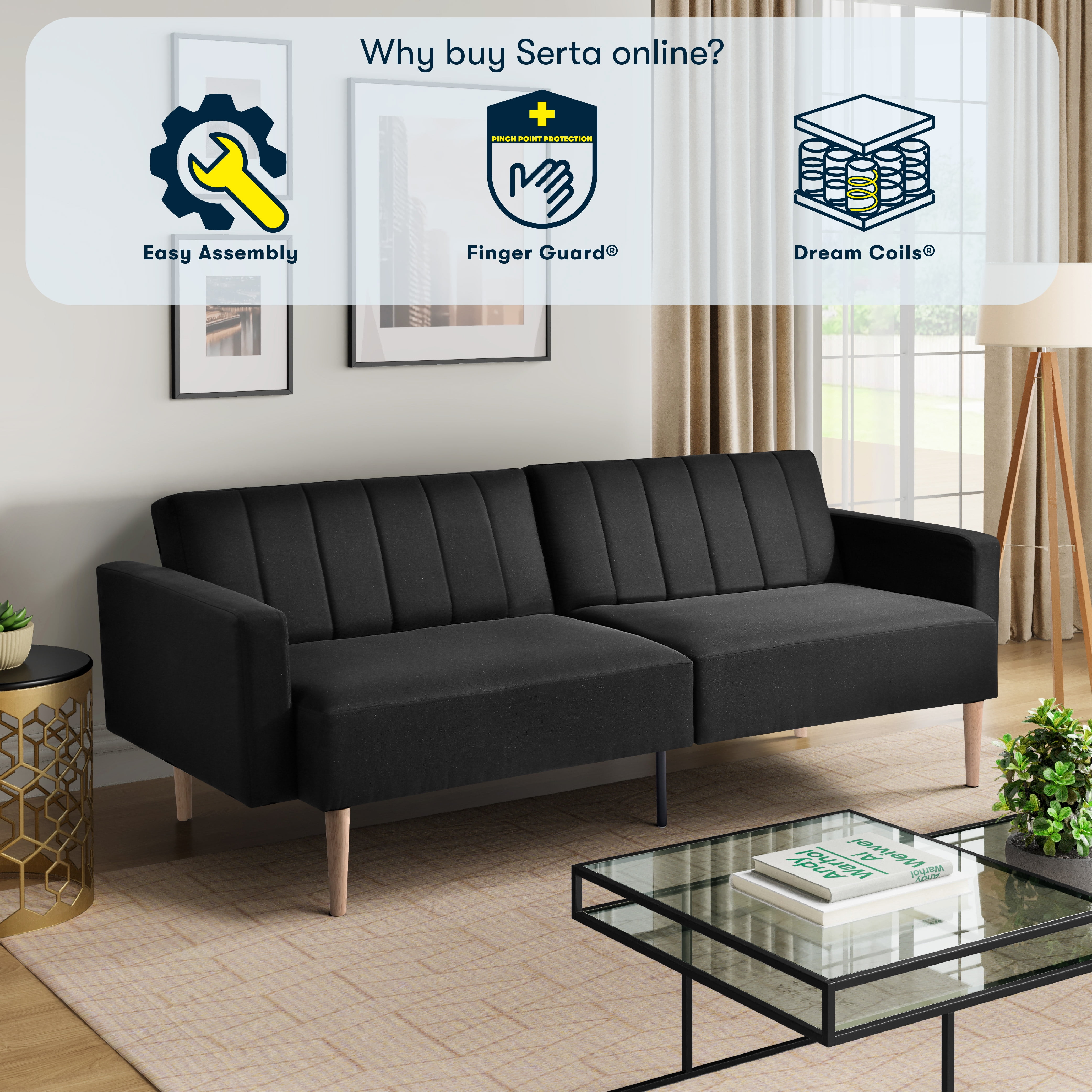 Introducing the Serta Foxtrot – where style meets versatility! This Convertible Sofa effortlessly transforms into a bed, offering the perfect blend of functionality and comfort. With its sleek vertical channel tufting on the back, a plush seat featuring high-density foam and dream coils, and sturdy natural wooden legs supported by a central metal leg, the Foxtrot ensures both style and stability. Experience the revolution of simple assembly, making it a seamless addition to your living space. Upgrade your home with the Serta Foxtrot for a contemporary sofa that adapts to your lifestyle.